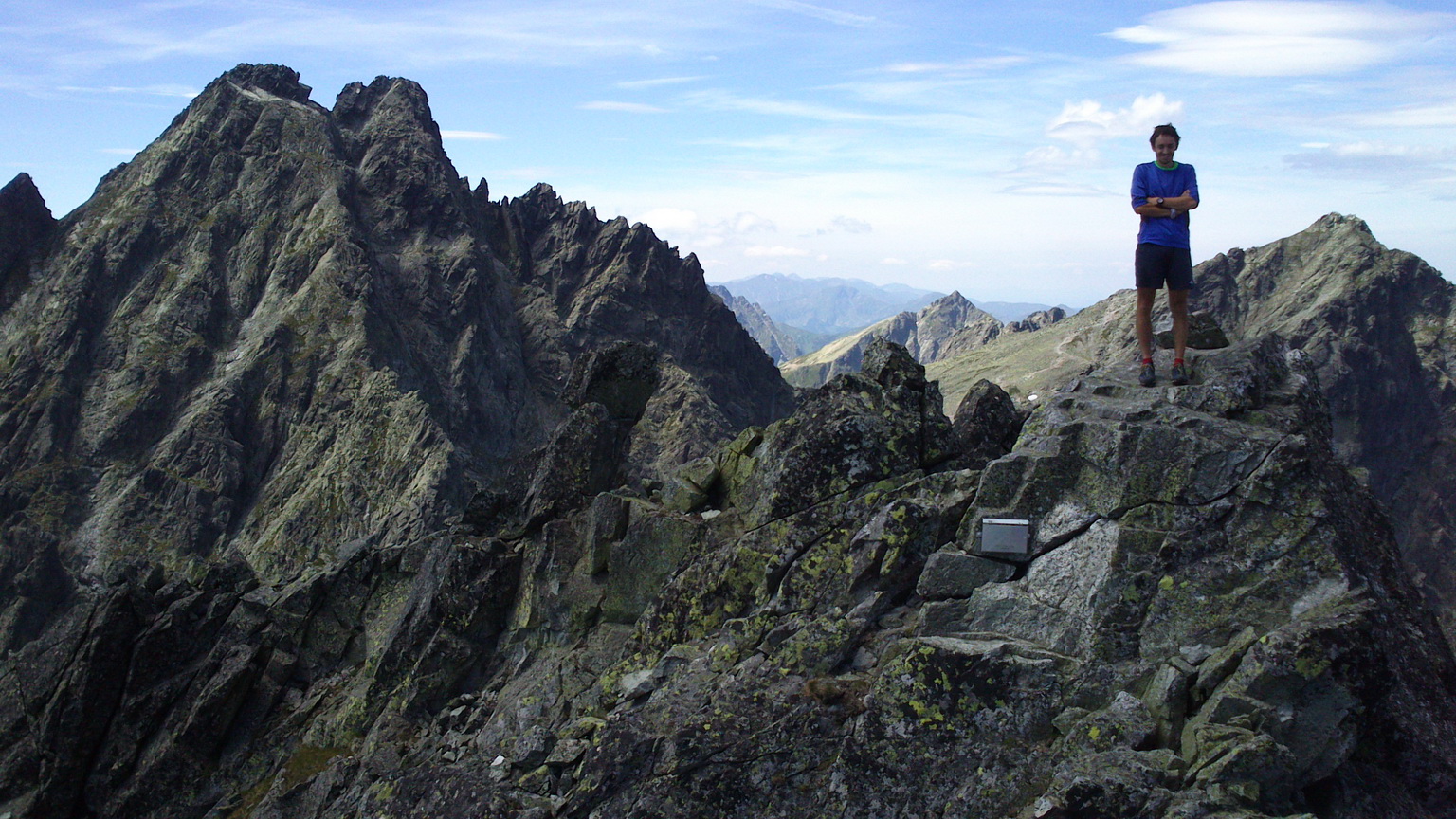 V Rumanovej dolinke, pri výšlape na Ganek ma chytila ozajstná kríza, pamätám si, že som zaspal asi na 20 minút sediac pod balvanom v žlabe. Prebral som sa a pokračoval ďalej na vrchol, kde som o 12:30. Tu stretávam ďalšieho vodcu s klientami a taktiež sa ma vypytuje kde sa tak ponáhľam. Spraví mi fotku, chvíľu pokecáme, popraje mi šťastie a ja zostupujem do Rumanovej doliny.