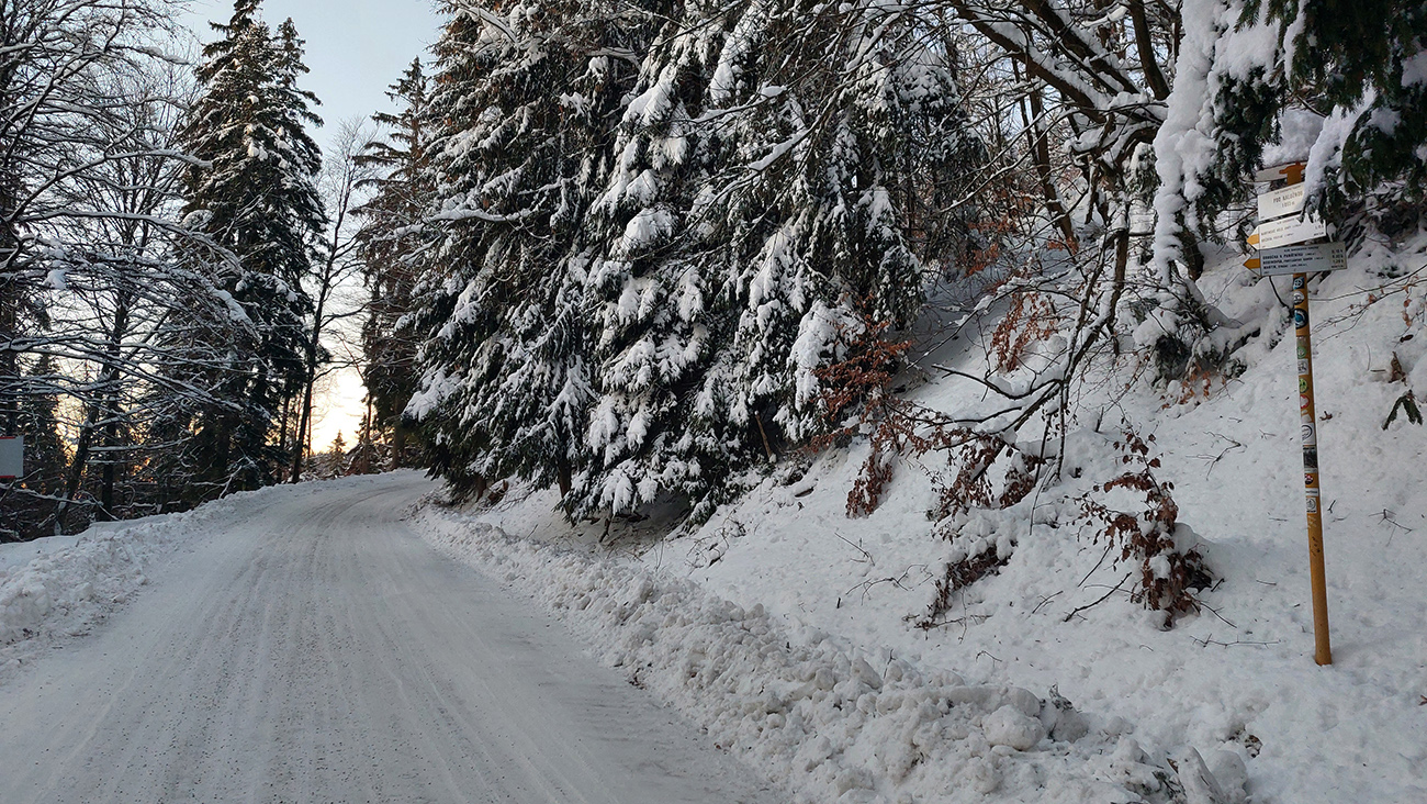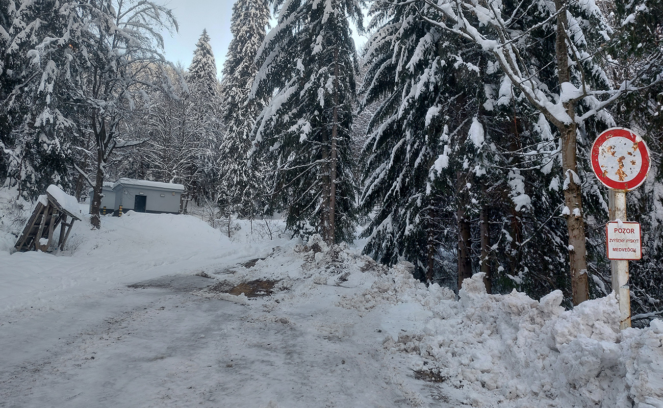 Na Kalužnej cesta poštrkovaná a odhrnutá do šírky, do ľadových hrčatých mantinelov, tak popri nej to veľmi nechutí, našťastie priama stopa cez hrebienok ku sedačke je natiahnutá. Dokonca je na začiatku na výber, či ísť strmšie, či cikcak. Kto sa chystá hore autom, cesta je rovnejšia ako v lete, sneh zakryl výtlky. Vleky ťahajú od soboty 17.12., za výjazd sa vraj odvádza povinný desiatok, ani bez reťazí vás nepustia.