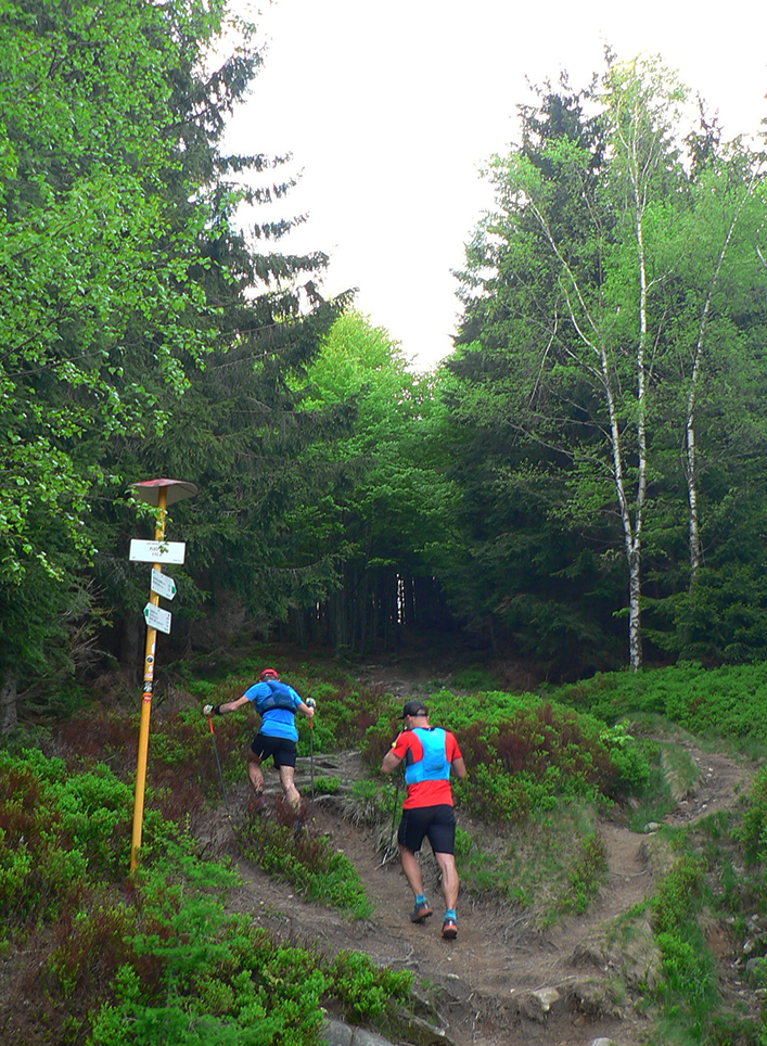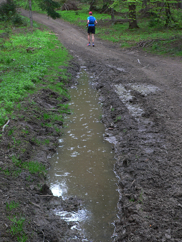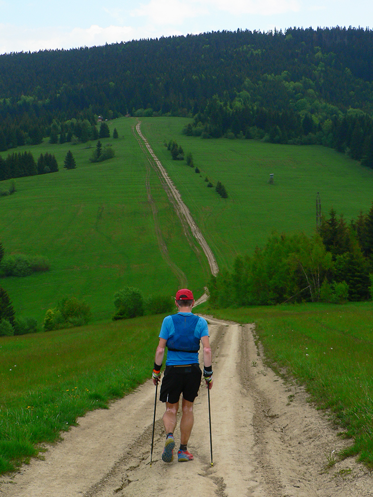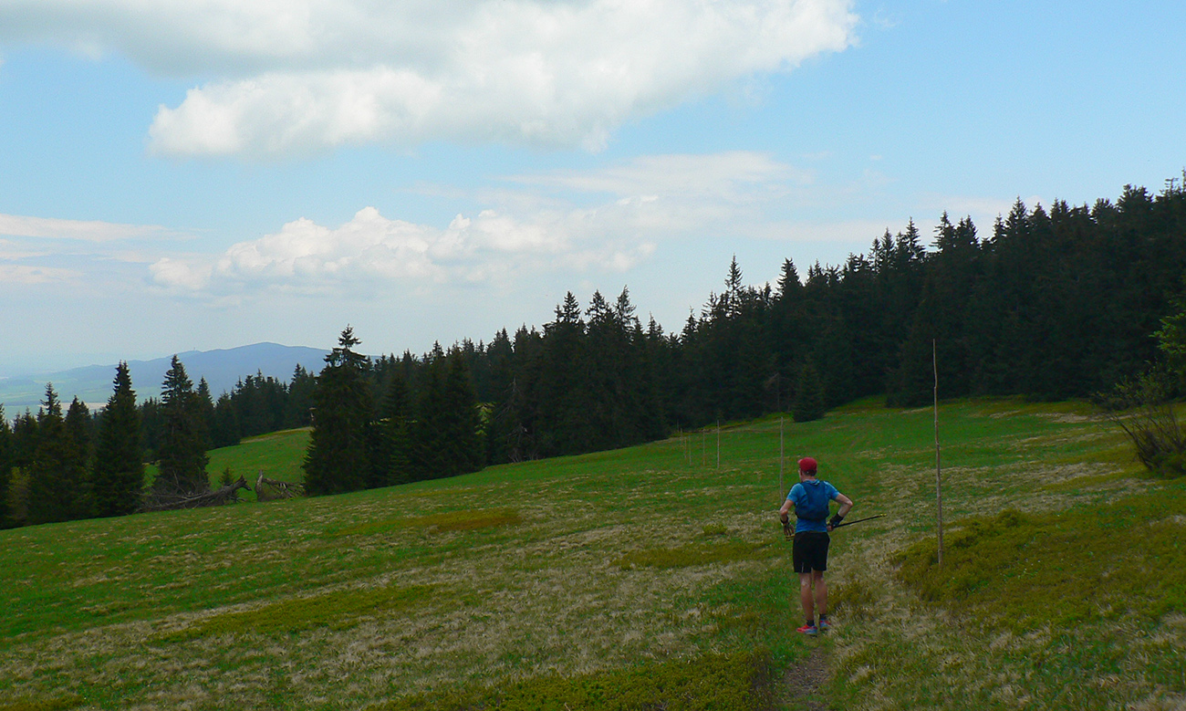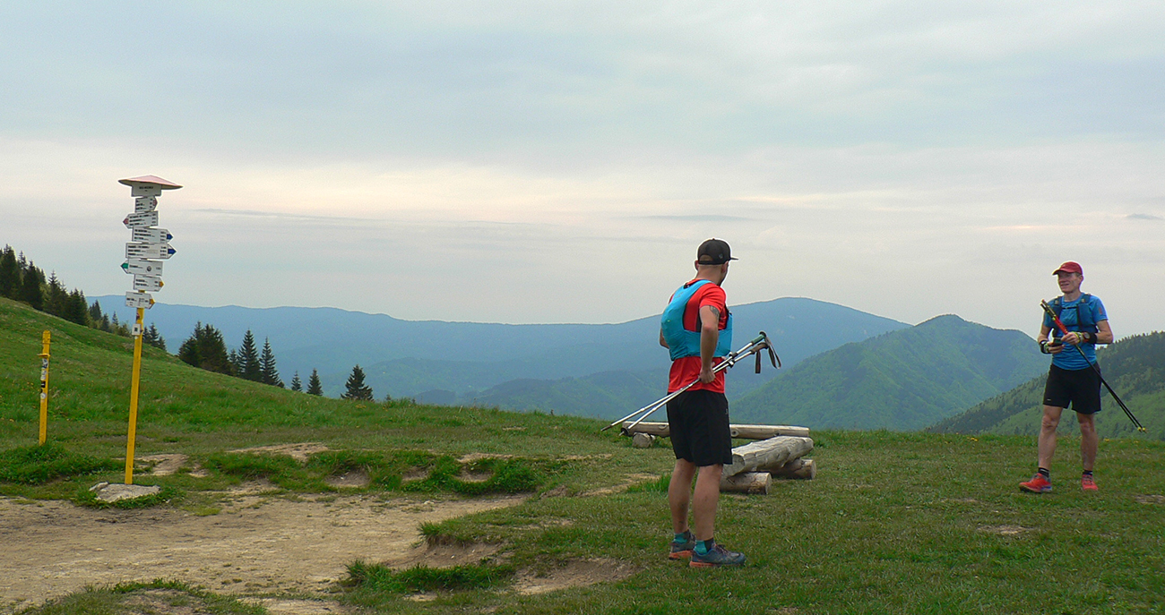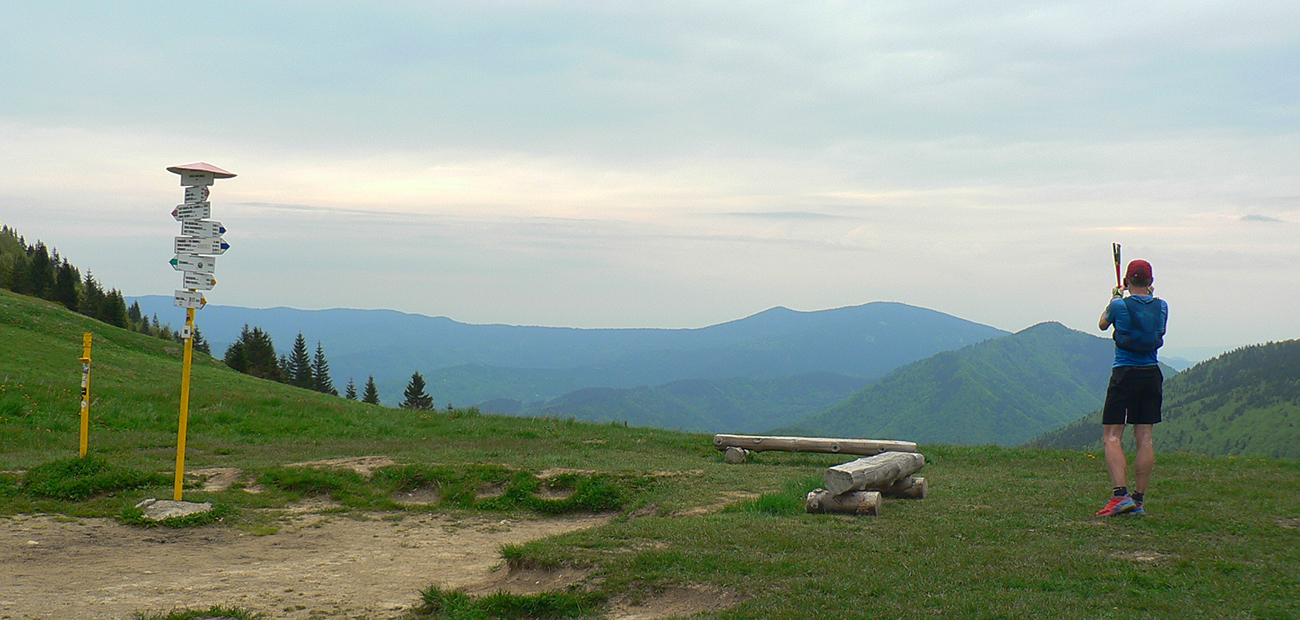Nasleduje tretie väčšie stúpanie na trase (ale zároveň najkratšie), takže scenár sa opakuje – po kofole druhý SPRING, obal rovno do koša a ide sa. Najprv po lúkach, aj panoramatická tabuľa s názvami je tu. Slnko svieti, ale nepečie, nad hlavou neškodné obláčiky, ranné prehánky už odtiahli. No krása. Len ako zalezieme do lesa, pod nohami blato rozmlátených zvážnic. A to až do konca. Medzi Príslopom a vysielačom na Magurke môžu Spartana organizovať a ani sa nenarobia s prekážkami. Je to hnus velebnosti!