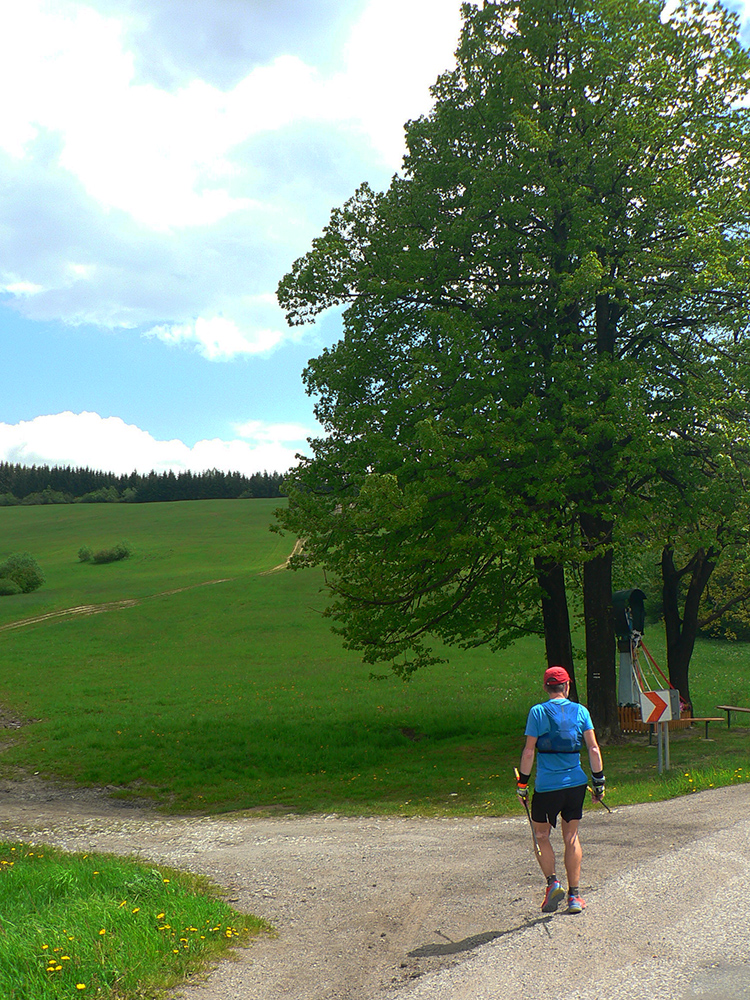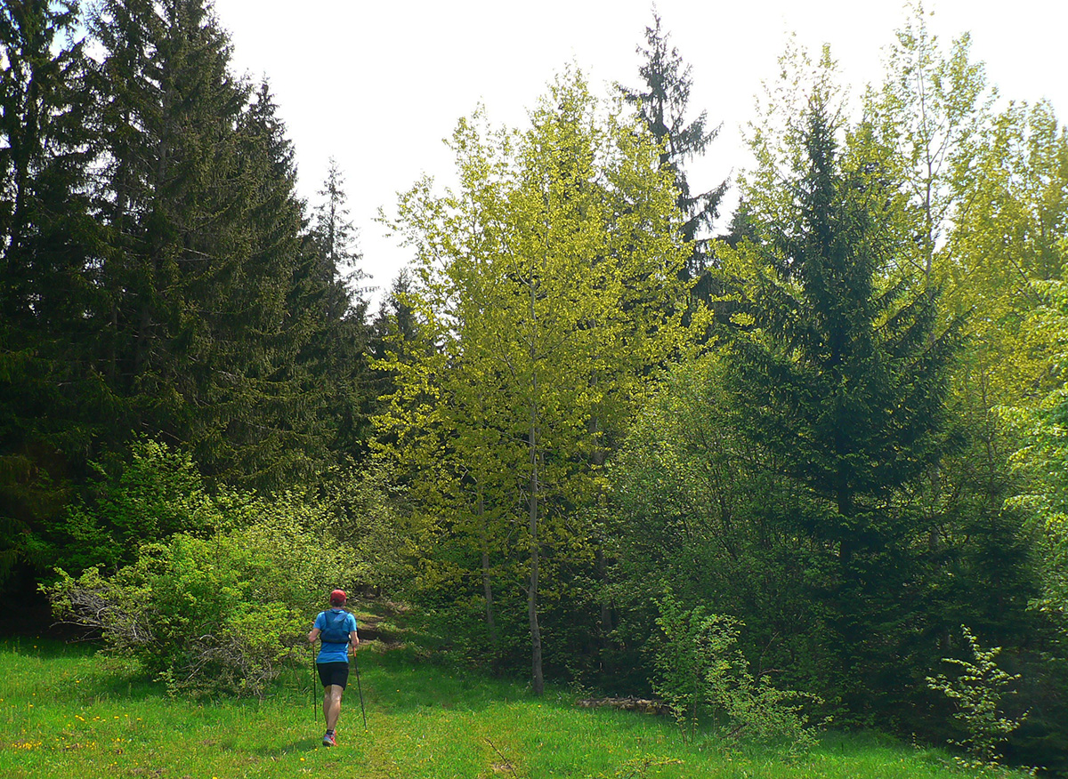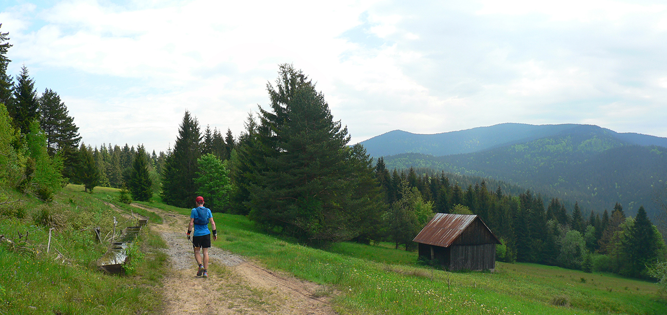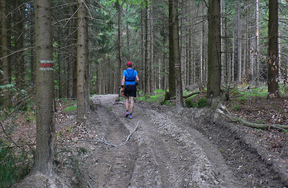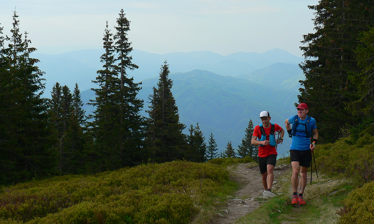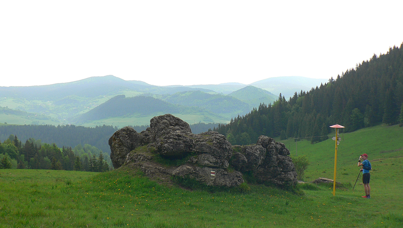 Nasleduje tretie väčšie stúpanie na trase (ale zároveň najkratšie), takže scenár sa opakuje – po kofole druhý SPRING, obal rovno do koša a ide sa. Najprv po lúkach, aj panoramatická tabuľa s názvami je tu. Slnko svieti, ale nepečie, nad hlavou neškodné obláčiky, ranné prehánky už odtiahli. No krása. Len ako zalezieme do lesa, pod nohami blato rozmlátených zvážnic. A to až do konca. Medzi Príslopom a vysielačom na Magurke môžu Spartana organizovať a ani sa nenarobia s prekážkami. Je to hnus velebnosti!