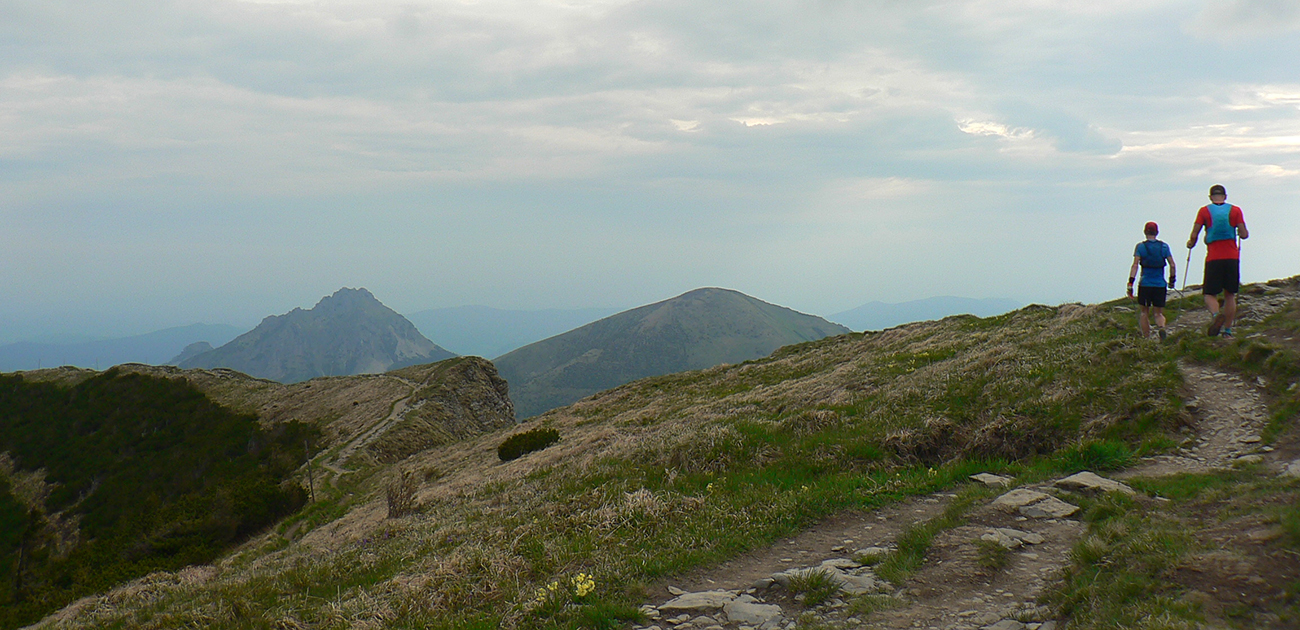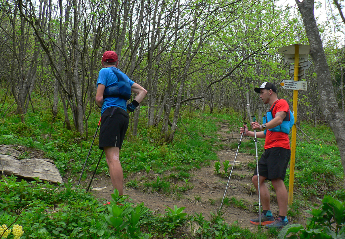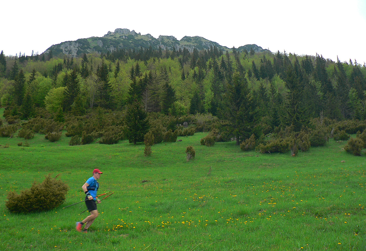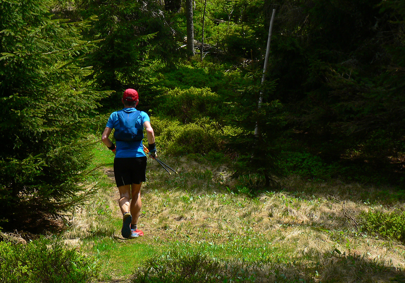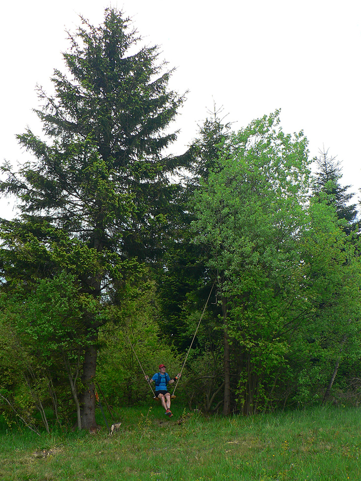 Nasleduje tretie väčšie stúpanie na trase (ale zároveň najkratšie), takže scenár sa opakuje – po kofole druhý SPRING, obal rovno do koša a ide sa. Najprv po lúkach, aj panoramatická tabuľa s názvami je tu. Slnko svieti, ale nepečie, nad hlavou neškodné obláčiky, ranné prehánky už odtiahli. No krása. Len ako zalezieme do lesa, pod nohami blato rozmlátených zvážnic. A to až do konca. Medzi Príslopom a vysielačom na Magurke môžu Spartana organizovať a ani sa nenarobia s prekážkami. Je to hnus velebnosti!
