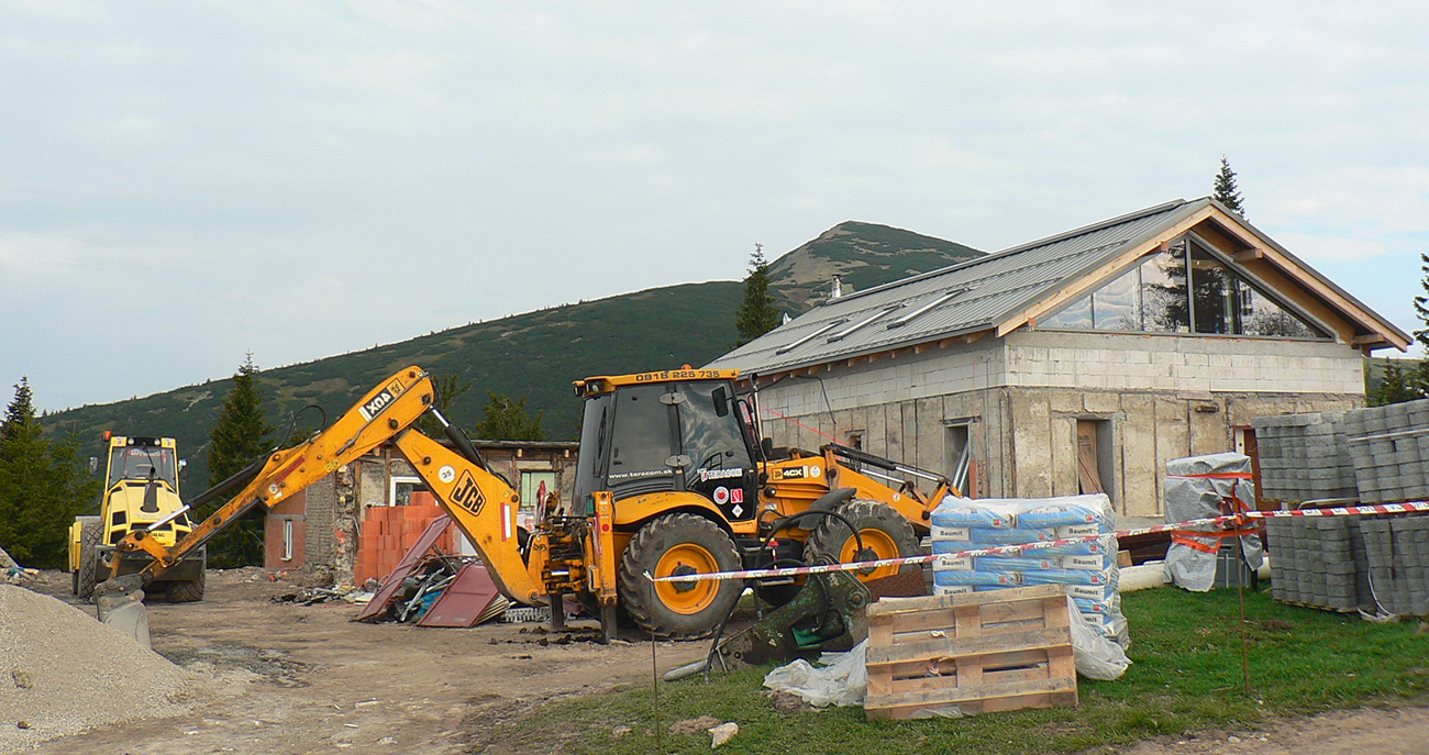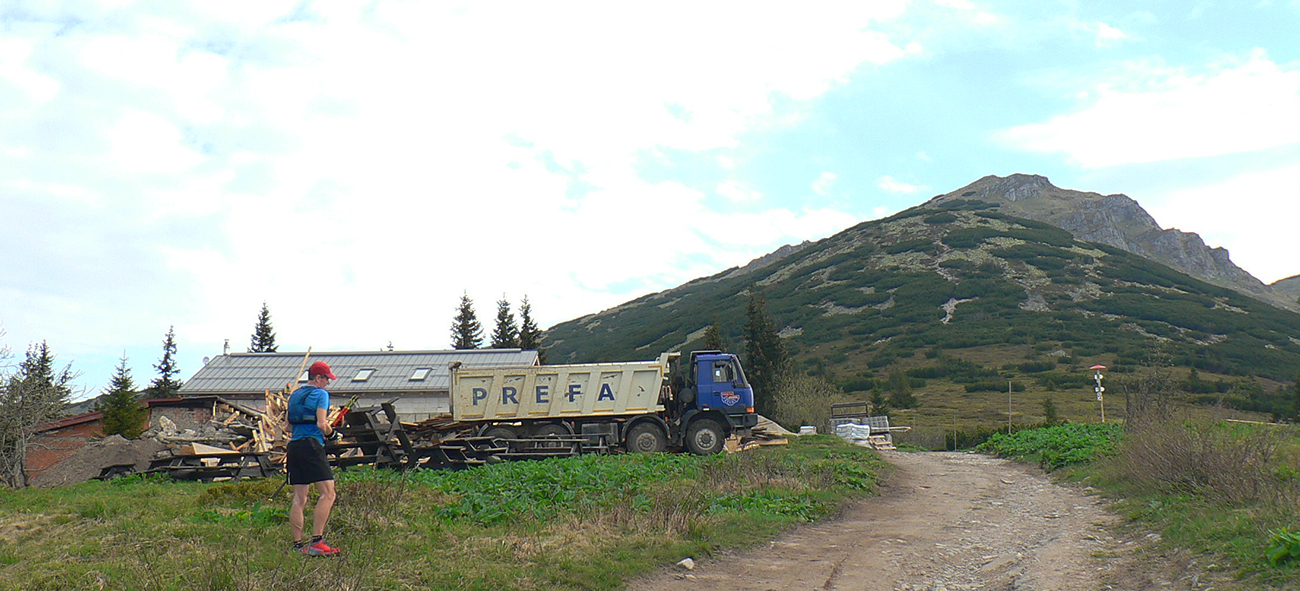 Takže vyrážame, symbolicky od dela, že to bude akože boj, najmä v mojom podaní. Hneď skraja sa zverujem Majovi, kým ešte dokážem udýchať miernejší sklon pod Zajacovou: že sa možno aj s Mišom vrátim nazad, ak mi to moc nepôjde. Že ak by ma vyplo cestou, mám nachystané ústupové trasy so zastávkami autobusov a vlakov na ich konci. Aby som Maja nebrzdil a aby stíhal bus z Námestova. A tu druhé prekvápko: z Námestova máme odvoz až domov. Taaaaaak, to už je iný komfort, hneď sa lepšie fučí – hore skratkou, hore Ploštinami, hore Generálom. Pod Generálom bager, hore pri chate dva a ešte aj náklaďák a stavenisko ako v Jasnej. Pán transparentný exprimátor zainvestovali ťažko zarobené prachy, bude nová chata. Zmývame pot v bazéniku a fotíme historické fotky, ktoré ešte vnúčatám budeme ukazovať: