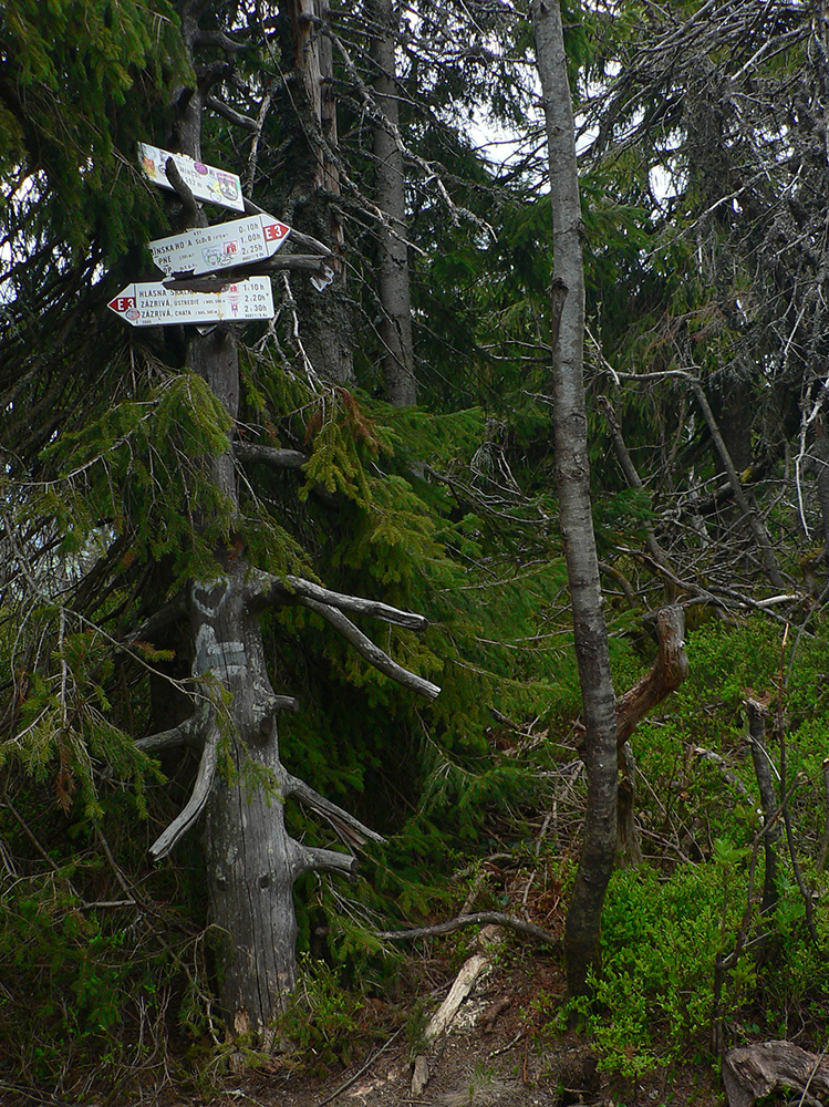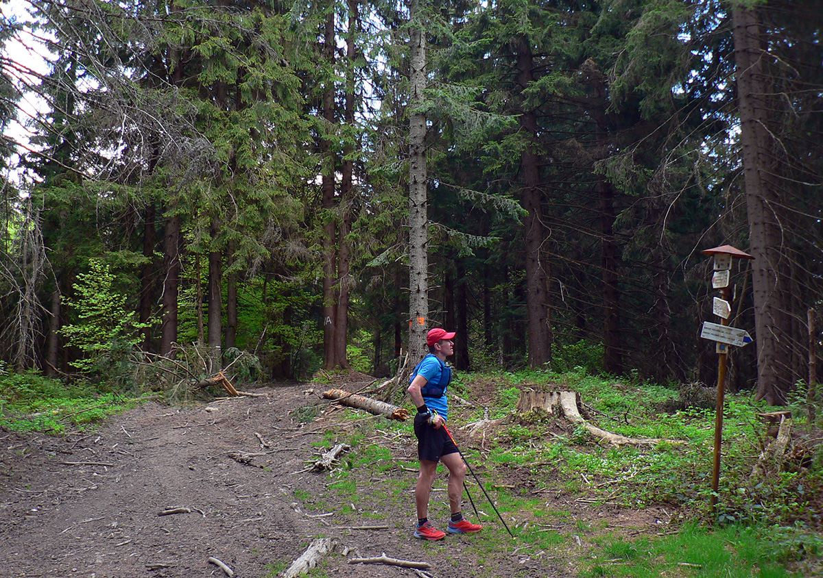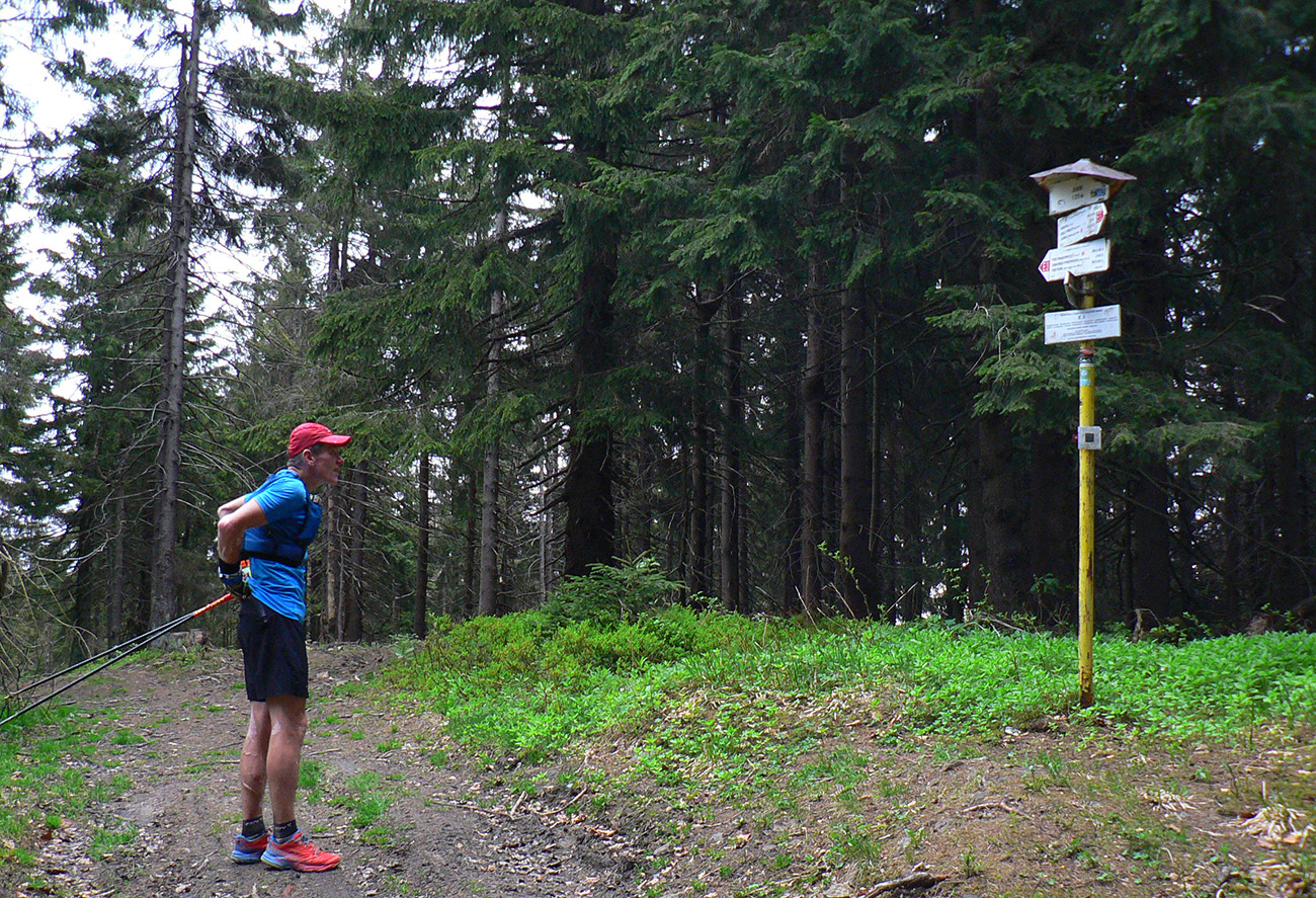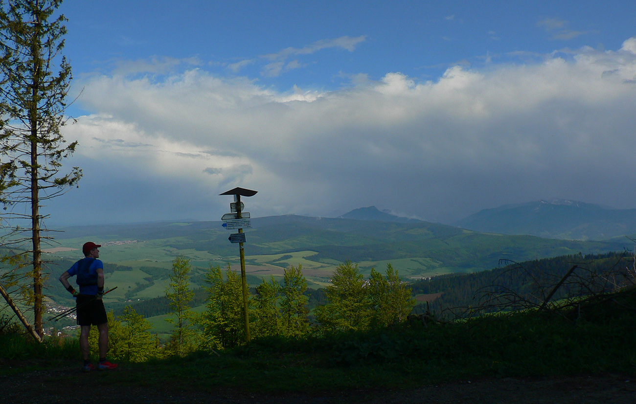 Navyše sa v lese nejako nezvyklo stmieva a zľava zozadu sa približuje hrmenie. Keď už hrmí nad nami a sem – tam sa už aj zablysne, ešte rátam sekundy – päť až osem, je to stále v pohode, vybíja sa tá elektrika hore v mrakoch, na zem hádam nedočiahne. Zato dákych 10 minút dostávame poriadnu ľadovú sprchu (bežný dážď predtým nepočítam). Aj zabúdam, že som ráno nevládal, nejako dobre sa mi beží. Tempo jednoznačne stúpa, nálada je priam elektrizujúca... Podklad sa miestami mení na poriadnu bažinu – okolo Budína akurát ťahajú drevo. Uvedomujem si akí sme blázni, keď si v tej búrke fotíme kovový smerovník na najvyššom bode Oravskej Magury :-) A potom ešte chvíľu hľadáme kade ísť – lebo ciest (alebo skôr bahenných priesekov) je tu niekoľko, len značky nikde.