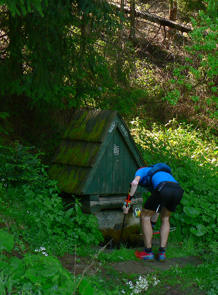 Takže nástup do lesov Oravskej Magury: najprv nad Zázrivou samozrejme viac lúk a výhľadov, potom v napájadlách posledná možnosť dotankovať a zmyť pot - a už sa svahy dvíhajú, traktorové koľaje prehlbujú a les hustne. Po hodinke a pol od krčmy sme na Minčole, nasleduje príjemná klusačka lesom bez výraznejších prevýšení. Za Kubínskou hoľou pekný les, ešte krajší úsek po hornom okraji horských lúk nad Hruštínom, potom ale opačný extrém – rozjazdená zvážnica, kľučkovanie pomedzi obrovské kaluže, odpadky po lesných robotníkoch... Strmo dole na lesnú asfaltku, zo dve serpentíny po nej (ešte sme si trochu zašli ku studničke opláchnuť sa, lebo sme prehliadli odbočku), a už brzdíme pri ďalšej krčme v sedle Príslop. Tu už majú na kofolu aj originál poháre :-)