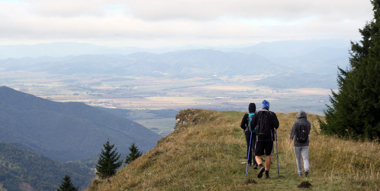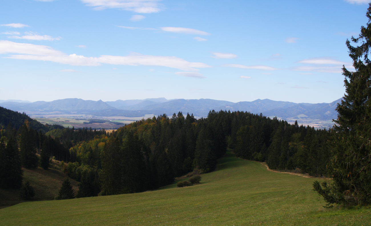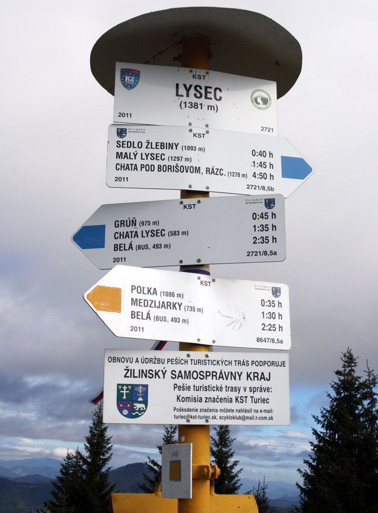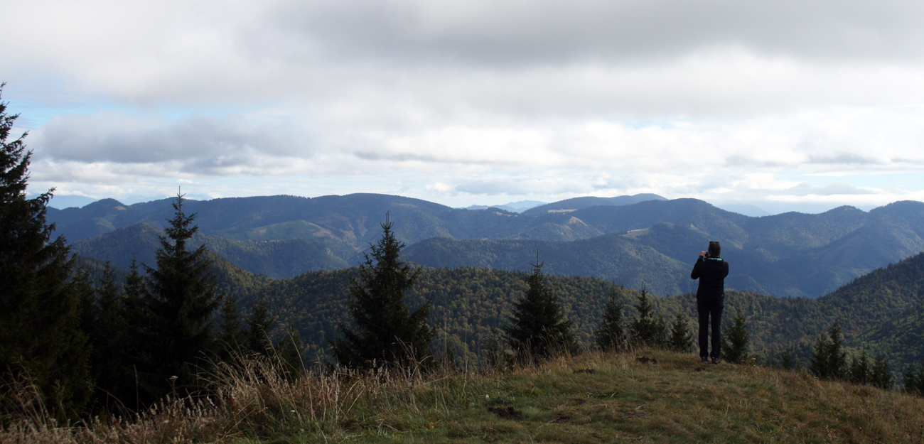 Asi v polovici výstupu vyliezame spod korún stromov na zarastajúce lúky - pribúdajú výhľady do diaľok, ukazuje sa Kľak, Choč, vzadu Martinské hole a tak... Auto sa kúsok pod vrcholom otočilo, asi boli poľovníci po dákeho picnutého zvera. Ani dve hodky nám to netrvalo a sme hore. Trochu fučí, slnko len chvíľami vylieza, svetlo také šedivé, ale mraky vysoko, vidno ďaleko. Pomrvíme sa okolo smerovníka a zima nás poháňa dole. Teraz pre zmenu po žltej, tade je zostup krajší, s výhľadmi do kotliny priamo pred nosom.