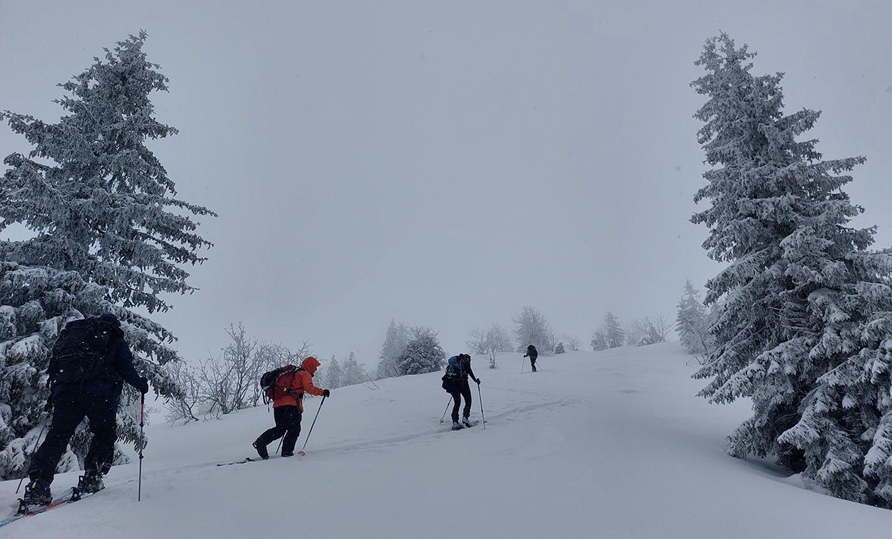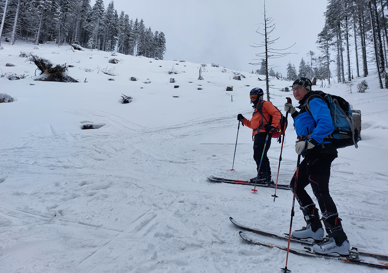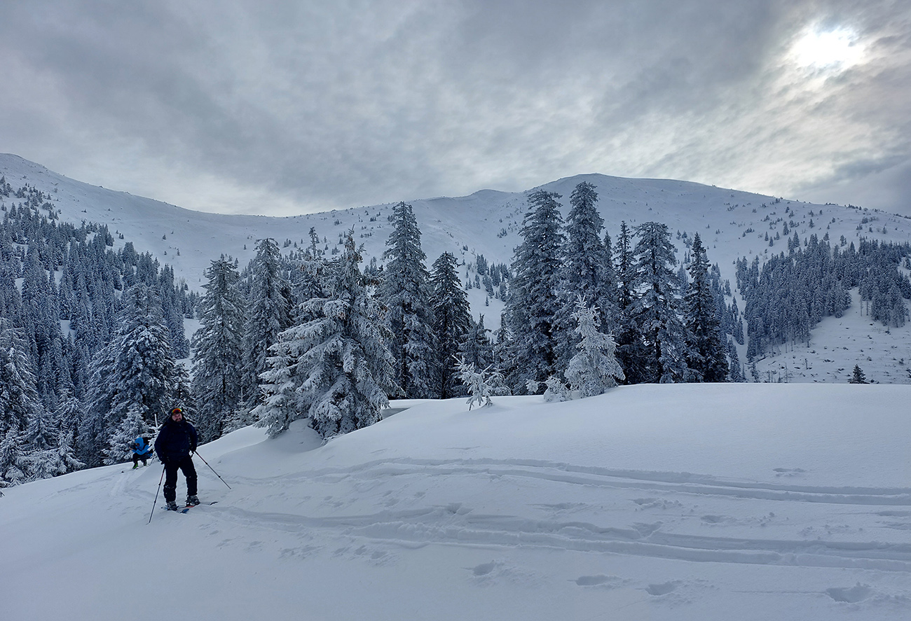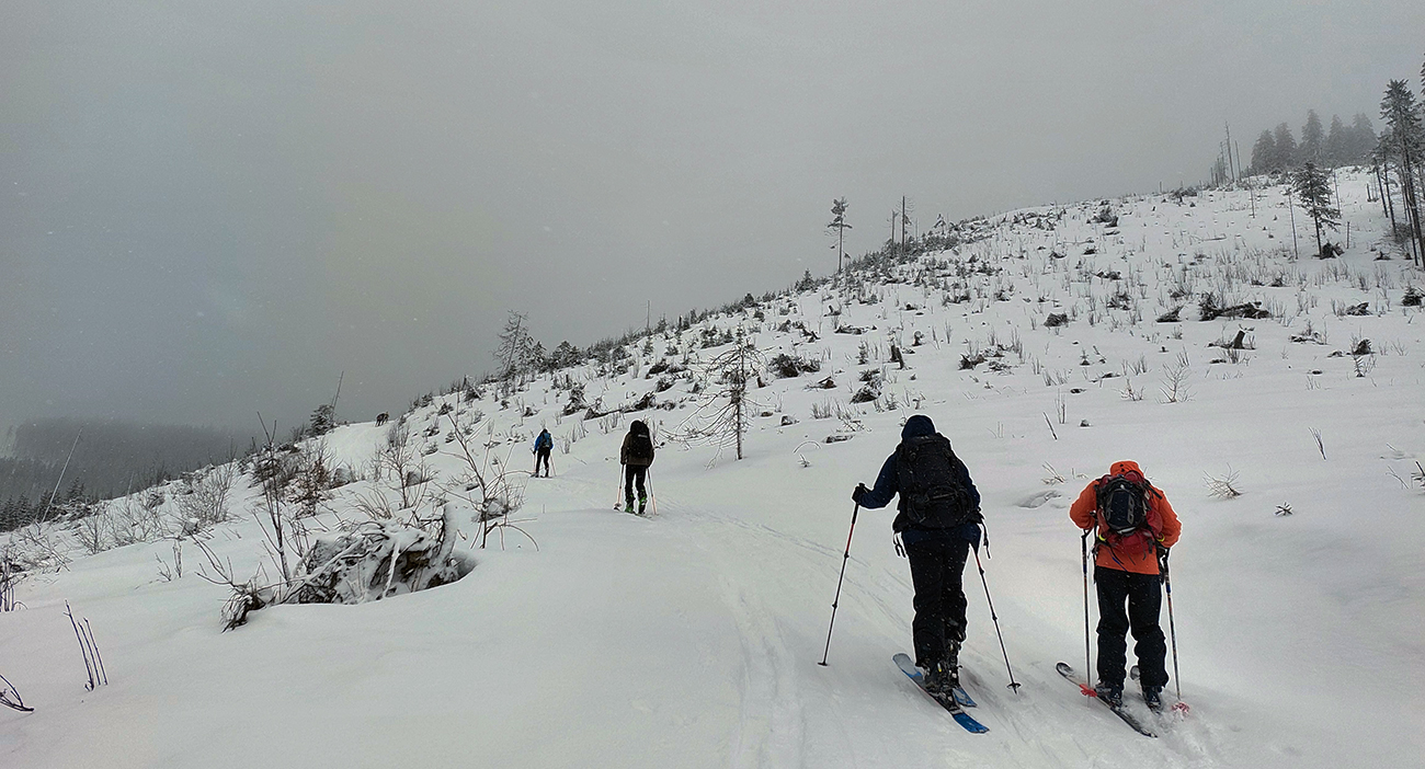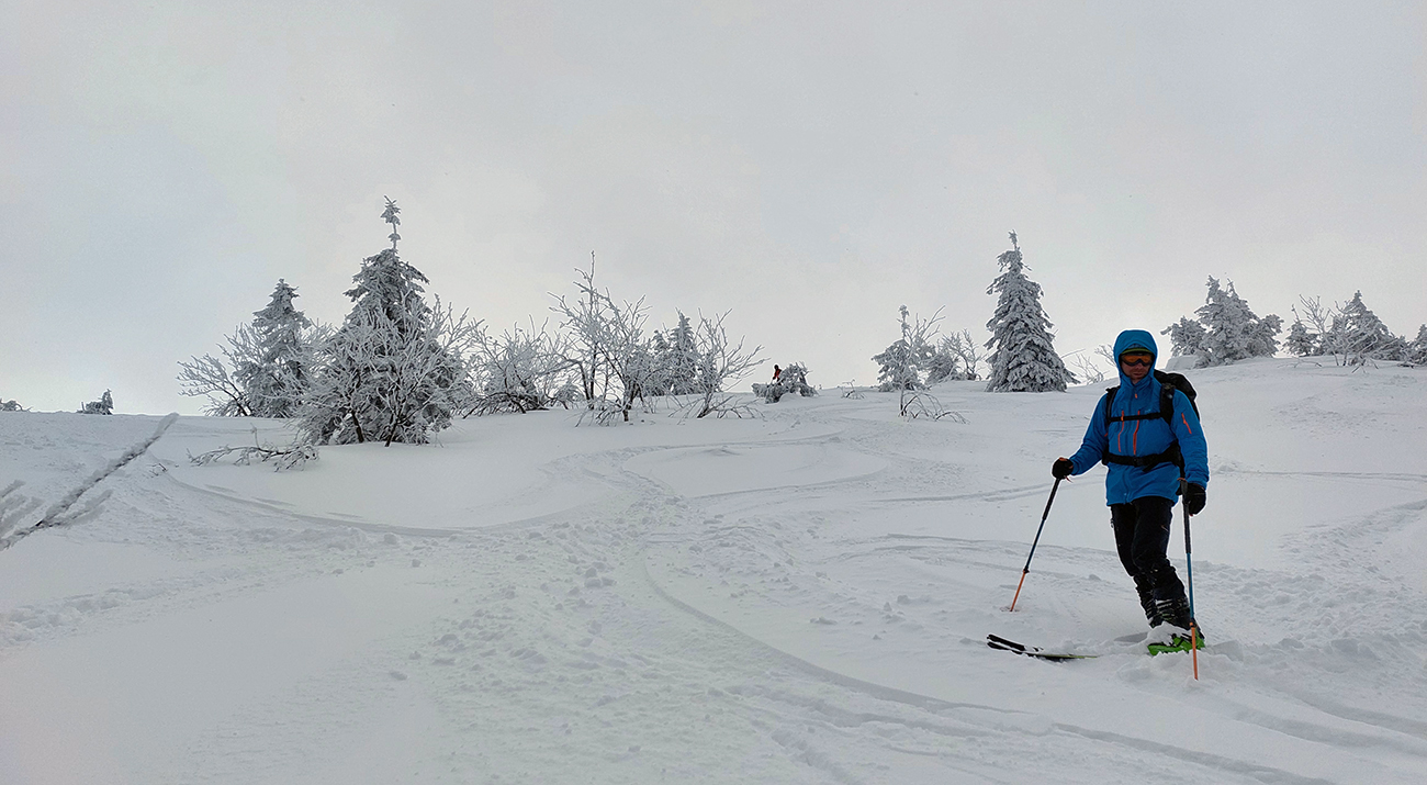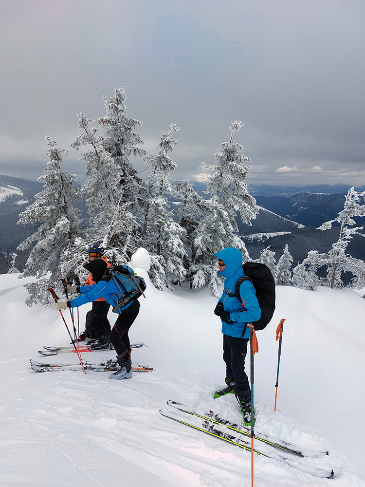 Ale pome od začiatku: v lese pod hrebeňom čistá paráda v prášku, nad lesom vetrom ubitá vrstva a hrebeň čistý, hrboľatý a zubatý firnový ľad. Stúpalo sa po tom čerstvom dobre, len v traverzoch nad lesom ak viacerí prešli, už sem – tam aj lyža podkĺzla na ľade, vo vydretej stope.