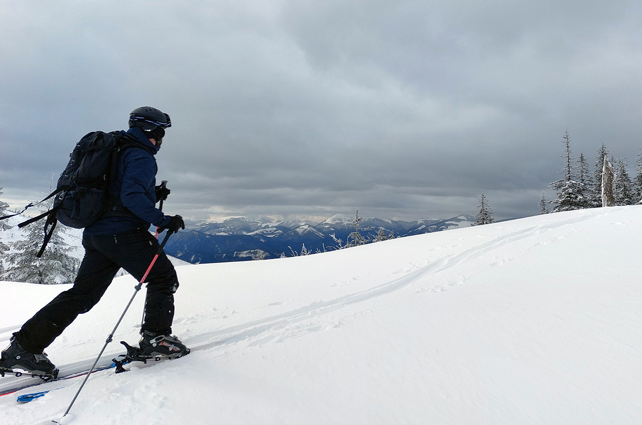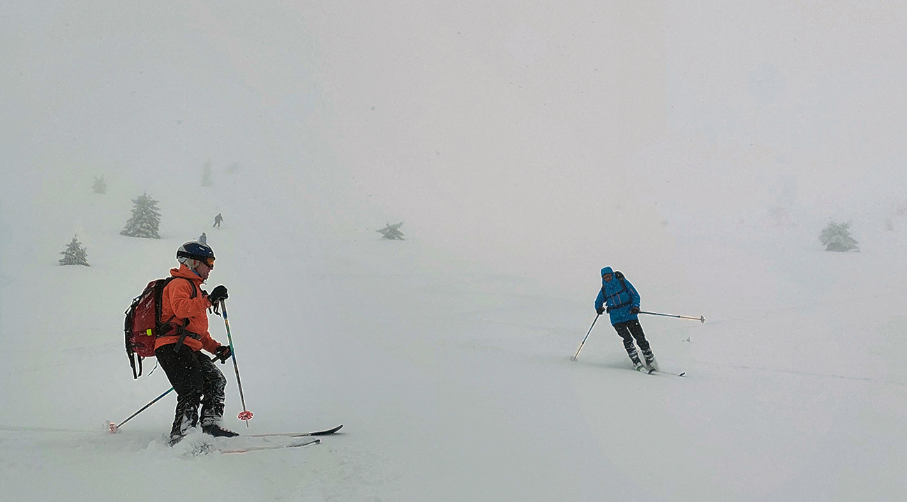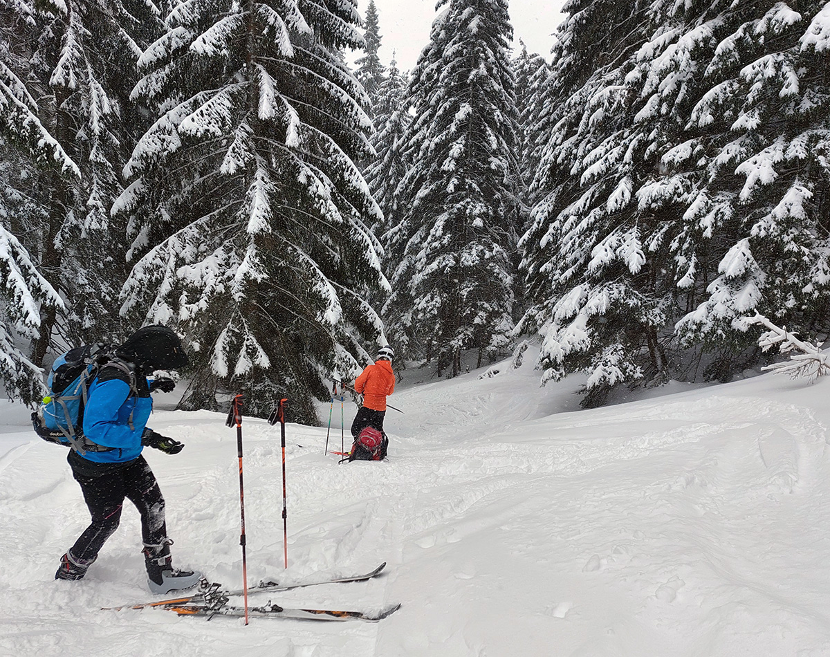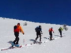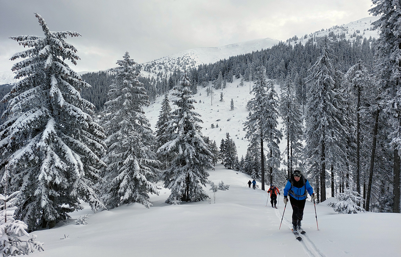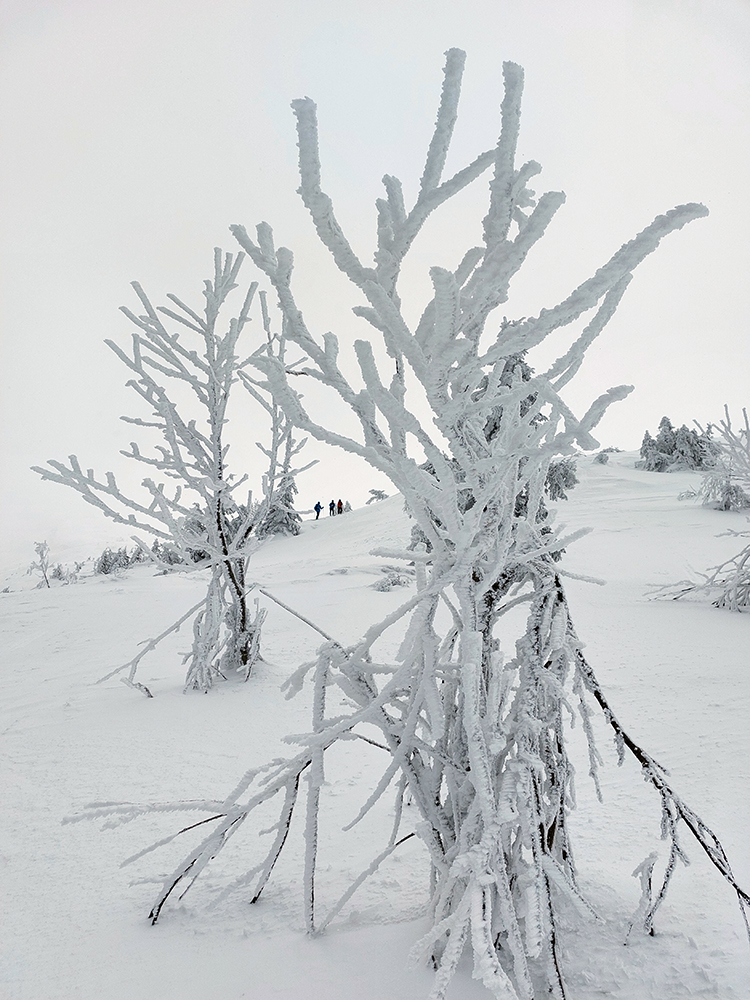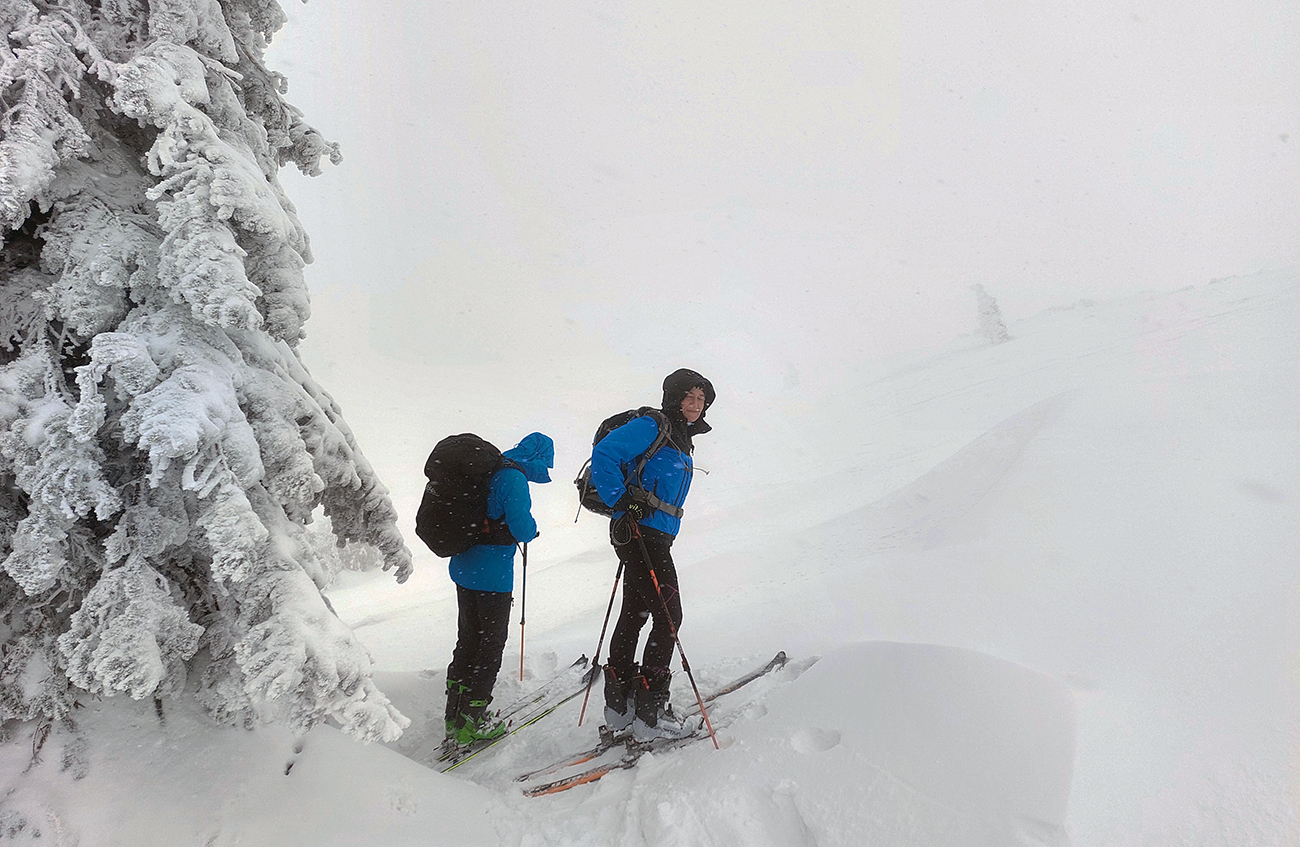 Ale pome od začiatku: v lese pod hrebeňom čistá paráda v prášku, nad lesom vetrom ubitá vrstva a hrebeň čistý, hrboľatý a zubatý firnový ľad. Stúpalo sa po tom čerstvom dobre, len v traverzoch nad lesom ak viacerí prešli, už sem – tam aj lyža podkĺzla na ľade, vo vydretej stope.