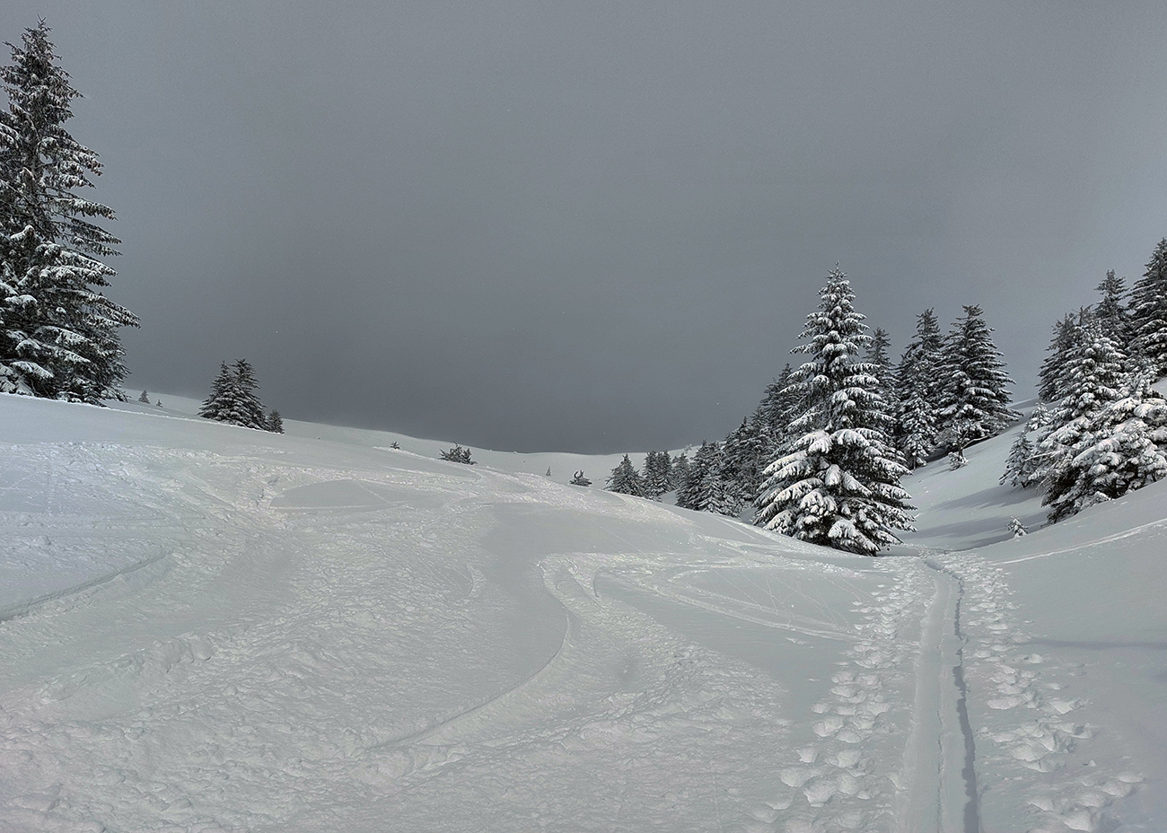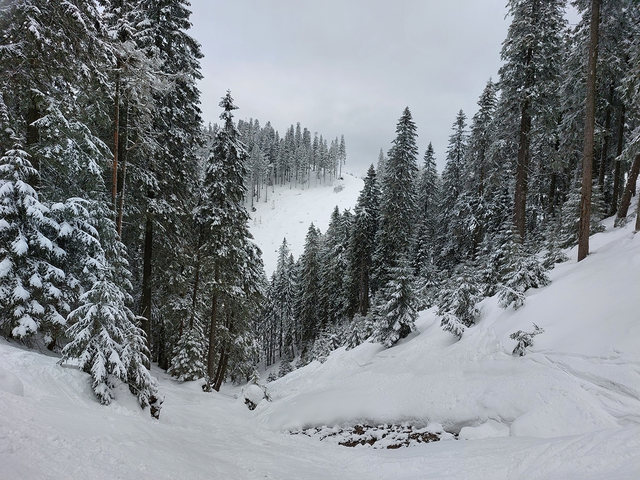 Na rúbaniskách vyššie už pekná biela zima, hneď na tom spodnom sa dali príjemné posledné oblúčiky potočiť pri odjazde. Na tom vyššom (z vrcholu Turánskeho dole na východ, na výstupovú stopu) to bola už úplná paráda, tiež na záver: takých 10 cm prášku.