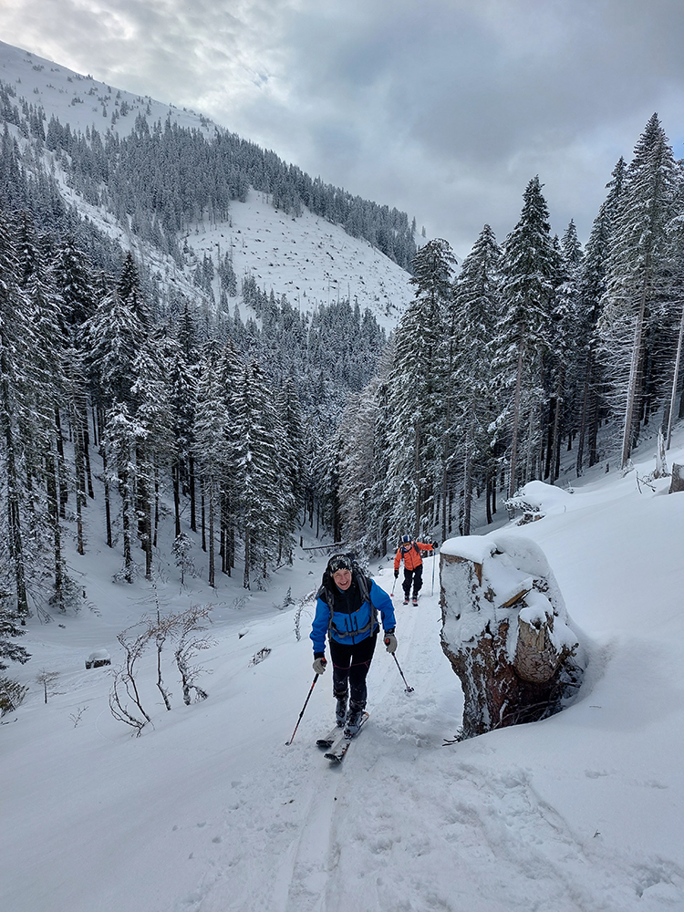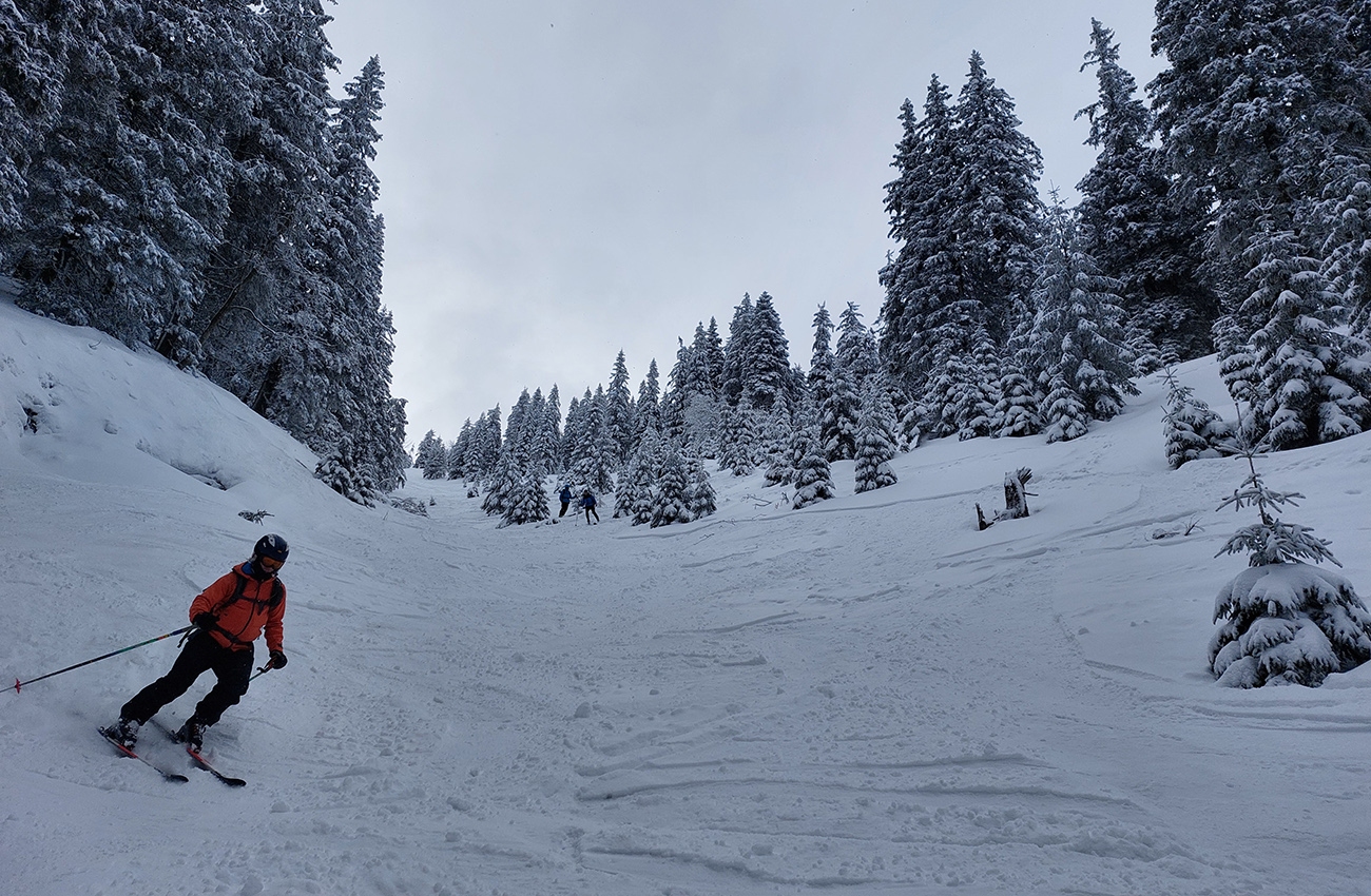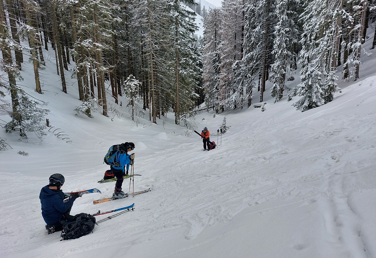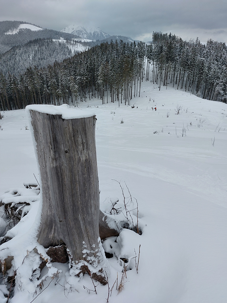 Cestou nazad sme sa vrhli pomedzi stromy do Turánskeho žľabu, ktorý už bol síce rozlyžovaný, ale práve medzi tými stromami to bolo takmer nepočmárané a každý si našiel tú svoju linku. Aj cez 20 cm prášku, paráda. Potom už len hore rúbaňou na vrchol Turánskeho a tie rúbaniská smerom k ceste na záver.