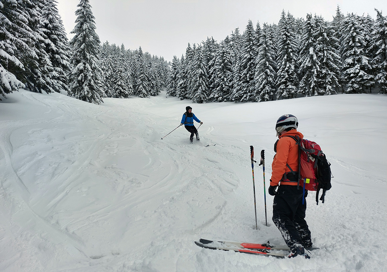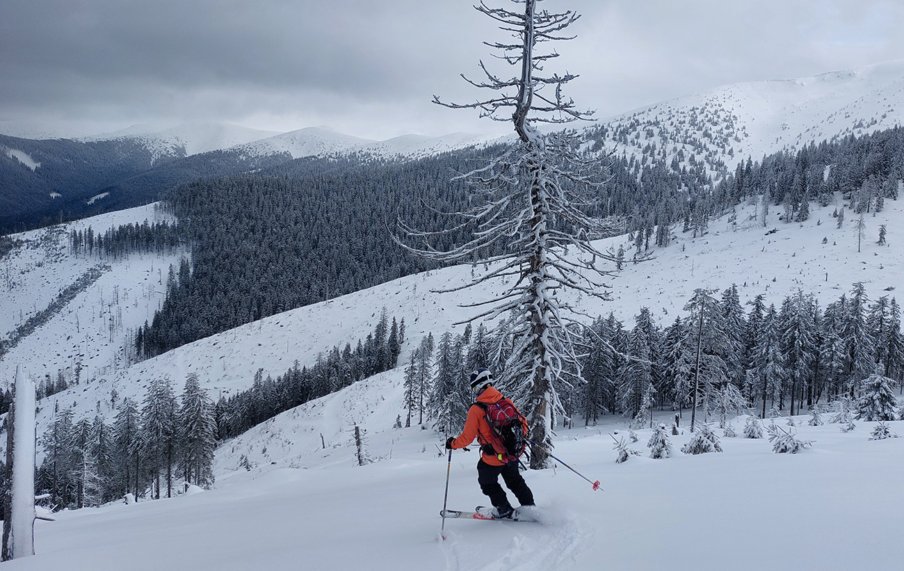 Na hrebeni ale hnusný, jedovatý fičák od severu, tak sme sa ukryli hneď na juh (bližšie k Latiborskej holi) a dali sme zo tri razy svahy dole ku hranici lesa. Snehy parádne, podmienky konzistentné - čím nižšie, tým lepšie a práškovejšie. A v nižších polohách bez tej podhrebeňovej difúzky to bolo ešte superovitejšie.