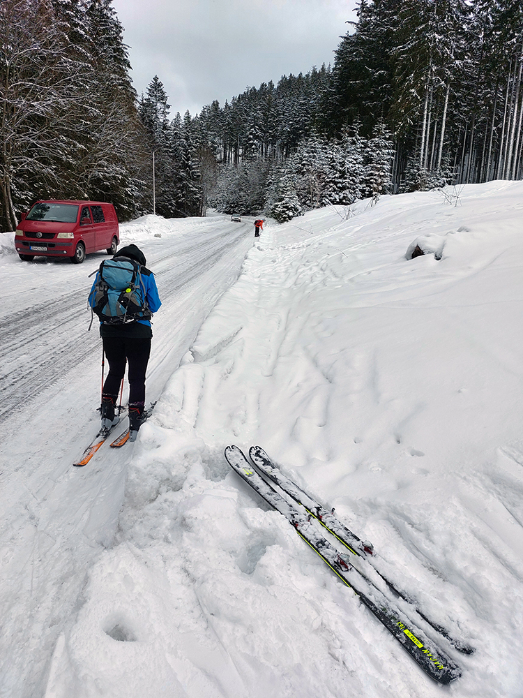 Potom už na lyžiach - začiatok cesty hore lesom, to je škrípavý, špinavý, hrboľatý a zamrznutý firn, prikrytý asi centimetrom čerstvého poprašku, pod ktorým akurát že nevidno ten ihličnatý bordel, naukladaný tam vetrom a tým brutálnym oteplením posledných týždňov.