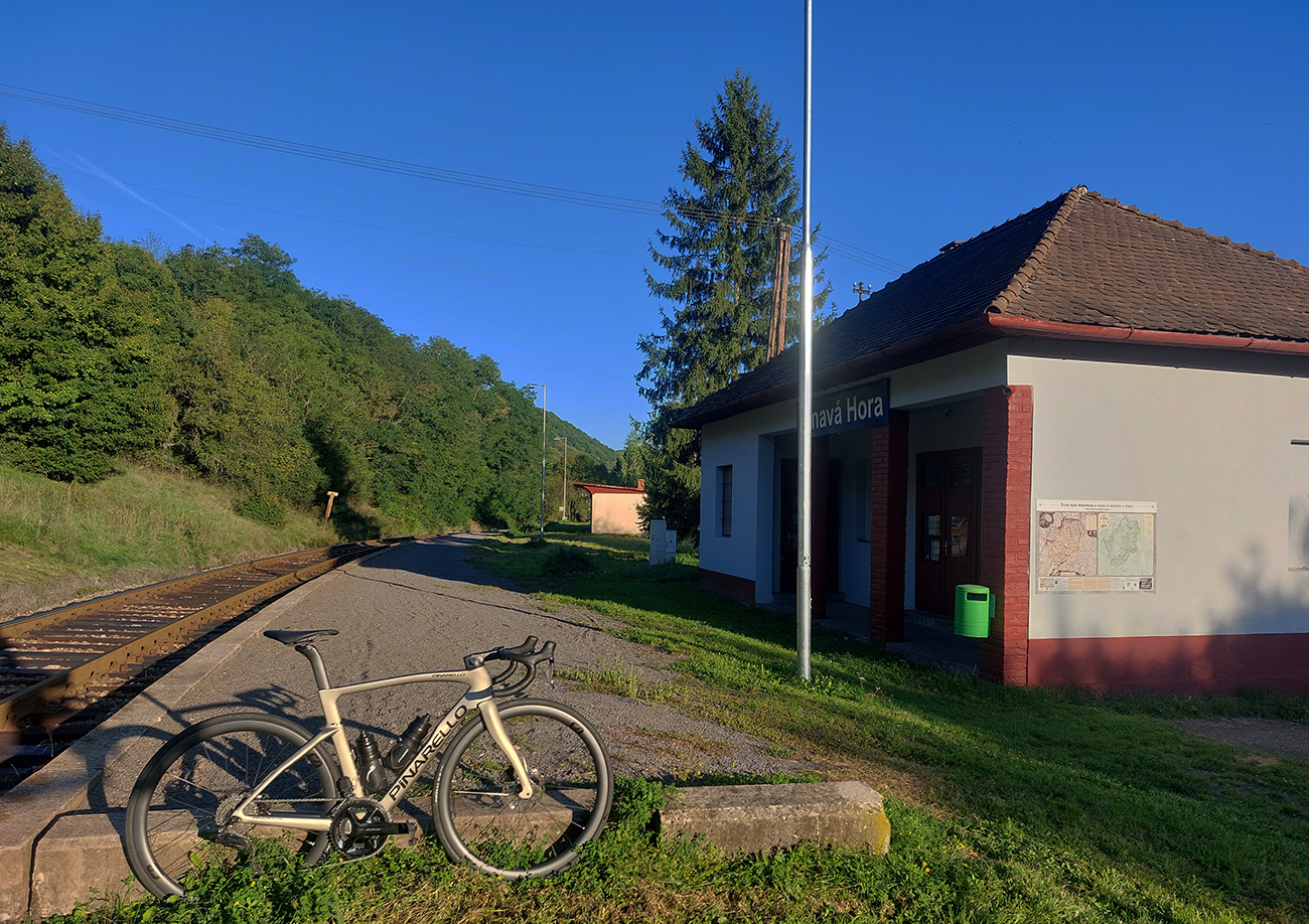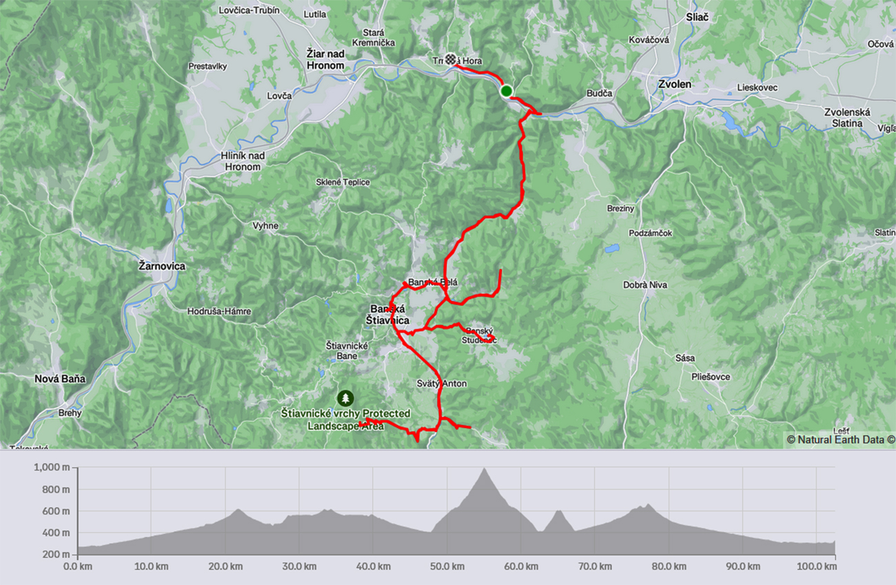 Možno posledný horúci víkend, ale rána už aj tak hmlisté a chladné. Je po lete, v Banskej Štiavnici a okolí už nie sú také hordy turistov, a teda aj áut je menej. Okrem hlavných ťahov je v okolí bývalého banského mesta dostatok úzkych a tichých, zväčša kopcovitých okresiek, s povrchom viac – menej jazditeľným, často čerstvo opraveným. To všetko treba využiť! Takže štart aj cieľ v Hronskej Dúbrave (lebo vlak) a naplánovaných šesť úsekov „tam a nazad“ – sám som zvedavý, na koľko z nich bude čas. Niektoré z nich čiastočne poznám a viem, že na žiletke v pohode, na iných sa nechám prekvapiť. Ale dúfam, že aj v tomto kúte slovenského vesmíru opravy kedysi katastrofálnych miestnych ciest už pokročili. Nakoniec sa zadarili štyri odbočky, také „fúziky“. A takto to vyzeralo - takmer okrúhla stovečka s 1700 nastúpanými metrami: