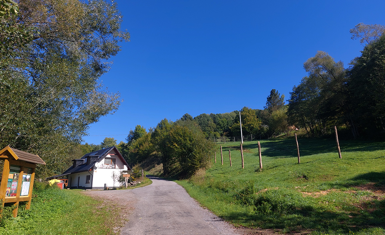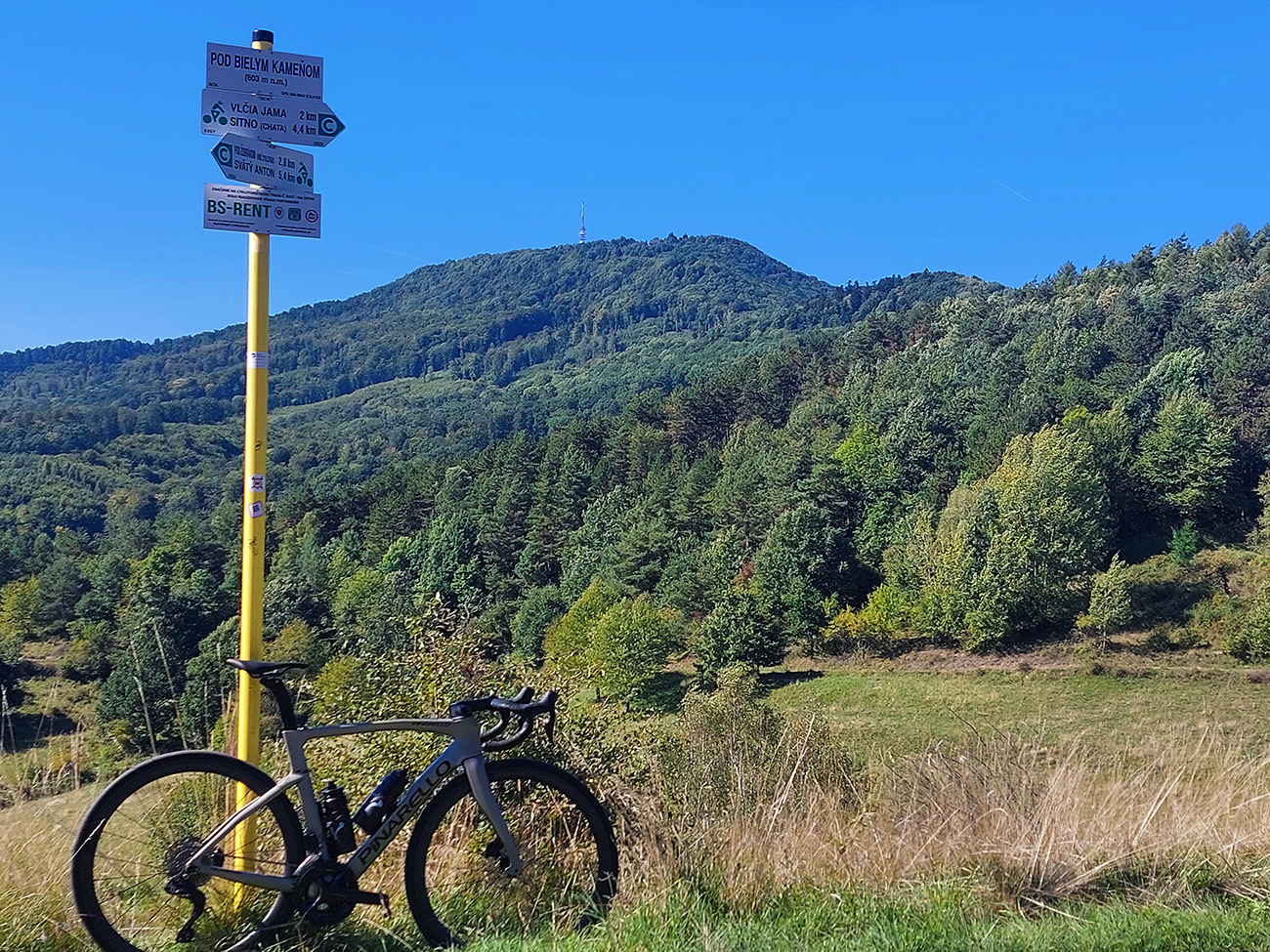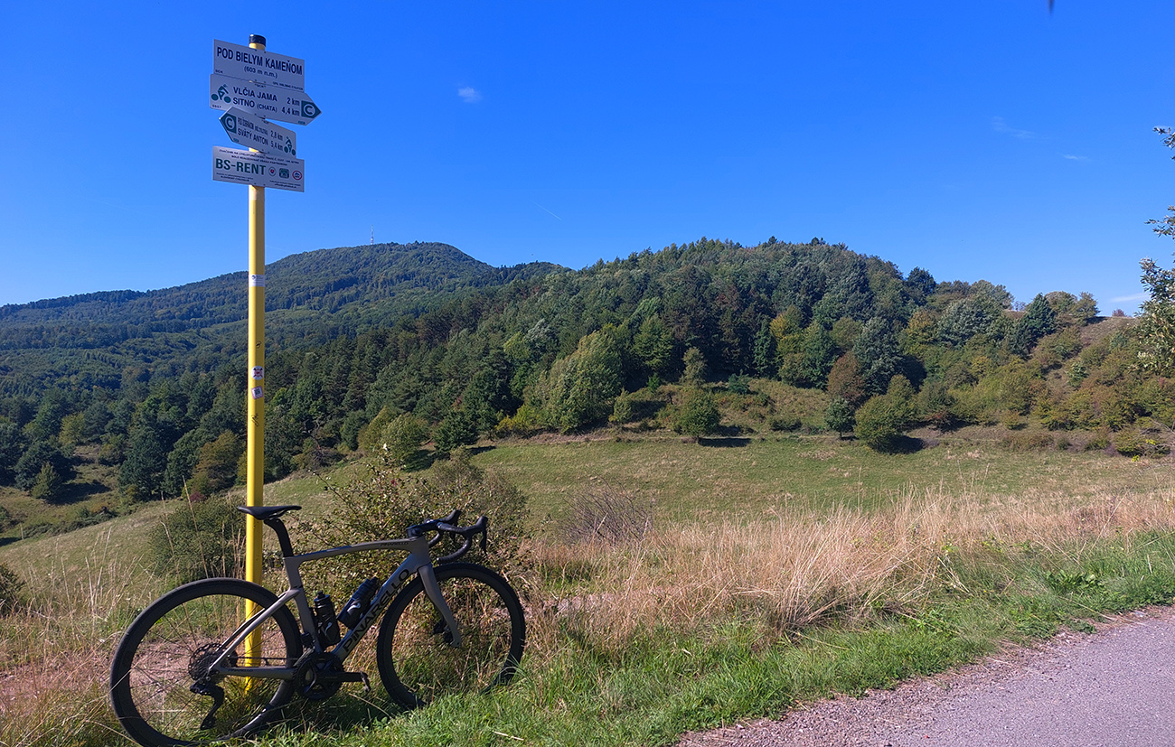 Do tretice dlhšie z kopca, až za Sv. Anton, lebo čakalo Sitno – najdlhši kopec. Odbočka z hlavnej taká nenápadná - len cyklosmerovník, a vraj sedem kilákov. Úvod cez lúky, potom zväčša les. A sklon poriadne výživný, našťastie prerušovaný rovinkami na predýchanie. Pod parkoviskom, kde končia autá, ešte zopár lúčnych výhľadov a panorám, a potom to začne!