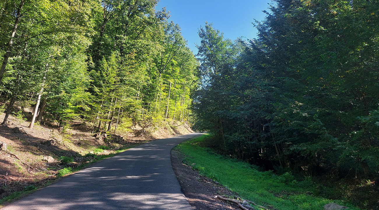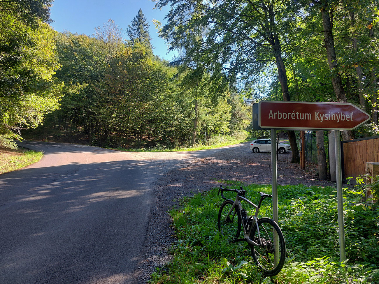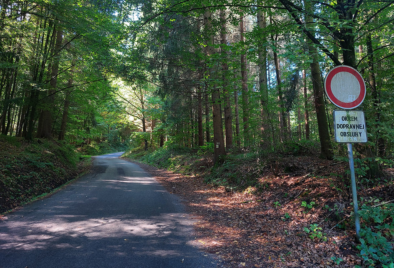 Davaj dole, no už nie až do Belej – na programe sú Kolpachy a tam sa dá dostať od Halčianskeho tajchu cez Kysihýbel. Cesta na úvod podobná – pekne poopravovaná, lesom, tieňom, potom od areálu školských lesov strmší záver a odbočka na hlavnú cestu, vedúcu zo Štiavnice popri známom arboréte. Tam popri jeho bráne je ešte jeden krátky strmší úsek, potom až do dediny pod hrádzu Kolpašského tajchu cesta široká, tichá, vlní sa lesom viac doprava a doľava, ako hore a dolu. Otočil som sa na konci asfaltu (či skôr betónu), ku hrádzi potom vedie už len šotolina.