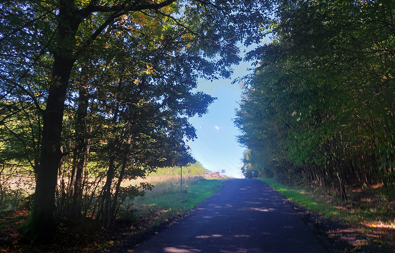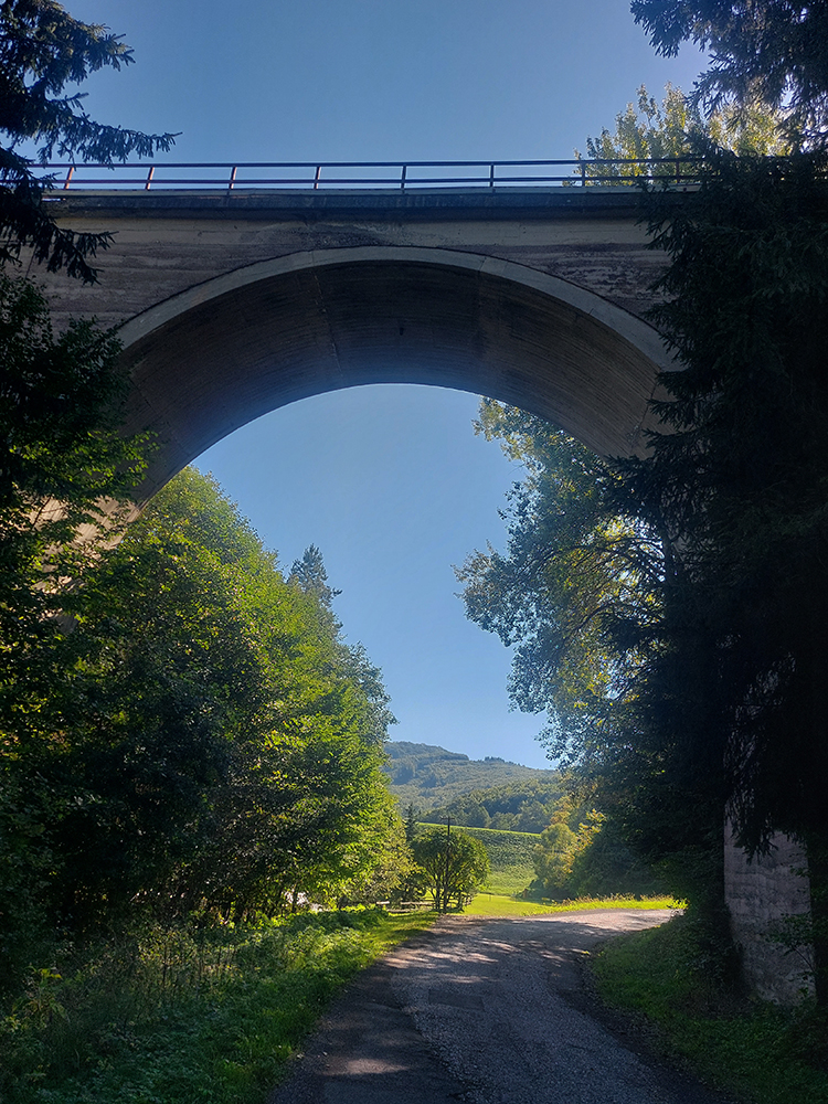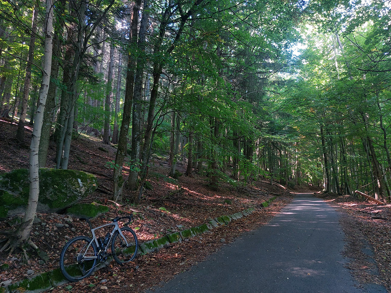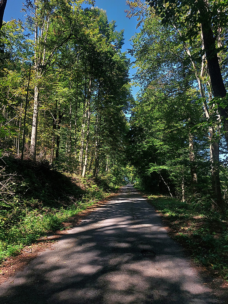Davaj dole, no už nie až do Belej – na programe sú Kolpachy a tam sa dá dostať od Halčianskeho tajchu cez Kysihýbel. Cesta na úvod podobná – pekne poopravovaná, lesom, tieňom, potom od areálu školských lesov strmší záver a odbočka na hlavnú cestu, vedúcu zo Štiavnice popri známom arboréte. Tam popri jeho bráne je ešte jeden krátky strmší úsek, potom až do dediny pod hrádzu Kolpašského tajchu cesta široká, tichá, vlní sa lesom viac doprava a doľava, ako hore a dolu. Otočil som sa na konci asfaltu (či skôr betónu), ku hrádzi potom vedie už len šotolina.