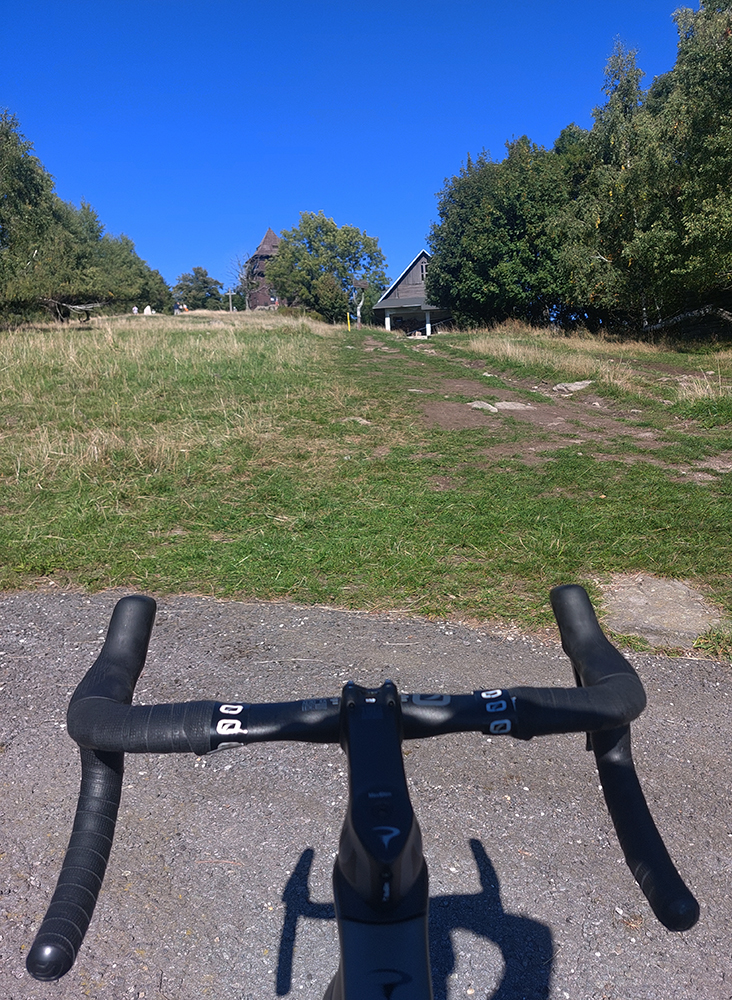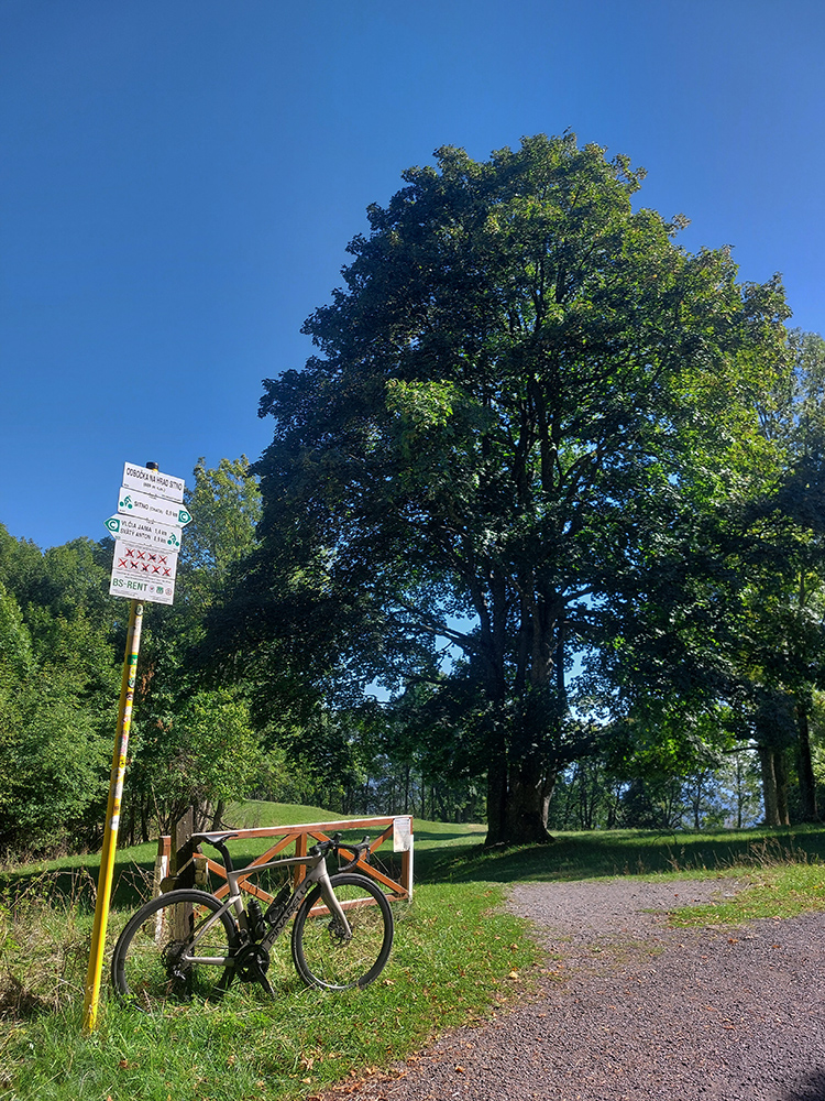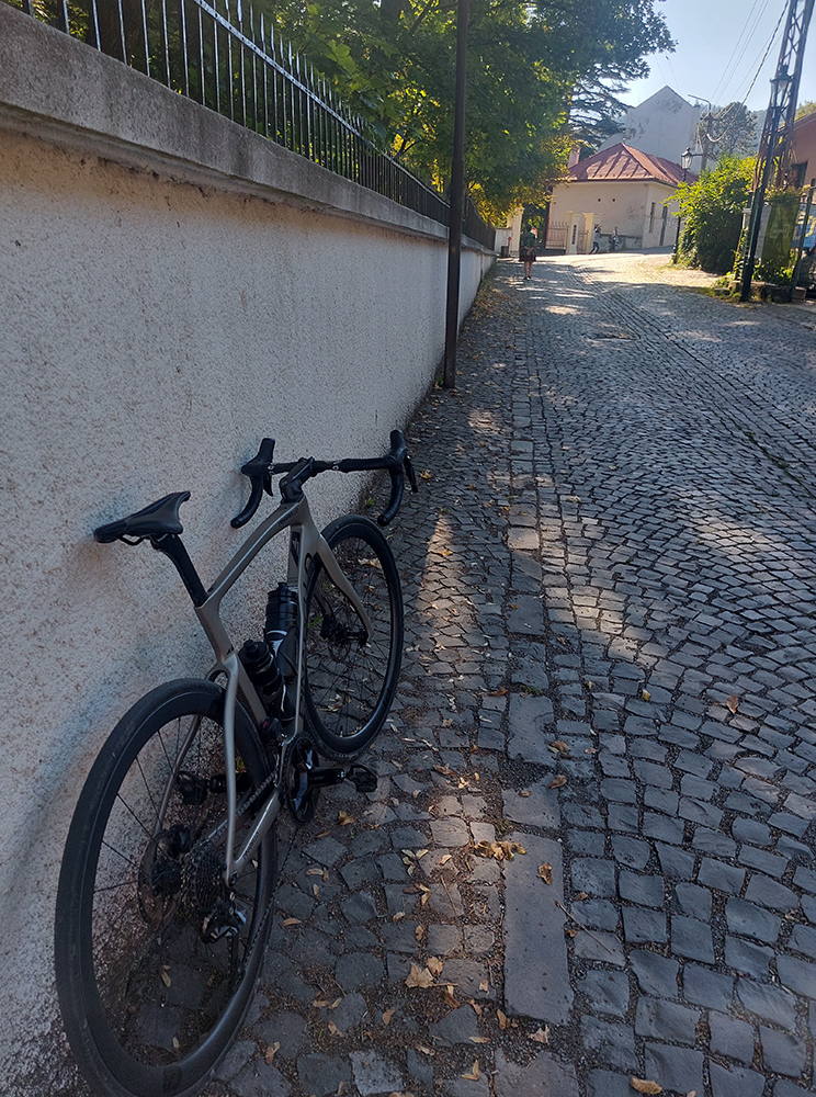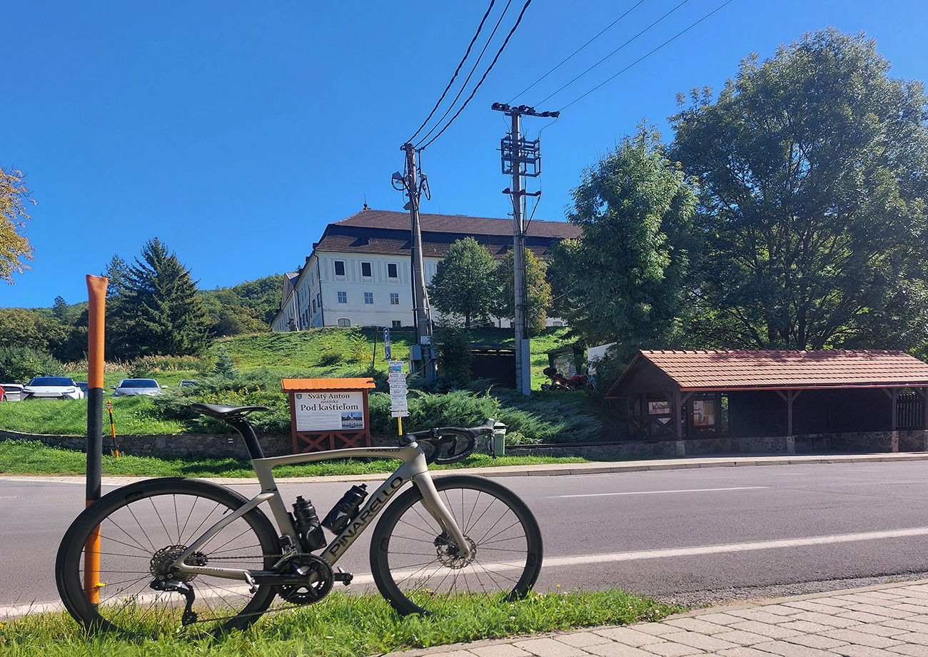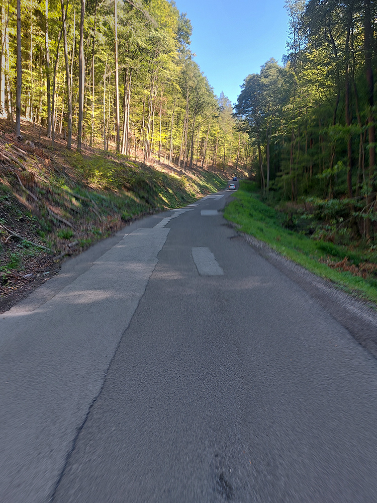 Lebo ak na spodku len občas jama, práve pod a nad parkoviskom najhnusnejší úsek (našťastie kratučký), cesta ako po bombardovaní. Kto sa nenechá odradiť, užije si tieň a relatívne hladký asfalt, ale od odbočky ku hradu aj najväčšiu strminu a pred záverom zas aj jamy ako svet. Lámalo ma tam poriadne, aj cez 20% Strava ukázala. Od konca cesty pár metrov k vyhliadke po tráve, to už bola pohodička :-)
