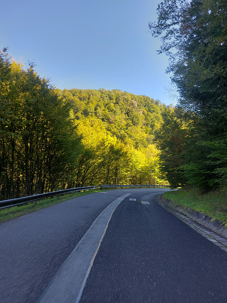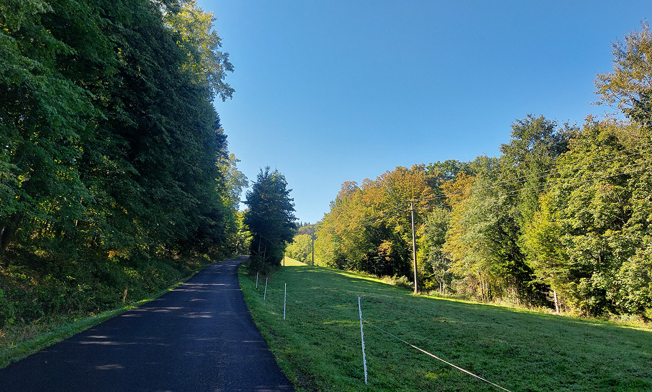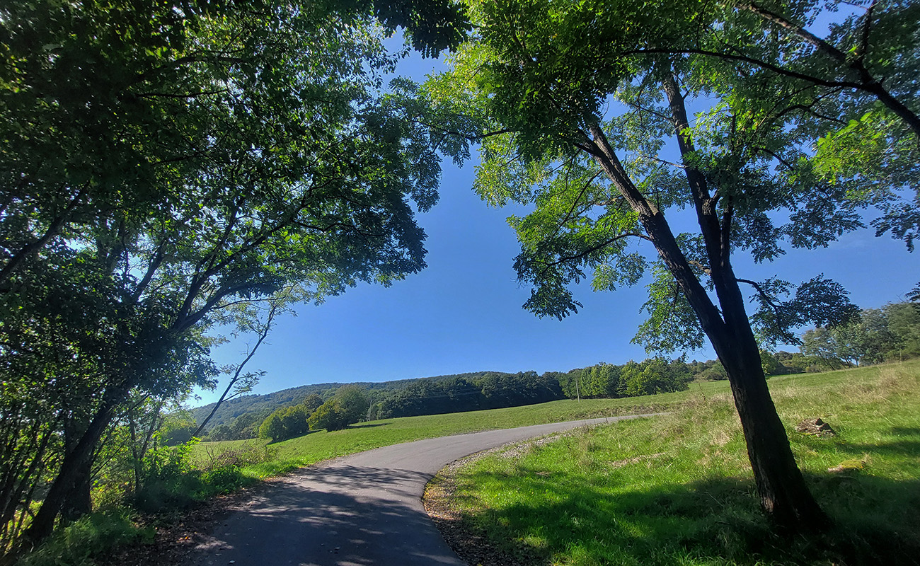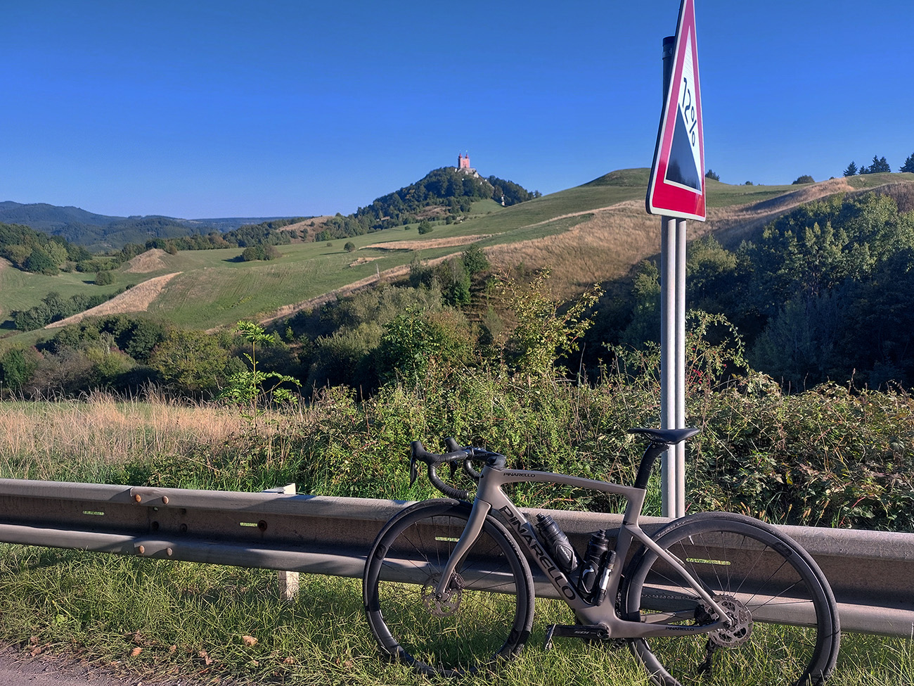 Lebo ak na spodku len občas jama, práve pod a nad parkoviskom najhnusnejší úsek (našťastie kratučký), cesta ako po bombardovaní. Kto sa nenechá odradiť, užije si tieň a relatívne hladký asfalt, ale od odbočky ku hradu aj najväčšiu strminu a pred záverom zas aj jamy ako svet. Lámalo ma tam poriadne, aj cez 20% Strava ukázala. Od konca cesty pár metrov k vyhliadke po tráve, to už bola pohodička :-)