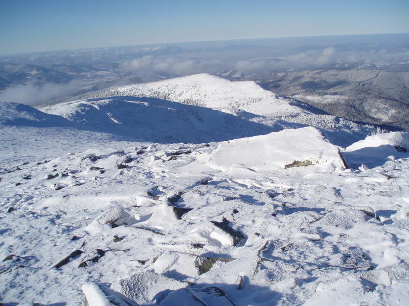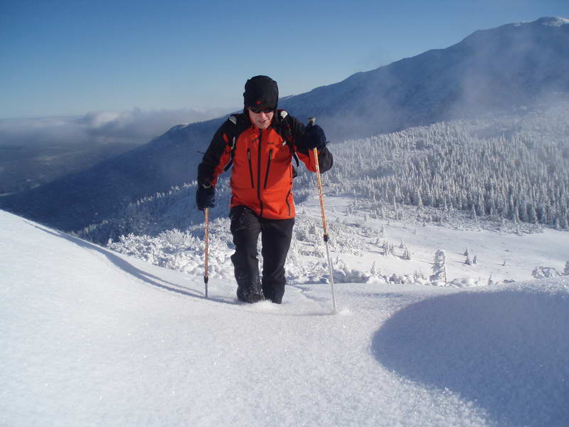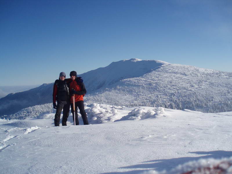 Ďalej pokračujeme chodníkom zarezanom v pásme kosodreviny na hraničný slovensko-poľský hrebienok. Po ňom stúpame okolo ďalšieho prístrešku až na vrchol. Na vrchole je množstvo stĺpikov, tabuliek, smerovníkov, stôl a kamenný múr, ktorý vytvára závetrie. Výhľad je skutočne nádherný na všetky strany. Stojíme na najvyššej hore Oravských Beskýd a pritom jednou nohou v Poľsku. Po fotení a občerstvení už sledujeme pokračovanie našej cesty na Malú Babiu horu (1517 m n.m.).Po hrebeni zostupujeme smerom do sedla Brona (1408 m n.m.), ideme po slovensko-poľskej hranici a zároveň po modrej značke. V polovici stretáme troch Poliakov, ktorí idú na vrchol, a zároveň nám aspoň po sedlo prešľapali chodník. Zo sedla Brona už začneme opäť stúpať a tešíme sa na zafúkaný chodník. Miestami bol nafúkaný „vajcový“ sneh, ale bol to ľahučký prašan, v ktorom sme si každý krok doslova užívali.