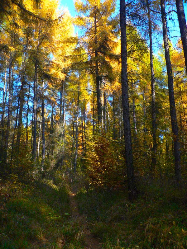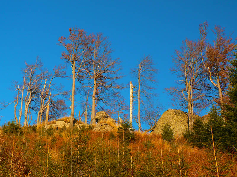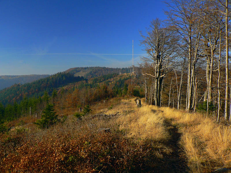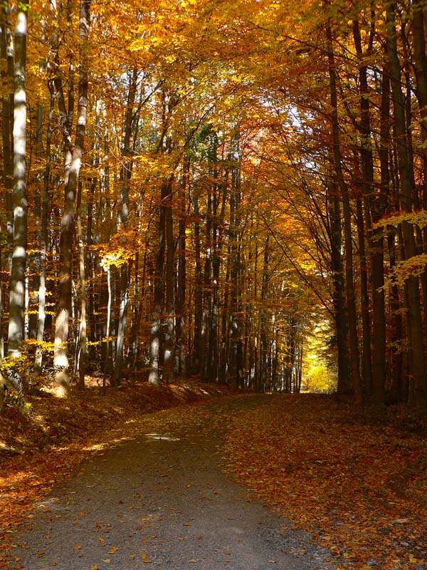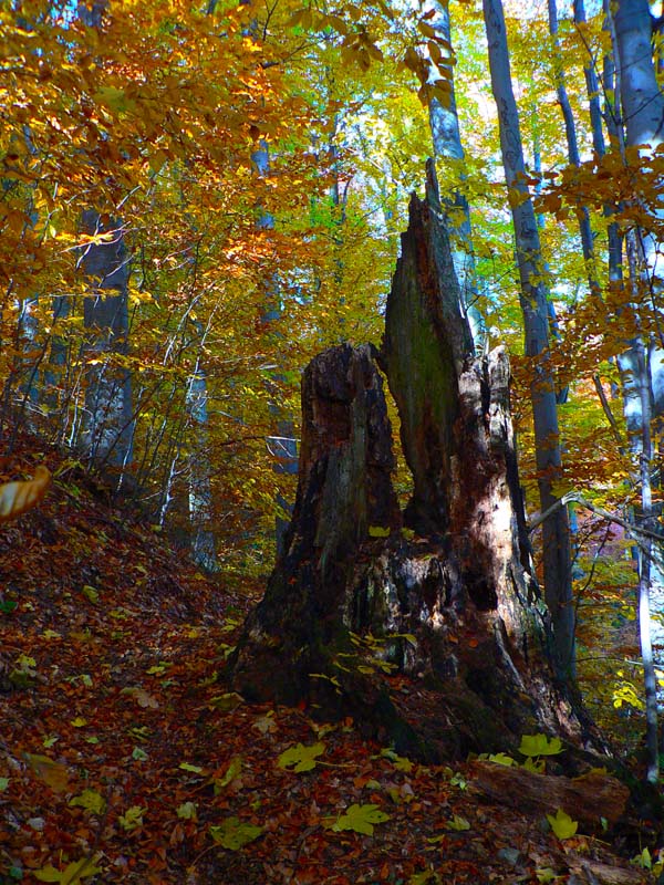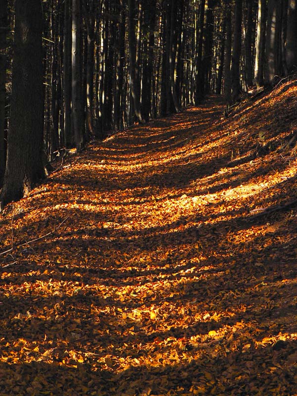 Nebudem sa tu veľmi rozplývať nad gýčovitou krásou jesenných lesov, akurát ma celú cestu napadali rôzne názvy pre tento článok (jeden hlúpejší ako druhý), ako „Cesta rozprávkovým lesom“ či „Farebné lesné tunely“ a podobné. A spomeniem aj to, že prvých ľudí som stretol (napriek ukážkovému počasiu) až na Troch krížoch. Motorkárov nerátam, to je škodná, nie ľudia :-) A ešte to, že skoro celé sa to dá prejsť aj na bajku, asi len okrem oboch rezervácií, kde by bolo viac tlačenia ako jazdenia. Ale tie sa dajú obísť po cestách. Táto prechádzka je stále v miernom stúpaní. Len občas sa do cesty postaví niečo prudšie, ale vždy krátke, len „na rozdýchanie“. A ešte spomeniem hádam to, že krásne paroháče cez cestu skákali. Krásne ale „sprostie“ - keby sa nepohli, človek by ich v tom lese nezbadal :-) Ostatné povedia fotky, ale treba tam radšej ísť a vidieť na vlastné oči.