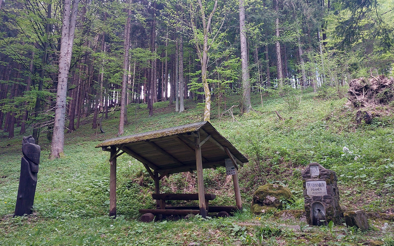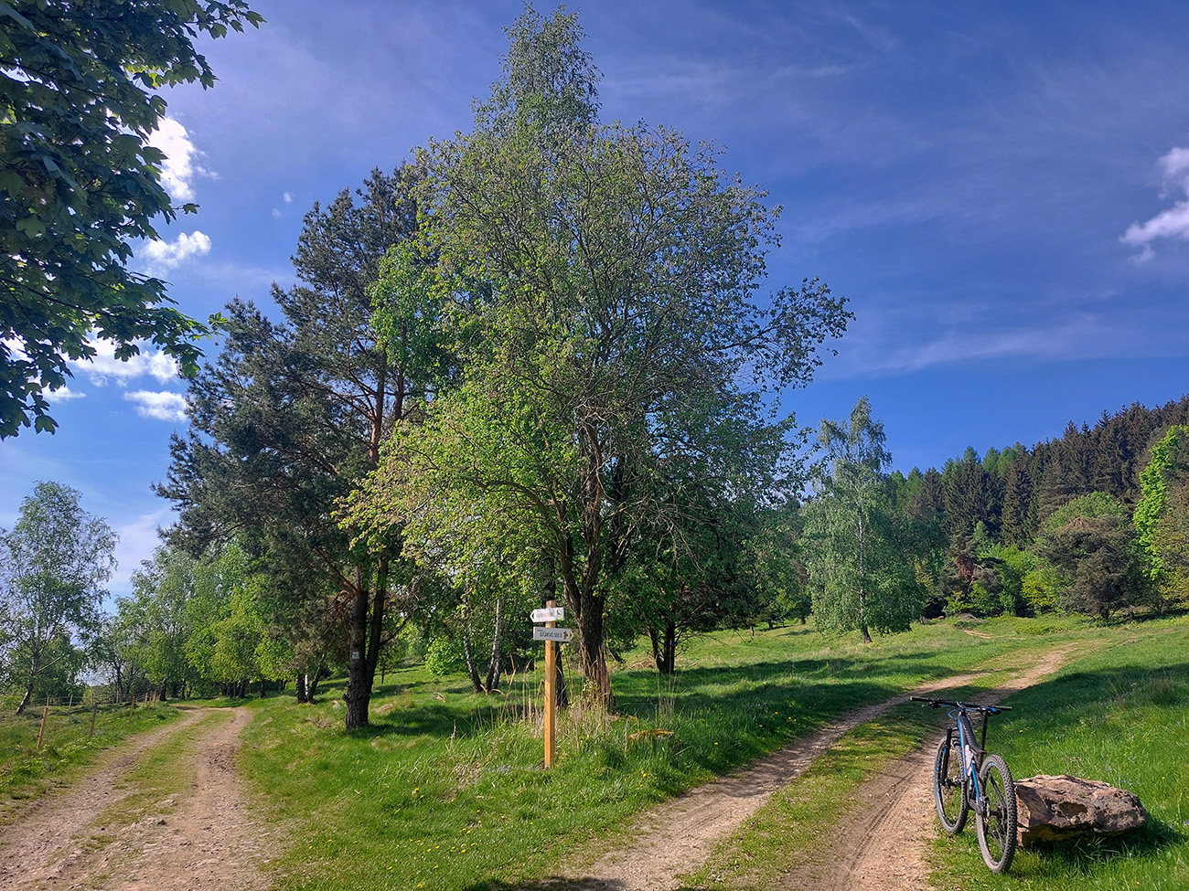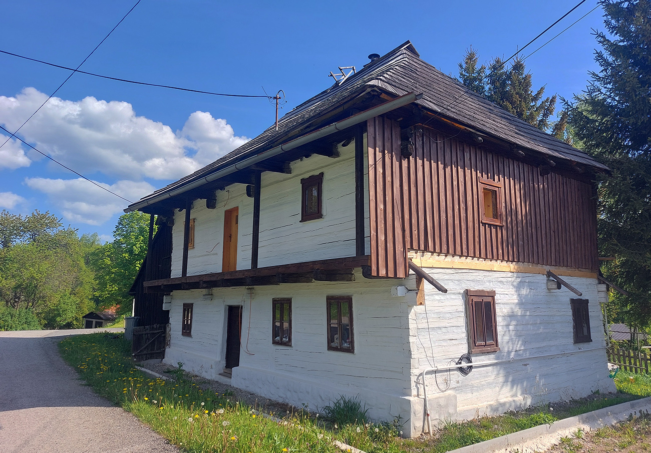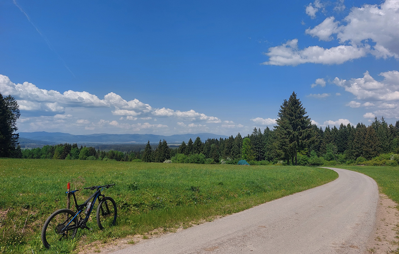Aj tak som sa tam zamotal, pár jeleníc som vyplašil a pár ich prtí použil, kým som našiel cestu smerom na dno doliny traverzovať. No potom už to bolo jednoduché stúpanie, Kunešov neďaleko, nevysoko, cez dva mostíky, jeden z nich v rekonštrukcii. Akurát, že presne na tých lúkach ma muselo niečo pichnúť, v dedine už som musel meniť dušu. Tentokrát som plášť zvnútra poriadne prehmatal, či v ňom niečo neostalo zapichnuté ako minule. Dva razy meniť sa mi nechcelo. Zato začala štrajkovať moja historická pohotovostná pumpa, tak ďalšie zdržanie – doprosovanie, kto by požičal nejakú funkčnú. Vďaka patrí miestnym poľovníkom na chate za dedinou.