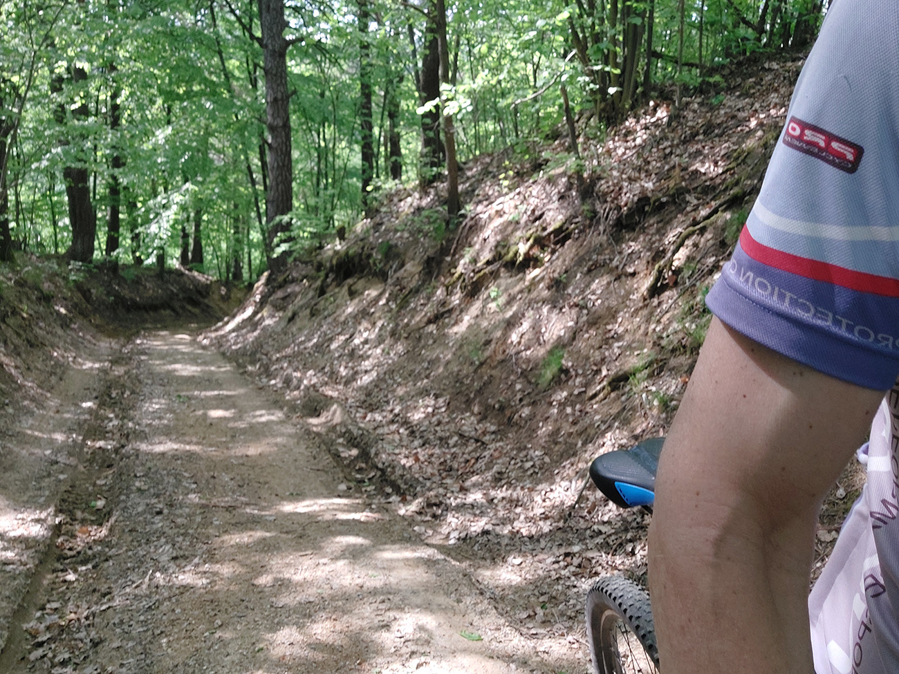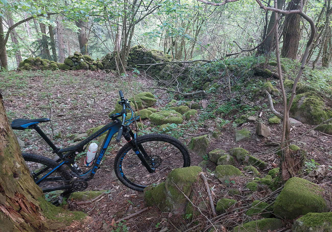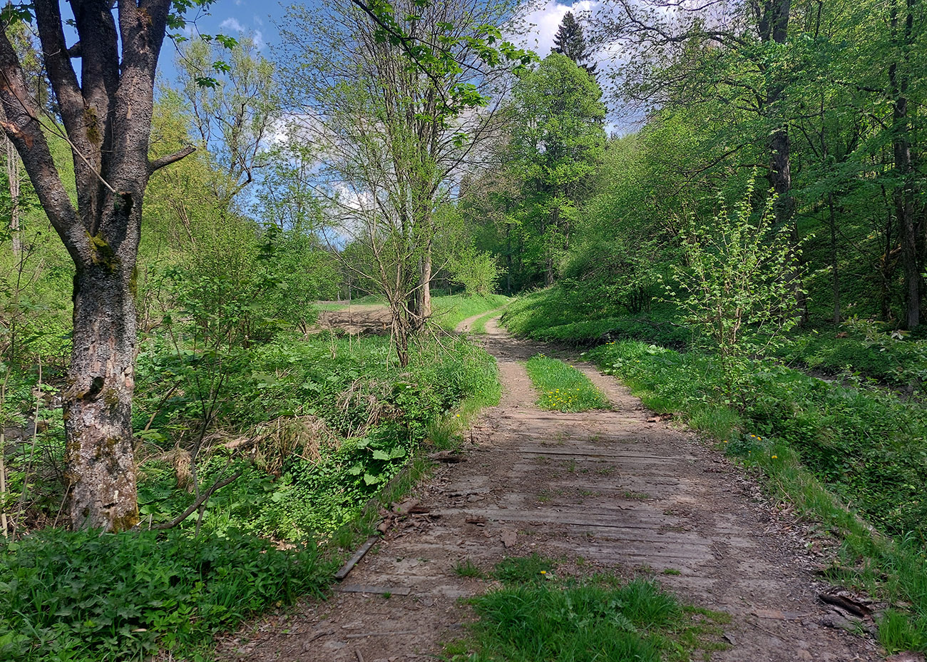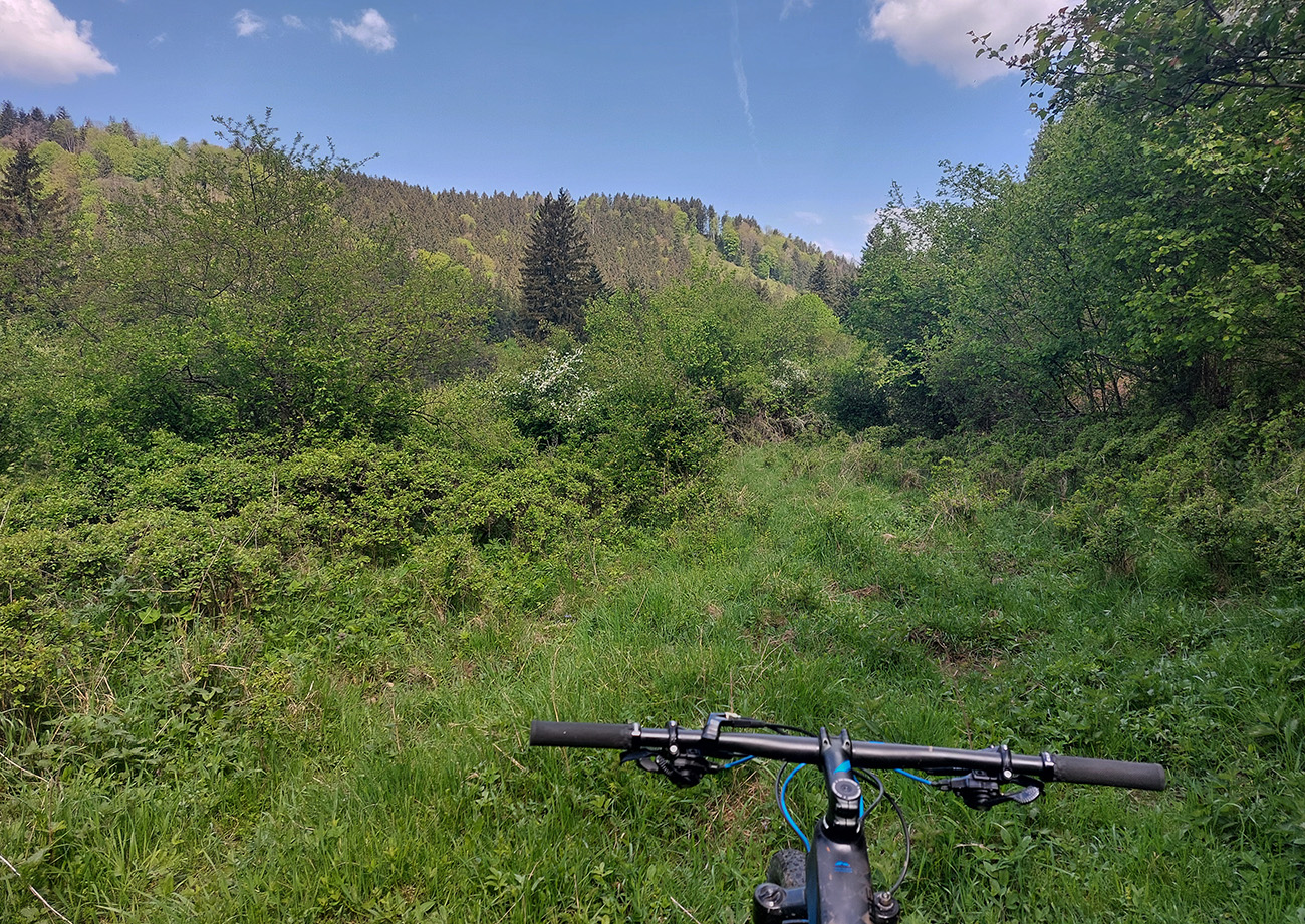 Do Slašťanskej doliny vedie z Bernardova poriadne dlhý a poriadne strmý zjazd – no, opačne by som to na bajku nechcel ísť. Ale v mojom smere komfort: hlina v lesoch, hladká tráva na lúkach, zväčša. Na spodku som sa aj pripojil ku trase, ktorou som tadeto išiel naposledy, z Kopernice po tých dvoch defektoch. Rozdiel bol ale v dojazde na dno doliny, kde ma to znovu vypľulo pri schátraných maštaliach – tentokrát som zamieril doprava, hore dolinou.