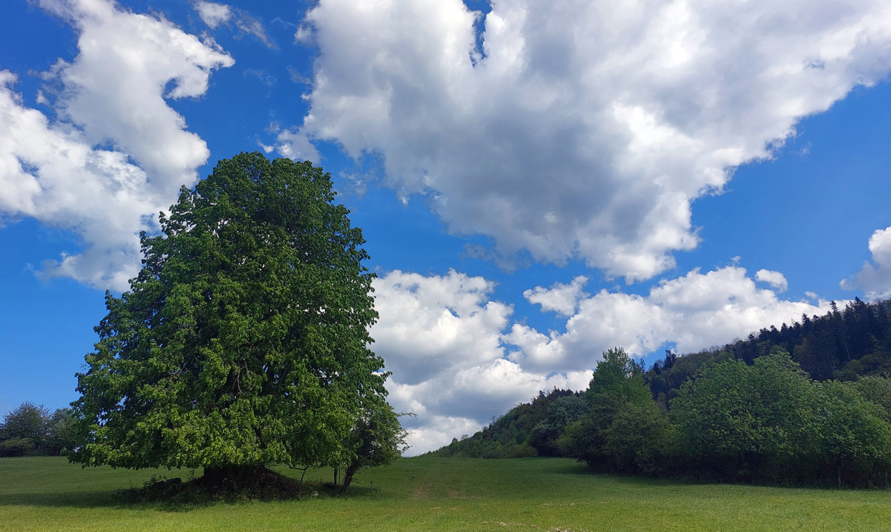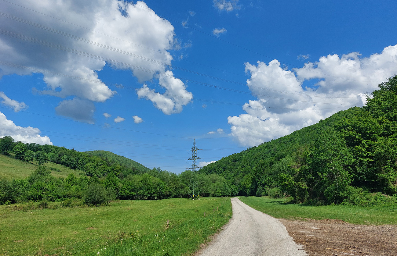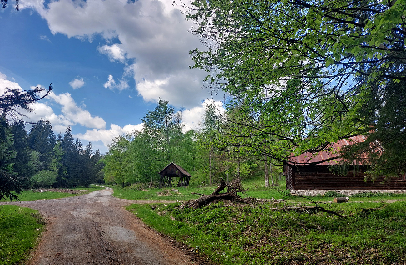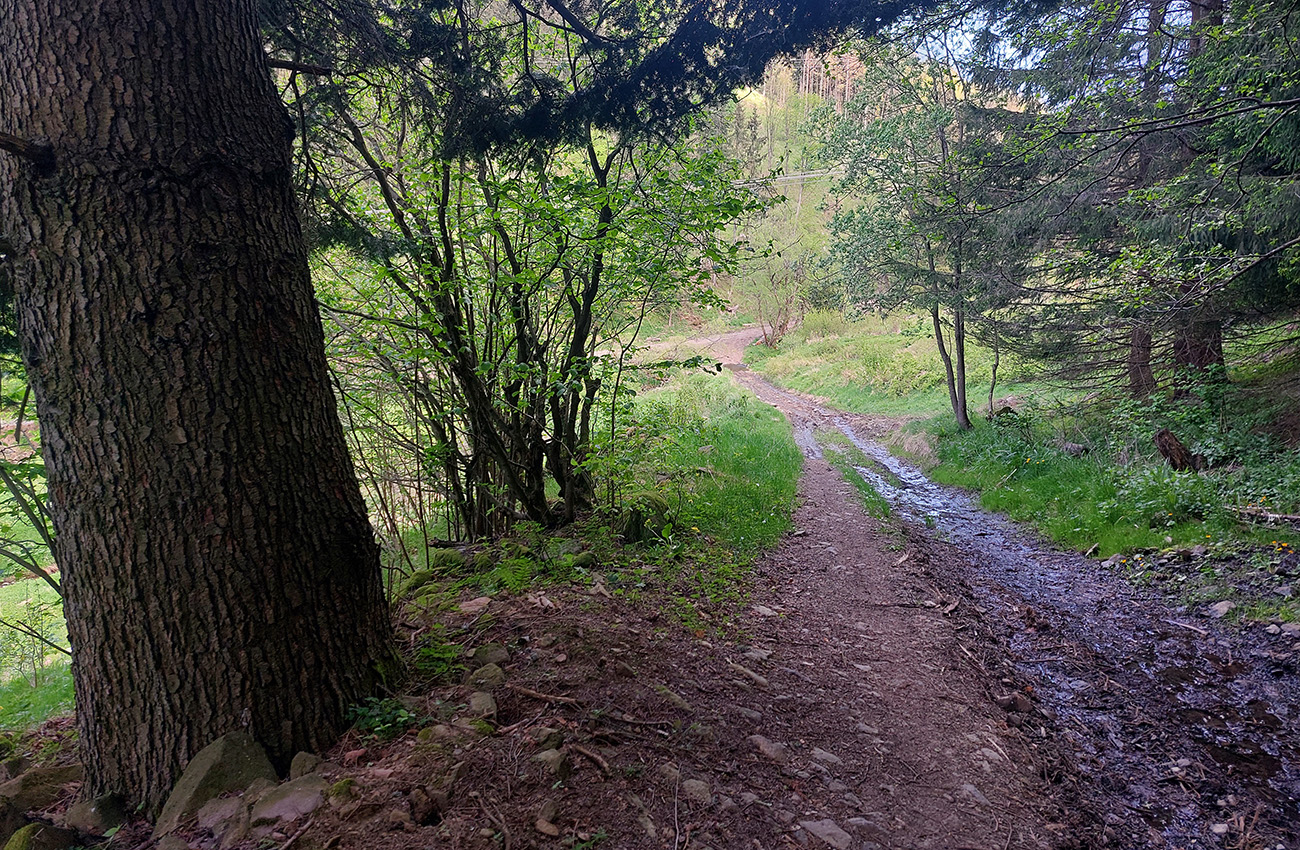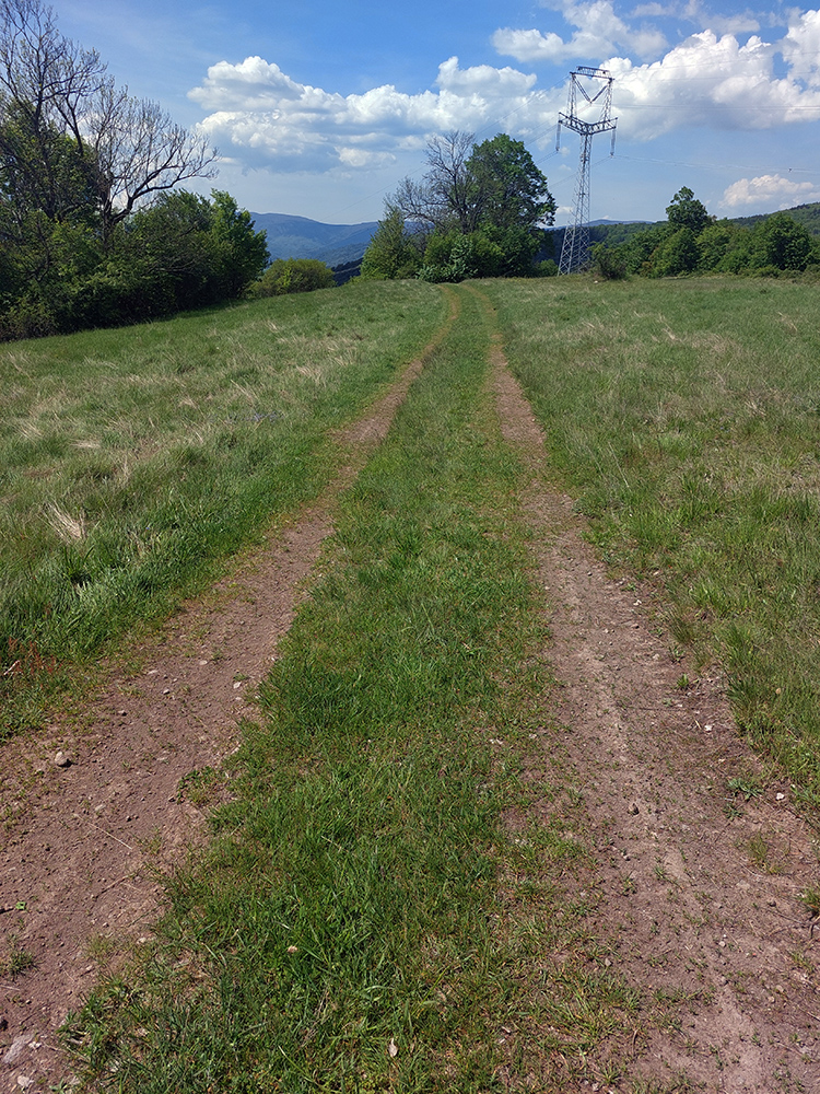 Pár stoviek strmých asfaltových metrov, prudko doľava (akoby niekomu do dvora) a ešte strmší úsek von z dediny, tienistým úvozom po hline a šotoline. Treba sa trochu priprieť, ale ide to, cesta dobrá. Von z lesa na ďalšie veľké lúky – to je preklopenie do doliny potoka Kopernica, a zase na rozľahlých lúkach cesty nezreteľné. Pár orientačných bodov – stromov tam je: