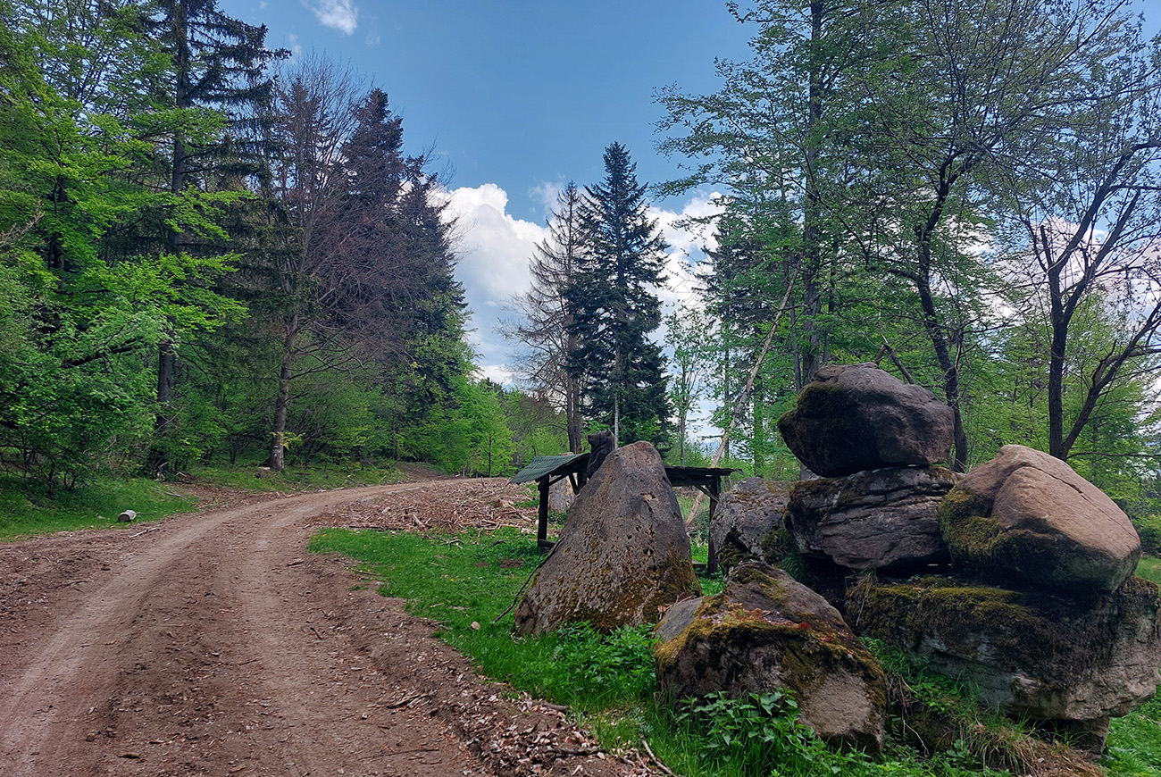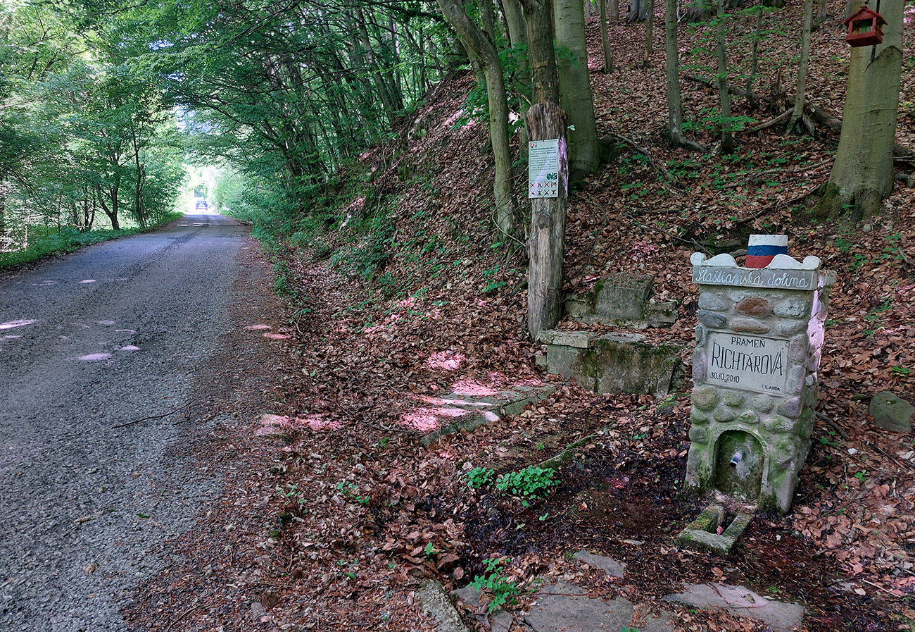 A to bol už posledný výšľap, pohodlný, rovný a dlhý. Najskôr po asfalte, potom po šotoline. Aj popri troch „filandovských“ upravených prameňoch, akurát sa mi hodili na dotankovanie. V doline sa podľa pohľadov na ťažkú techniku a kopy dreva dosť ťaží, no cesta v pohode.
