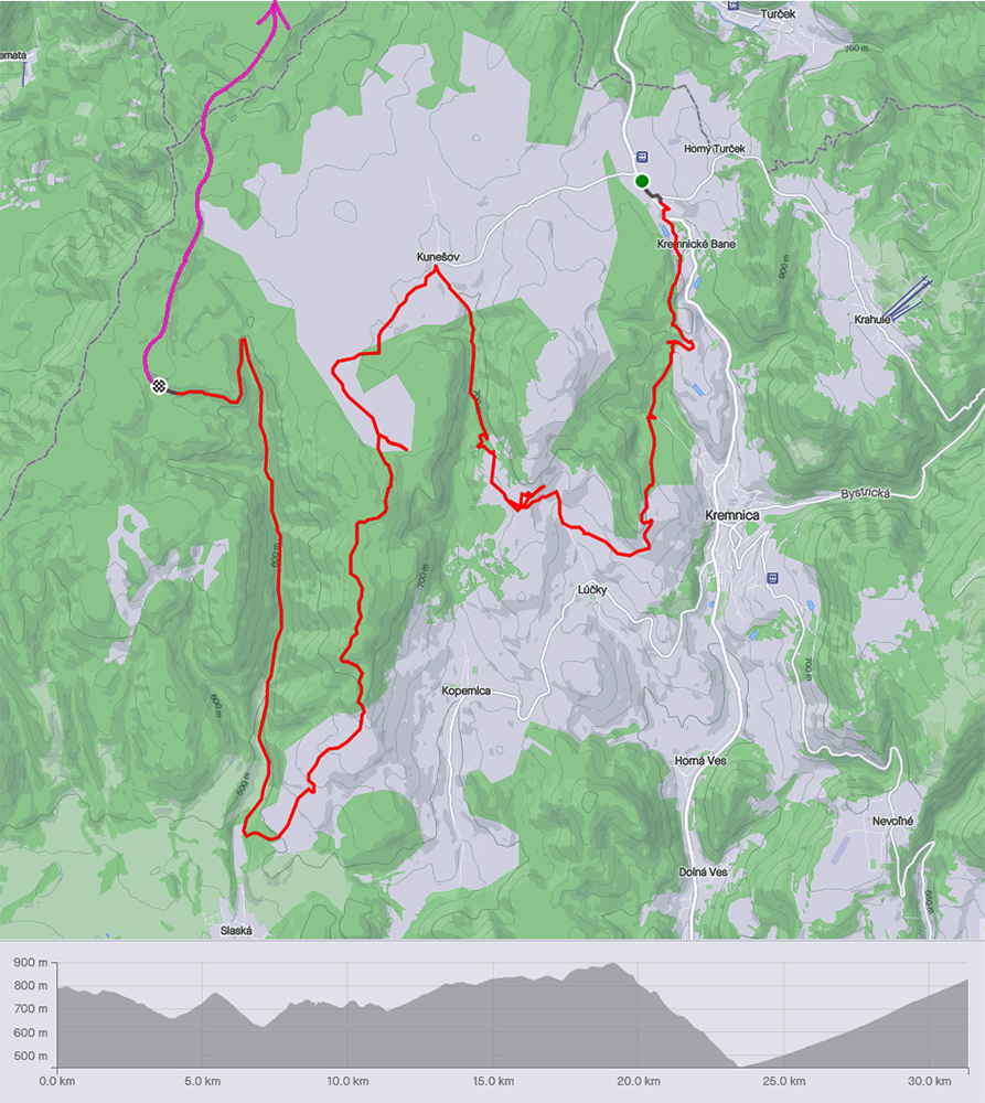 Zato začiatok bol pekný – prevažne v zjazde od vlaku cez starú časť Kremnických Baní, po dobrých cestách pomedzi vypipľané banícke chalupy, popri starých štôlňach a popri prepadlisku Šturec až na rozhľadové lúky nad kremnickou kalváriou.