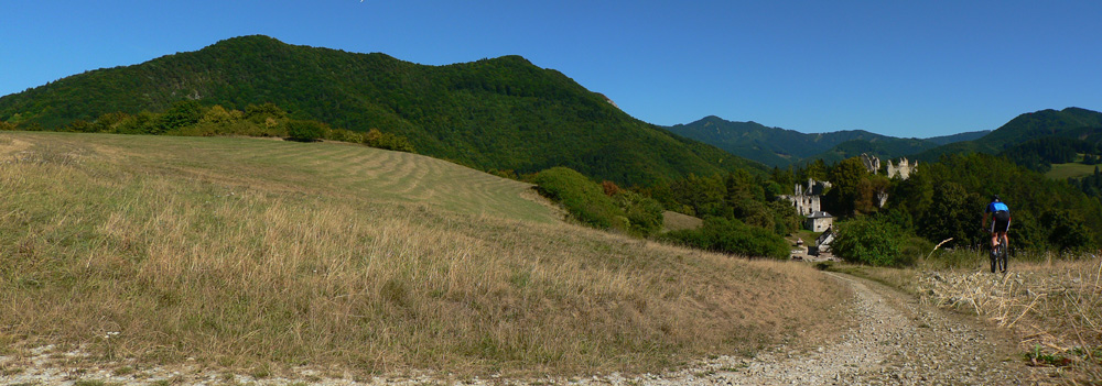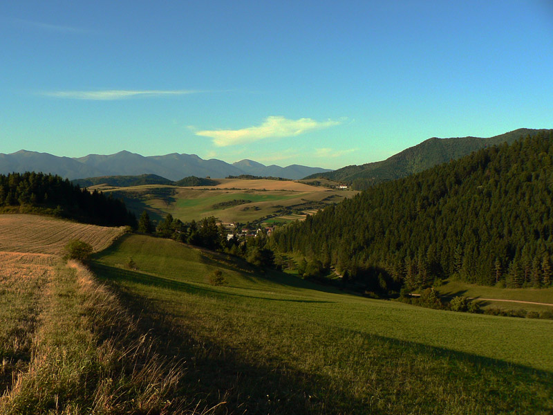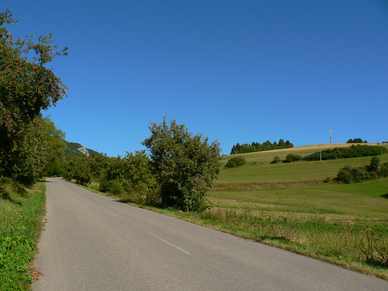 Mierne hore lesom a poriadne strmo hore lúkami – tu keď v lete praží slnko na hlavu a tráva je vysoká, ten výšľap ku Sklabinskému hradu je taký, slušne povedané, spravodlivý :-) Veď už nado mnou dáki mrchožrúti krúžili. Za chrbtom stále Krivánska Fatra, okolo nekonečné vlny pahorkatiny.