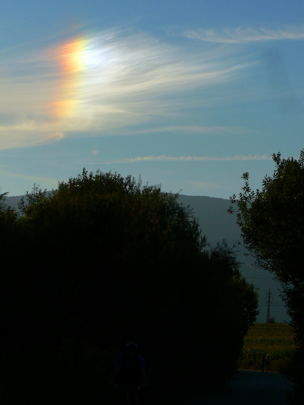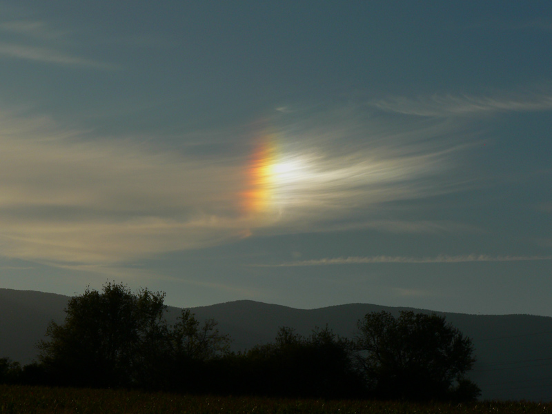 Nazad sa dá cez polia prejsť napríklad k martinskému skanzenu, ak niekto nemá ešte dosť ľudovej kultúry. Ja som to švihol zase cez partizánsku Sklabiňu, ale inou dolinou, a zo Sklabine pomedzi kukuričné polia naspäť na tú cyklotrasu do Košút. Na tých „cezpoľných“ cestách je v takomto suchom počasí jedinou nevýhodou vrstva jemného prachu. Ale zablúdiť sa tu hádam ani nedá, stačí len držať si smer podľa výhľadov na okolité kopce a človek už sa raz vynorí tam kde chcel :-) V mojom prípade som šiel len za zapadajúcim slnkom – a to ma na záver krásneho, bezoblačného dňa odmenilo dúhou. Bez dažďa!