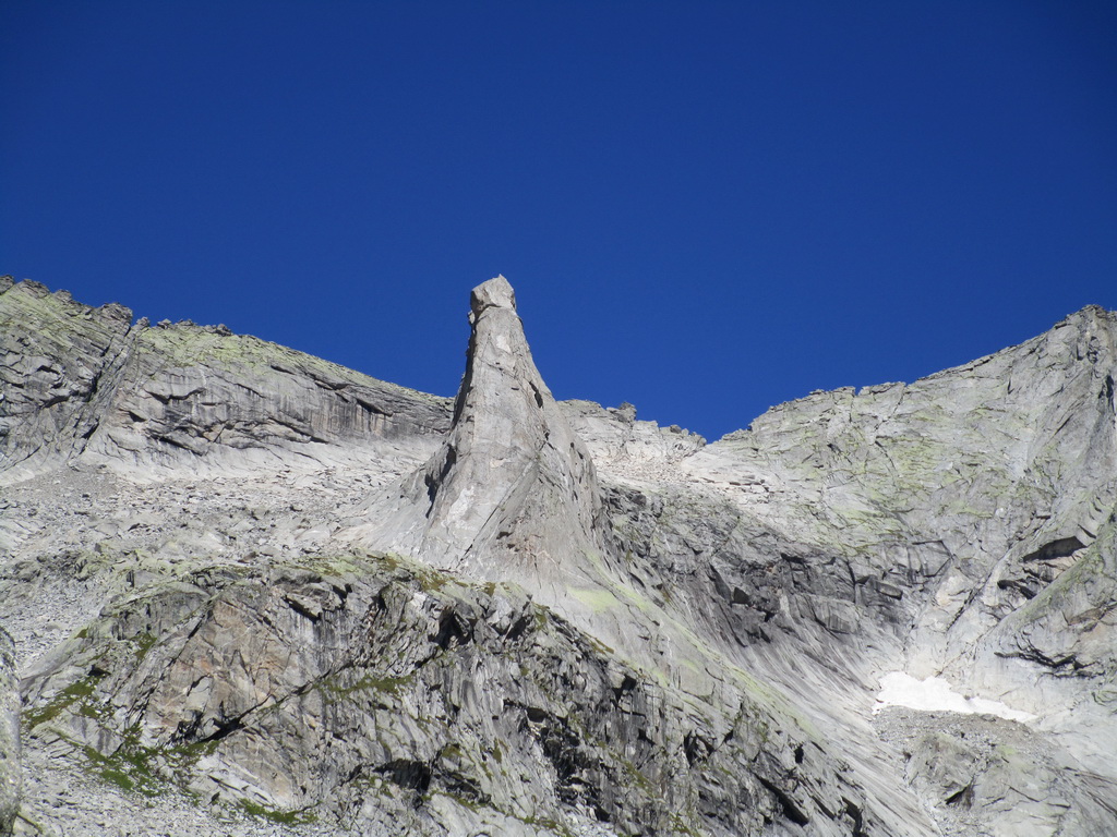 Zakrátko nasleduje úsek komínom, je to najťažšie miesto výstupu, visí tu krátky fix, s pomocou ktorého to dávam aj v teniskách. Naspäť tu bude treba zlaniť. Nachádzam zlaňák, je upevnený o kovový kríž. Uľahčí to orientáciu. Výstup hore vedie bludiskom poličiek, komínov, platní. Stretávam viacero partií zlaňujúcich dole. Musím ich obliezať pomimo. Obúvam si lezečky. Najťažšie miesta už vedú peknými žulovými platňami. Pri lezení hore neustále rozmýšlam a plánujem, ako zostúpim... V batohu mám len 30 metrov repky. Musí to stačiť.