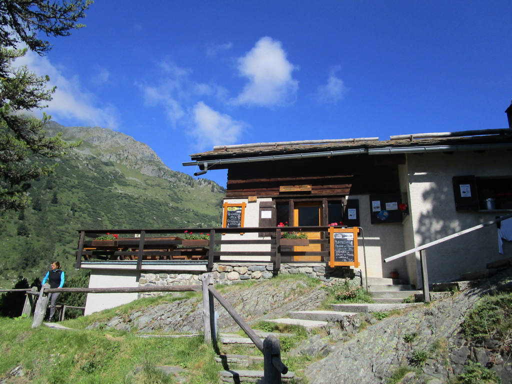 Na chate stretávam chatársky pár. Pamätajú si ma z minuloročnej návštevy. Dozvedám sa novinky: po dokončení chodníku na Pass Casnil Sud chatár Beat pripravuje novú značenú a reťazami zabezpečenú trasu na Monte Rosso.