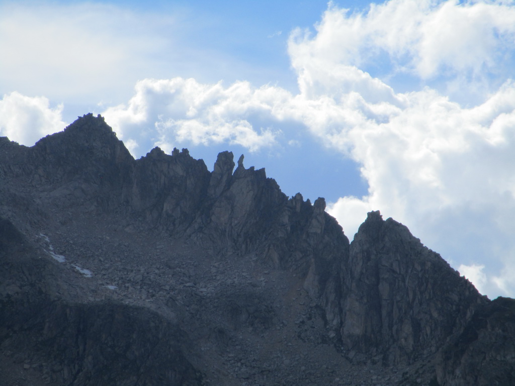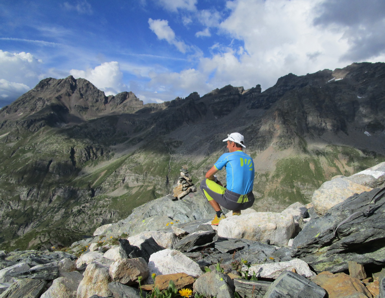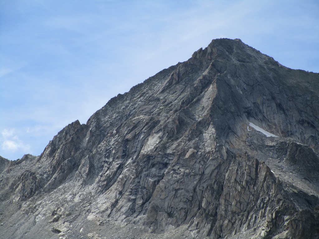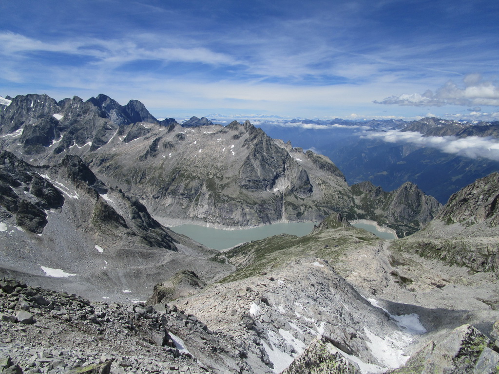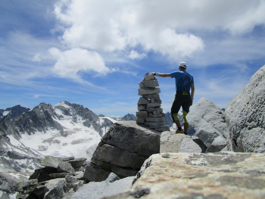 poskytuje parádne a tutové chyty. Jedno exponované miesto v ktorom visia smyčky obliezam sprava a potom už po hrebeni valím až na vrchol. Tu následuje kochanie určite nie tuctovou panorámou. Ešte neviem ako dole takže adrenalín na vrchole neopadá. Pamätám si len, že som čítal: "Po mužíkoch dole smerom údolie Albigna". A naozaj, ani by som neveril, že mužíci vedia tak spoľahlivo ukázať pomerne komplikovaný zostup... no takmer ako na Gerlachu :))) ;)