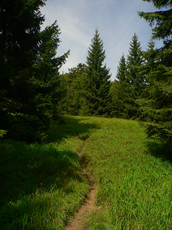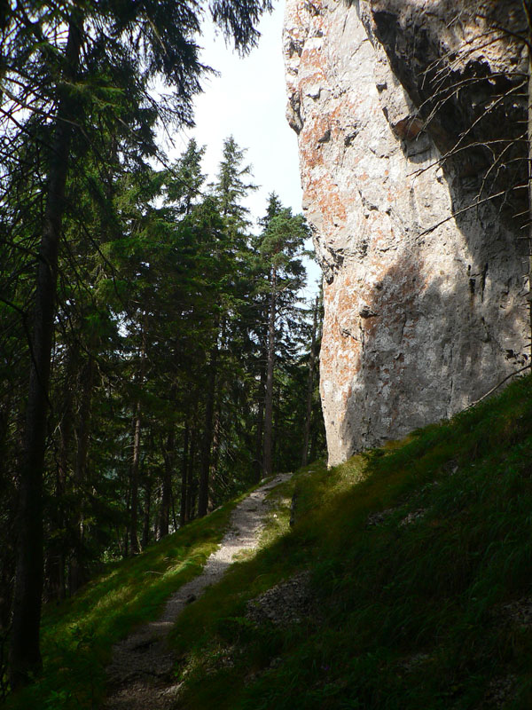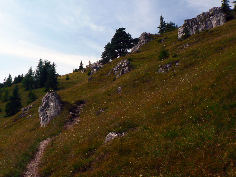 Smerom dole sa treba trocha vrátiť, do sedla. (Chodník z vrcholu na opačnú stranu spomínať nebudeme že? :-) Keďže sa v NP mimo značiek nesmie. Hlavne že tam majú poľovníci zrub...) Dolu do Konského dolu chodník tiež riadne rozmlátený, traverz v strmom svahu. Komu bolo málo, po ceste je ešte jedna vyhliadka (treba odbočiť), hneď ako skončí najväčšia strmina pod sedlom. Potom ešte pár skalných stien popri chodníku a už len nekonečné klesanie čoraz menej strmým Konským dolom až do Gadera – priamo k hotelu.