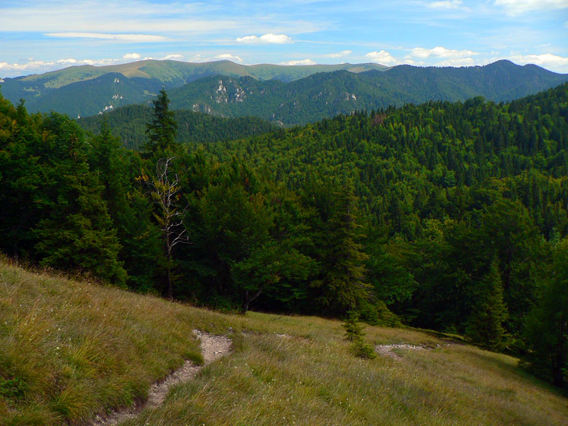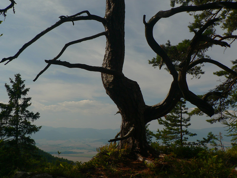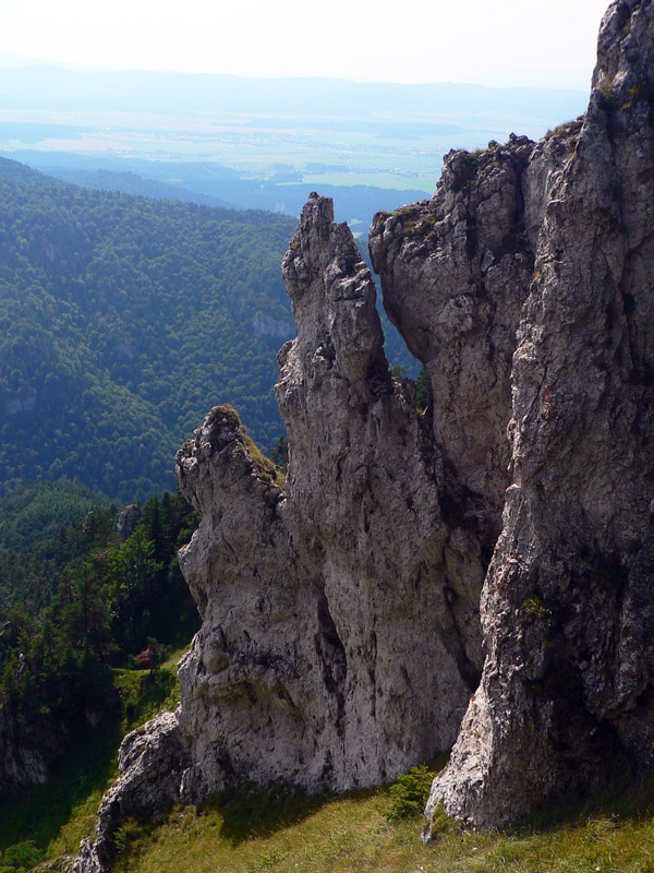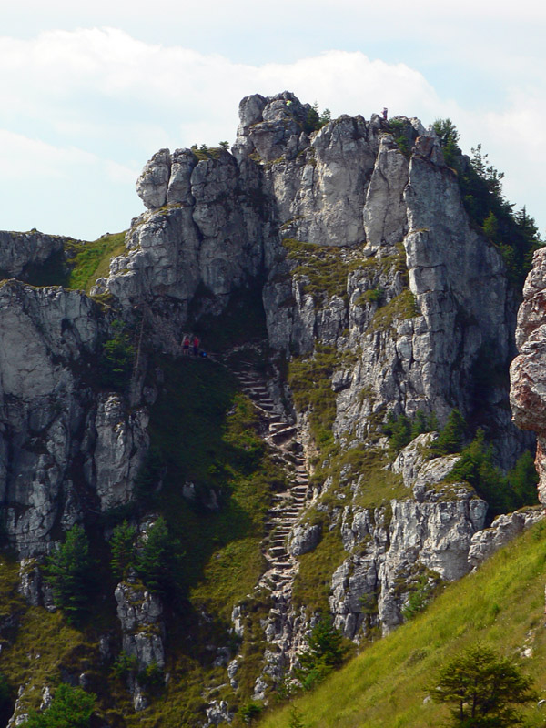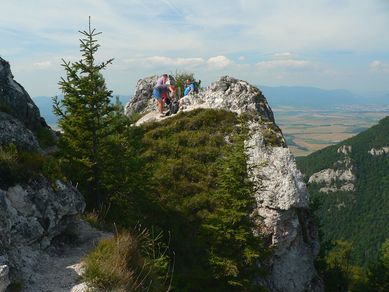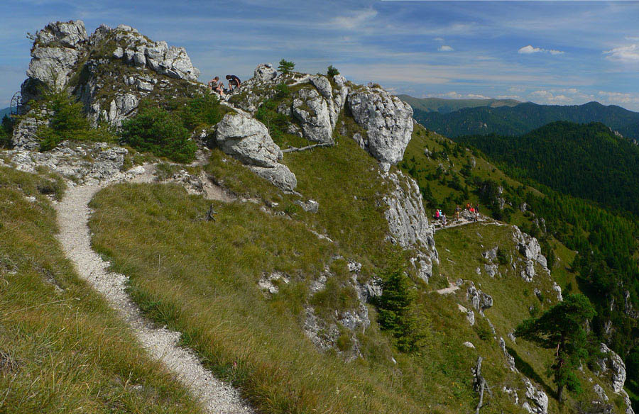 Pod sedlom Misa sklon už menší, chodník lezie z lesa a nad sedlom sa otvárajú výhľady – najmä dozadu na hlavný hrebeň. Zadná Ostrá už je na skok, kľučkovaním pomedzi bralká a stromy. A z nej hrebeň, ostrý ako britva, na tú hlavnú Ostrú (1247m). Na záver výstupu spestrenie – schody ako do neba, pár metrov reťazí a prielez skalným oknom. A zhora rozhľad: rovných 360! Len ľudí je tu vždy ako hadov.