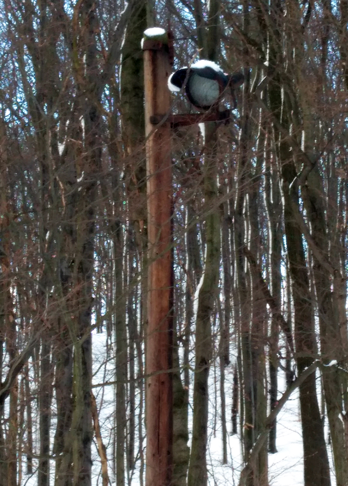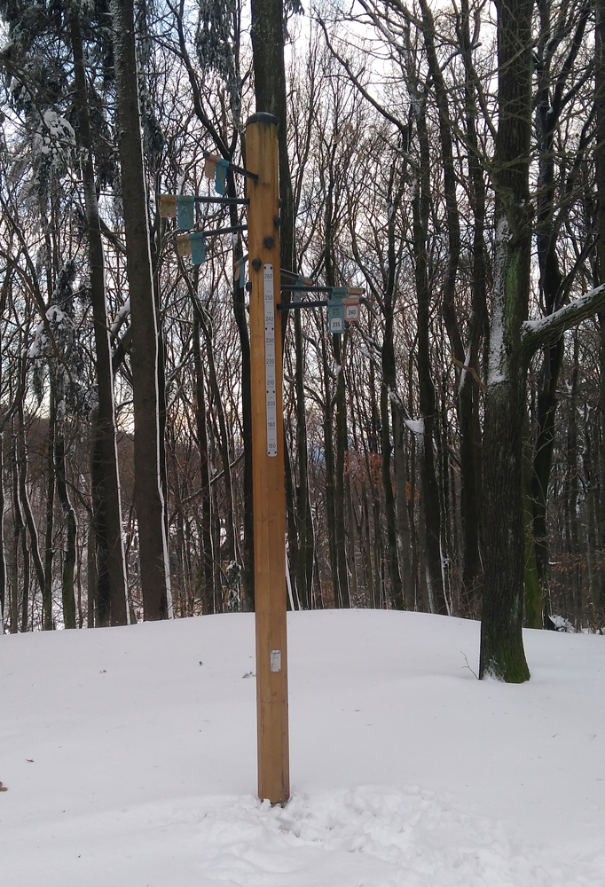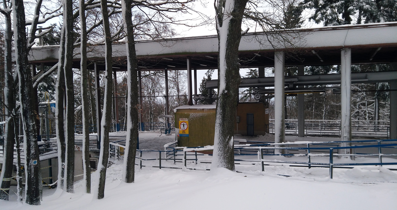 Idem lesom, borím sa ako ľadoborec Lenin cez kôru, dobrých 20 až 30 cm až ku tráve a bodliakom. A tu zrazu, už keď vidím ten cieľový svah, ledva že nie do stĺpa čelom dzignem... Boha, kde sa tu vzalo toto železo? V lete som si nič nevšimol... Ale to som zle pozeral, lebo práve križujem dráhu vleku. Fotky povedia samozrejme viac. Obzerám hornú vratnú stanicu s lanáčom, ale žiadny TUV ani DIN štítok s rokom výroby nenájdem. Tak musíte mi pomôcť a zaloviť v histórii, že odkedy je toto tu, Jano už žiaľ nenapíše priamo. Išlo určite o kotvový vlek s navíjacím lankom pre dve osoby. Zhora to vyzerá sľubne, 400 m lyžovačky. Realita je ale iná... Aj dole kopcom ledva idem, trojcentimetrová kôra vôbec nechce pustiť, stopa po mne vyzerá ako po Keňanovi, no utrpenie, taká jazda už dlho nebola... Po ceste obzerám, že na stĺpoch je aj osvetlenie na nočné lyžovanie! Dokonca aj žiarovka nerozbitá tam je, síce to už celé nefunguje a má silno muzeálny charakter, no ten genius loci tam ožíva stále. Dojazd k spodnej stanici vleku je lepší, betónkôra povolila, zo stromov popadala voda, namočila sneh, je to mäkké. Ani v stanici nič na datovanie...Na dva zámky zamknuté, sprejeri tu už boli tiež.