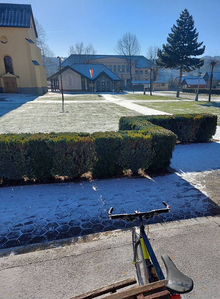 Ale na tlustých gumách sa dalo, zase popri cmiteri som zhrkotal do Lesnej, dal kolečko dedinou a našiel som si hádam jedinú lavičku na slnku, priamo v areáli pred známym betlehemom. Energiu do brucha, poopaľovať sa minútku pri tom, a davaj nazad. Konečne nebude slnko do očí pichať. A aj to dáko rýchlejšie svišťalo, samozrejme som išiel viac z kopca. Ale taký zošup do Ďurčinej popri tom cintoríne pekne opatrne, takmer krokom, po uzučkej krajnici. Aj inde bolo treba tak.