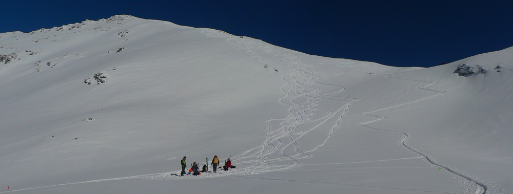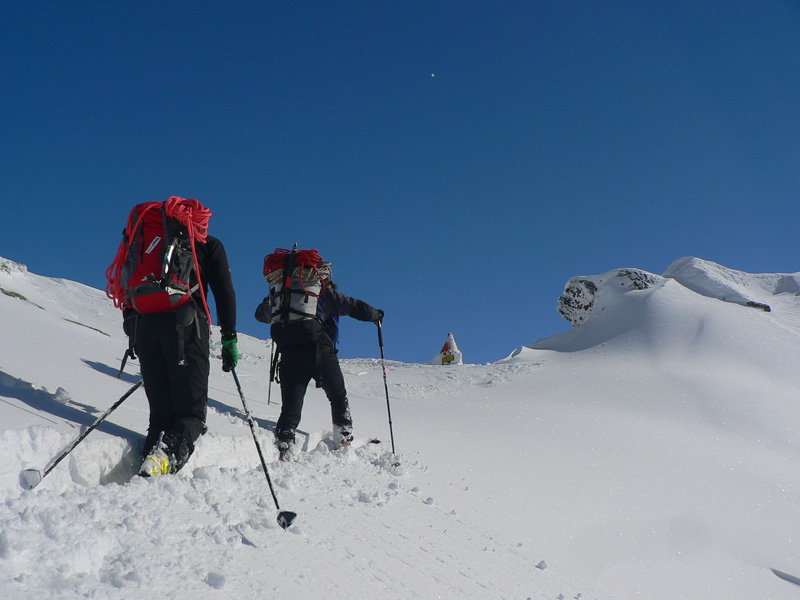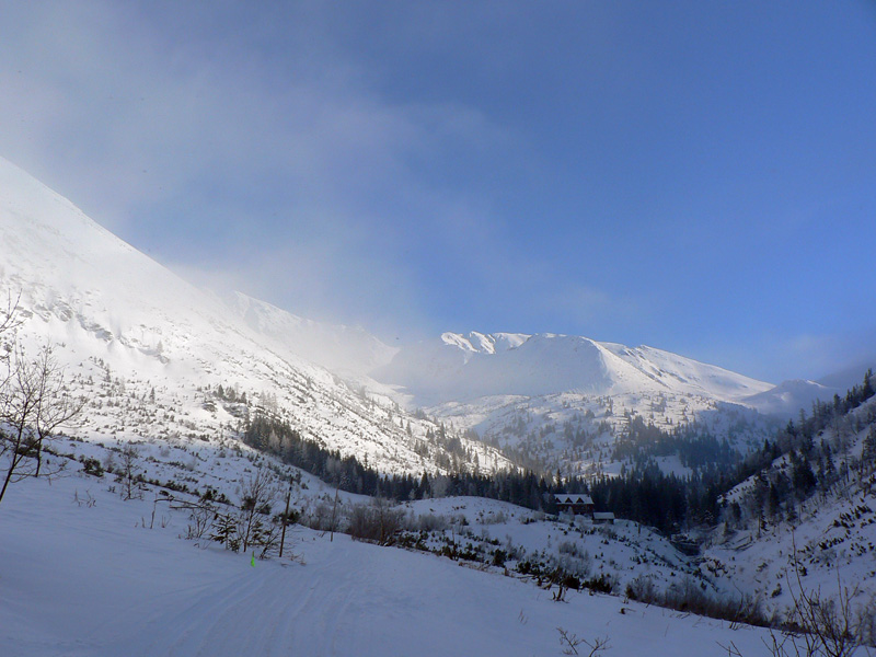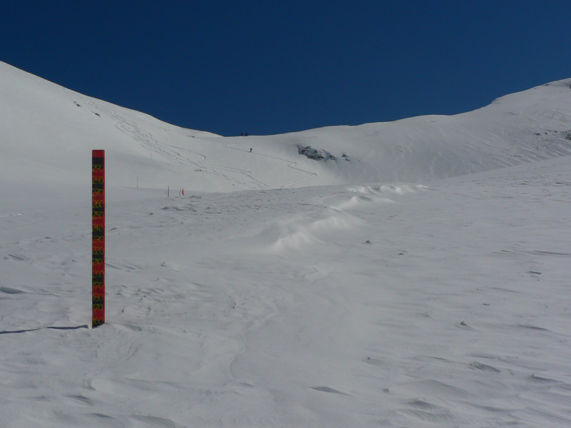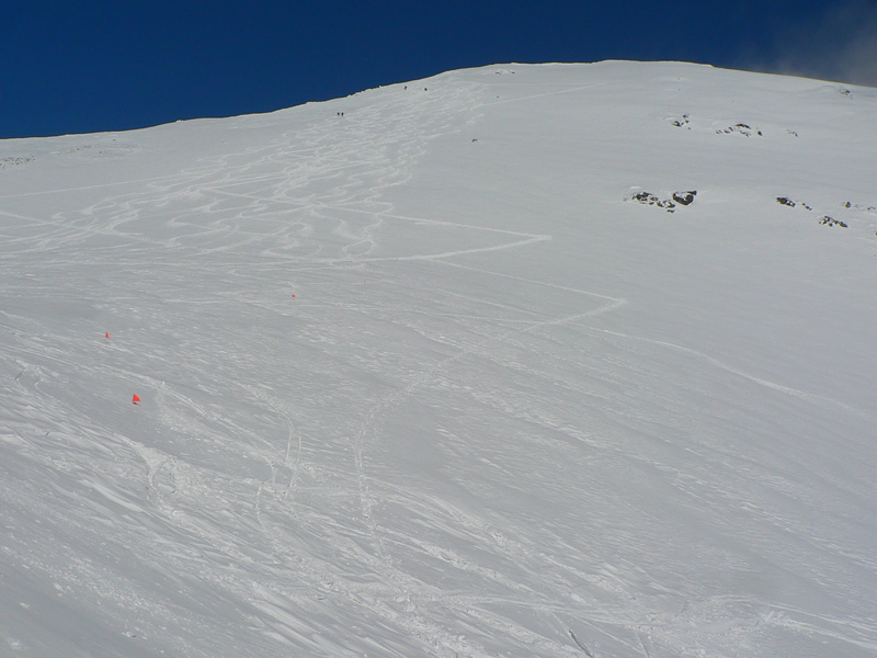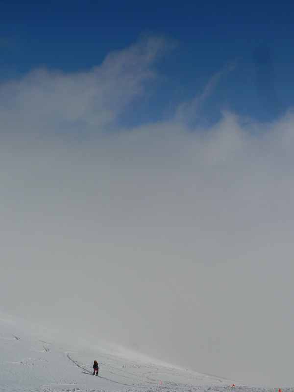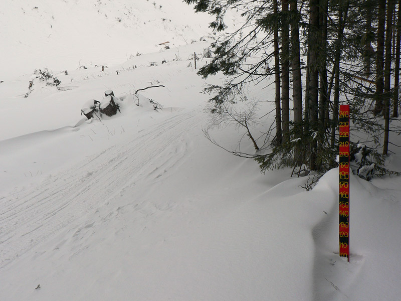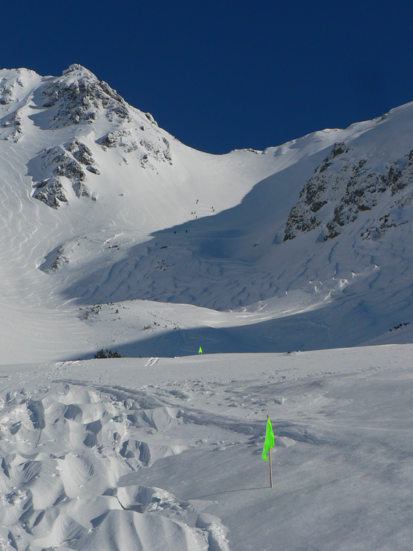 Tak aj bolo a po rozohriatí hore cestou (inak zamračené, pofukovalo, aj sneh popadával, čo to???) som sa nad chatou napojil na komfortne vyleštenú čerstvú stopu, čím vyššie, tým hlbšiu. To už sa mraky trhali o 106 a modrej bolo čoraz viac nad hlavou. Na Terasu viedli parádne serpentíny, ale okolo hnusná kôra, lyžovačka tadeto dolu bude o držku, kým sa to nerozjazdí. Hore sa z troch strán ozývalo nadávanie organizátorov na hlboký a ťažký sneh :-) Pod Smutným sedlom bolo vidieť plaziť sa deväť bodiek, vybral som sa najskôr tam. Dobehol som ich ale až hore (nie naschvál!), tak som moc nepomohol, ale priznám sa že sám by som hore nešiel. Zo severu tam toho bolo nafúkaného strašne moc a na slnku už to aj moklo. Lyžba nazad na Terasu nič moc, hore hlboký a ťažký, dole tvrdé dosky.