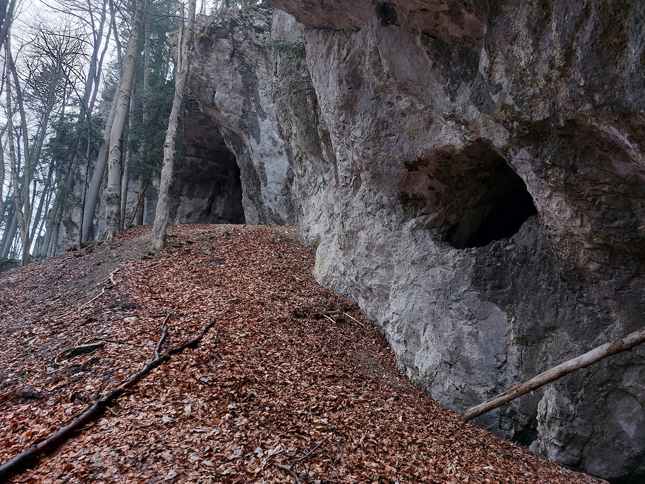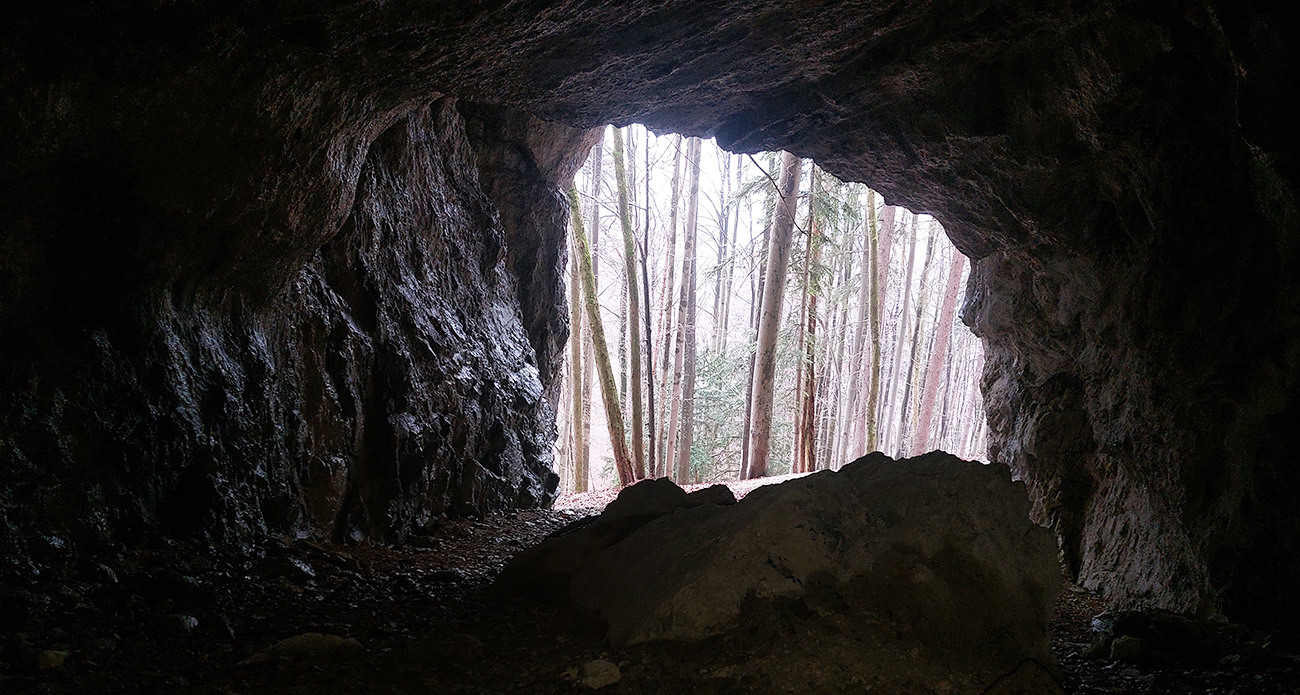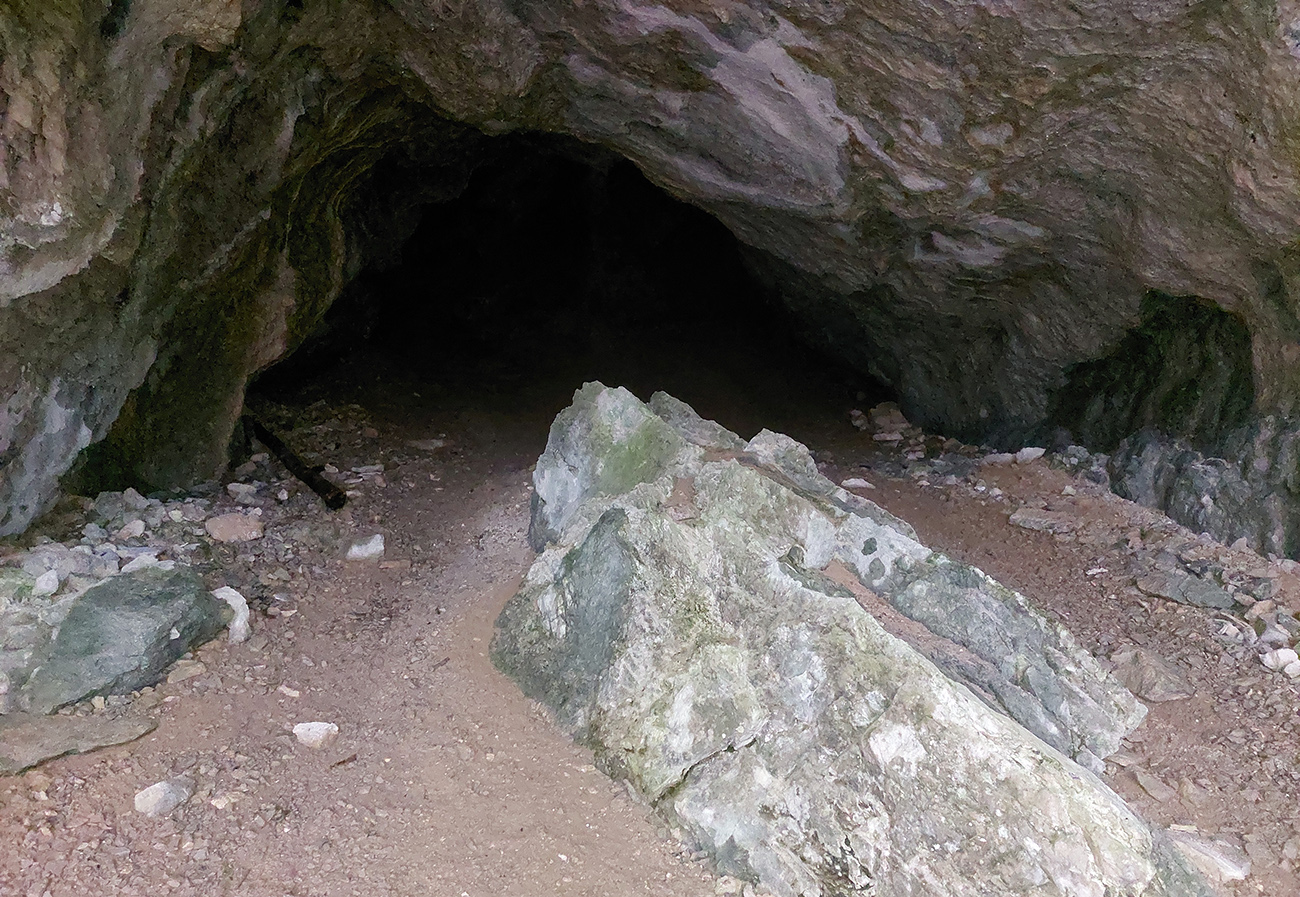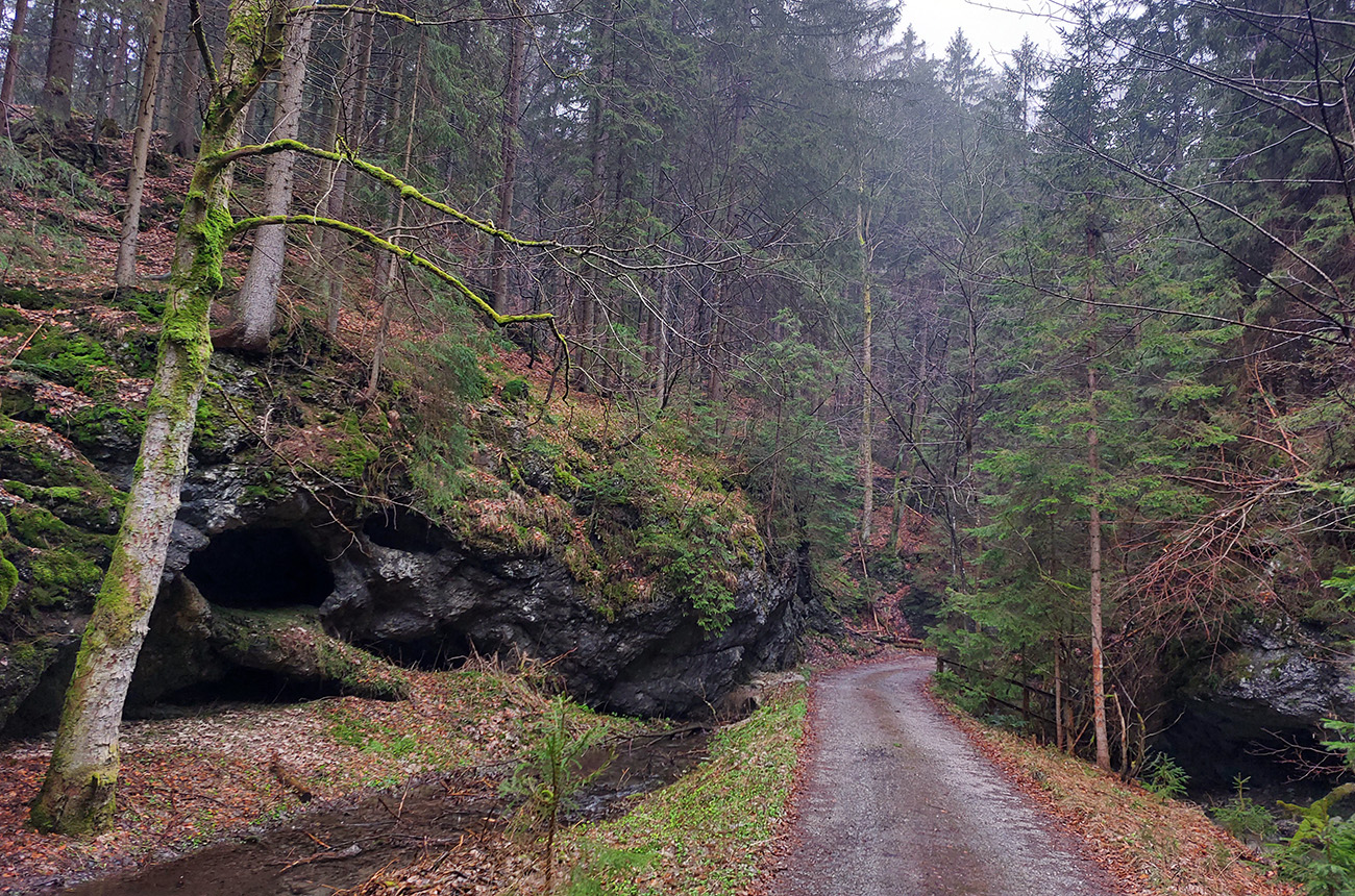 Dolina Túfna je najkrajšia na spodku. Najhrboľatejšia. Potom sa chodník dostane vyššie nad potok, potok zmizne a keď nastane zákruta doprava, treba sa obzerať po nezreteľnej odbočke k jaskyni. Vedie od bralka pri chodníku priamo popod steny k portálu jaskyne. Oplatí sa tam pomotať, aj dnu zájsť: