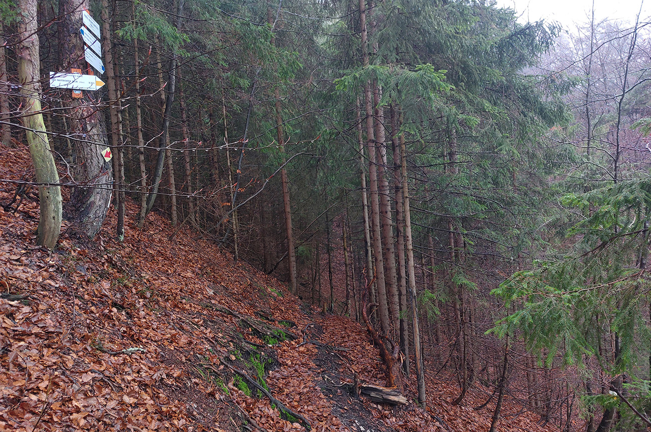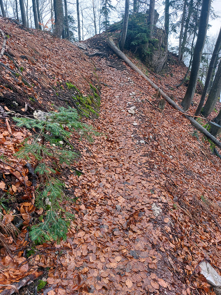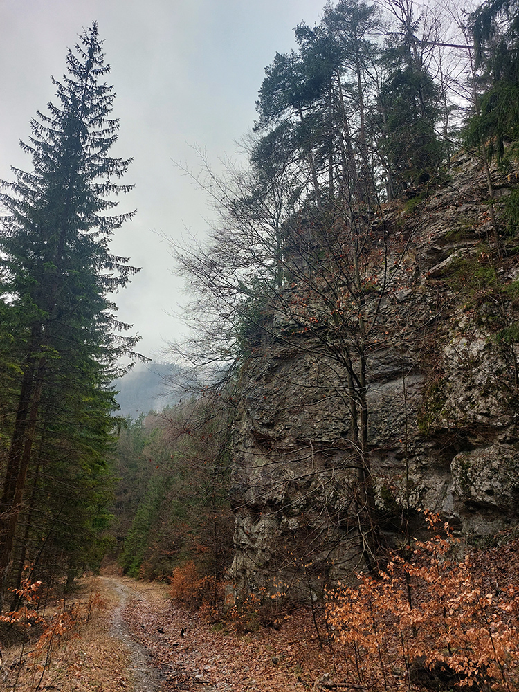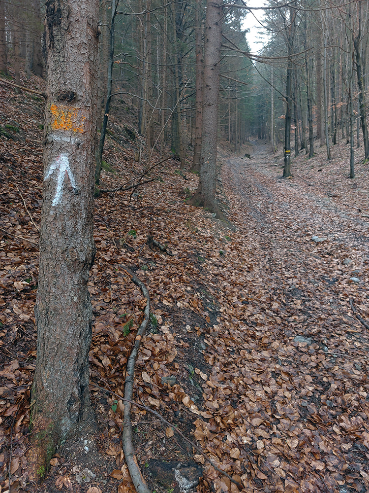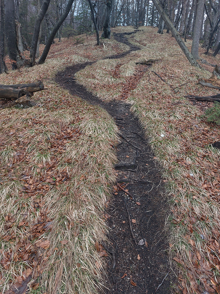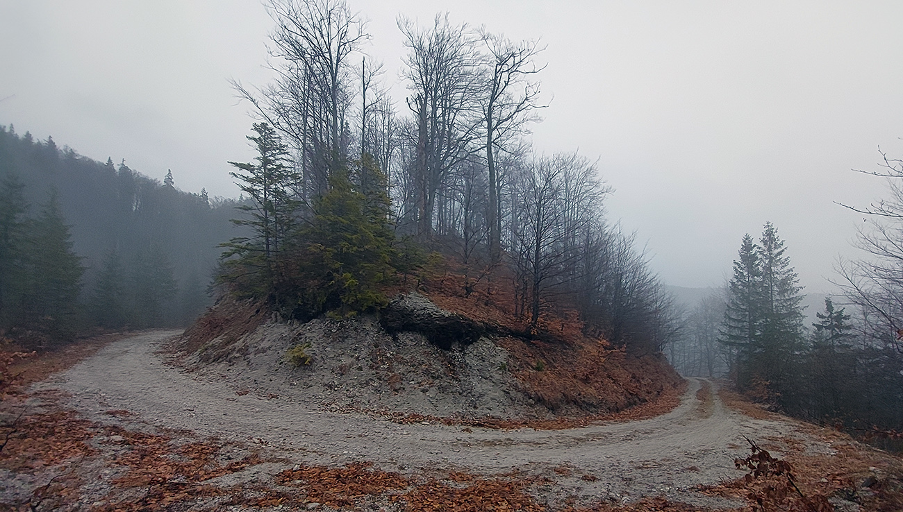 Už z diaľky vidím, že na Drienku sedí mrak (nižšie sú mraky tiež, som v nejakej medzivrstve), no ešte nie som rozhodnutý, kade dole, tak idem hore. Prestalo konečne mrholiť, ale chodník aj tak suchý (aj predtým), veď ako na vápencoch bralnej Fatry. Hore len fotím to pravé, plnotučné mlieko a davaj nazad. Neznačený poľovnícky chodník si odpustím, lebo keď si pomyslím, do akého lesohospodárskeho mordoru dole ústi...