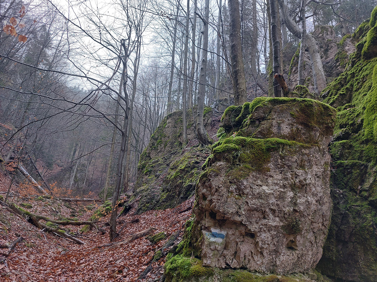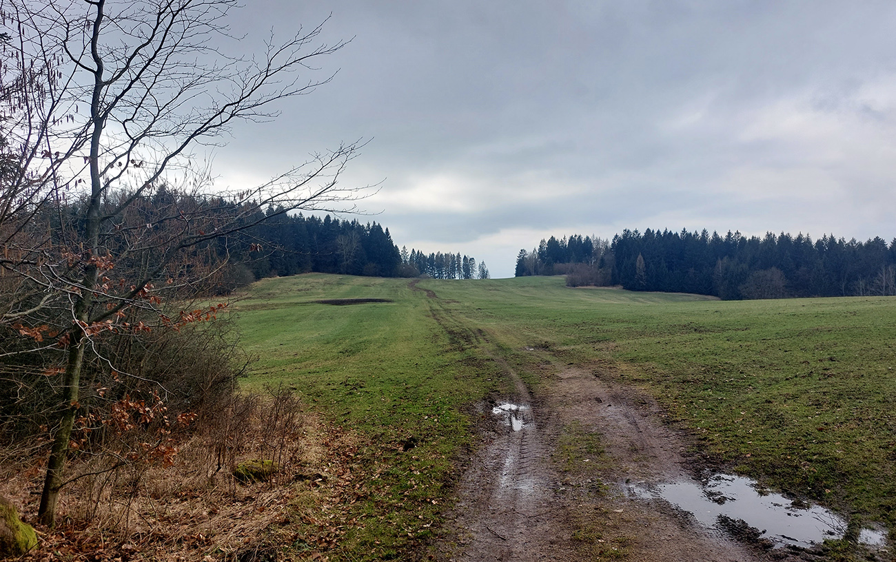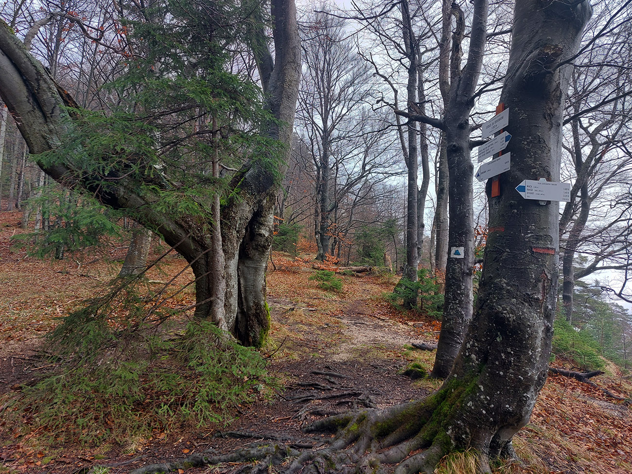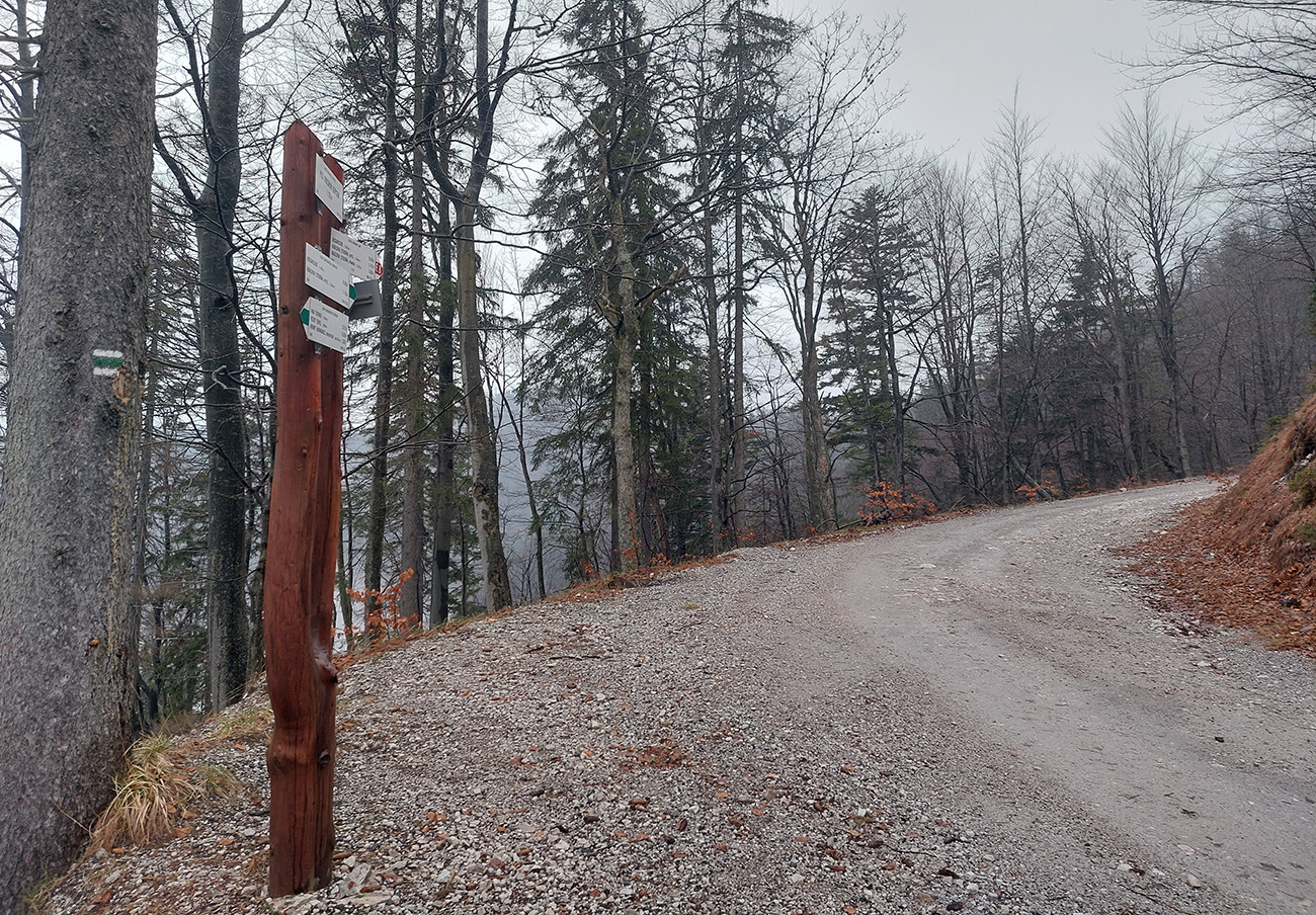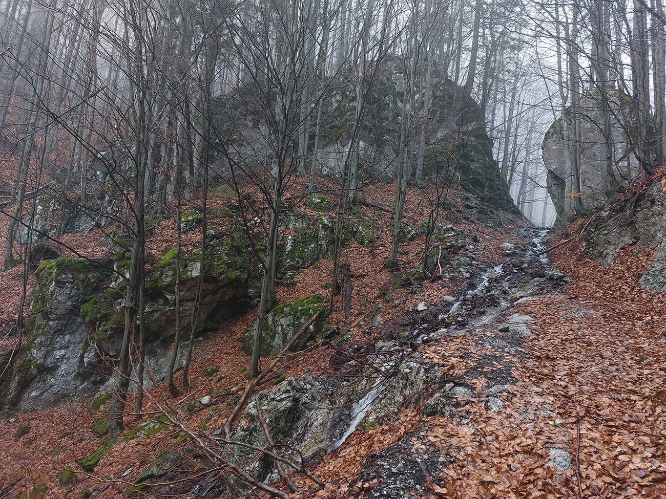 Už z diaľky vidím, že na Drienku sedí mrak (nižšie sú mraky tiež, som v nejakej medzivrstve), no ešte nie som rozhodnutý, kade dole, tak idem hore. Prestalo konečne mrholiť, ale chodník aj tak suchý (aj predtým), veď ako na vápencoch bralnej Fatry. Hore len fotím to pravé, plnotučné mlieko a davaj nazad. Neznačený poľovnícky chodník si odpustím, lebo keď si pomyslím, do akého lesohospodárskeho mordoru dole ústi...