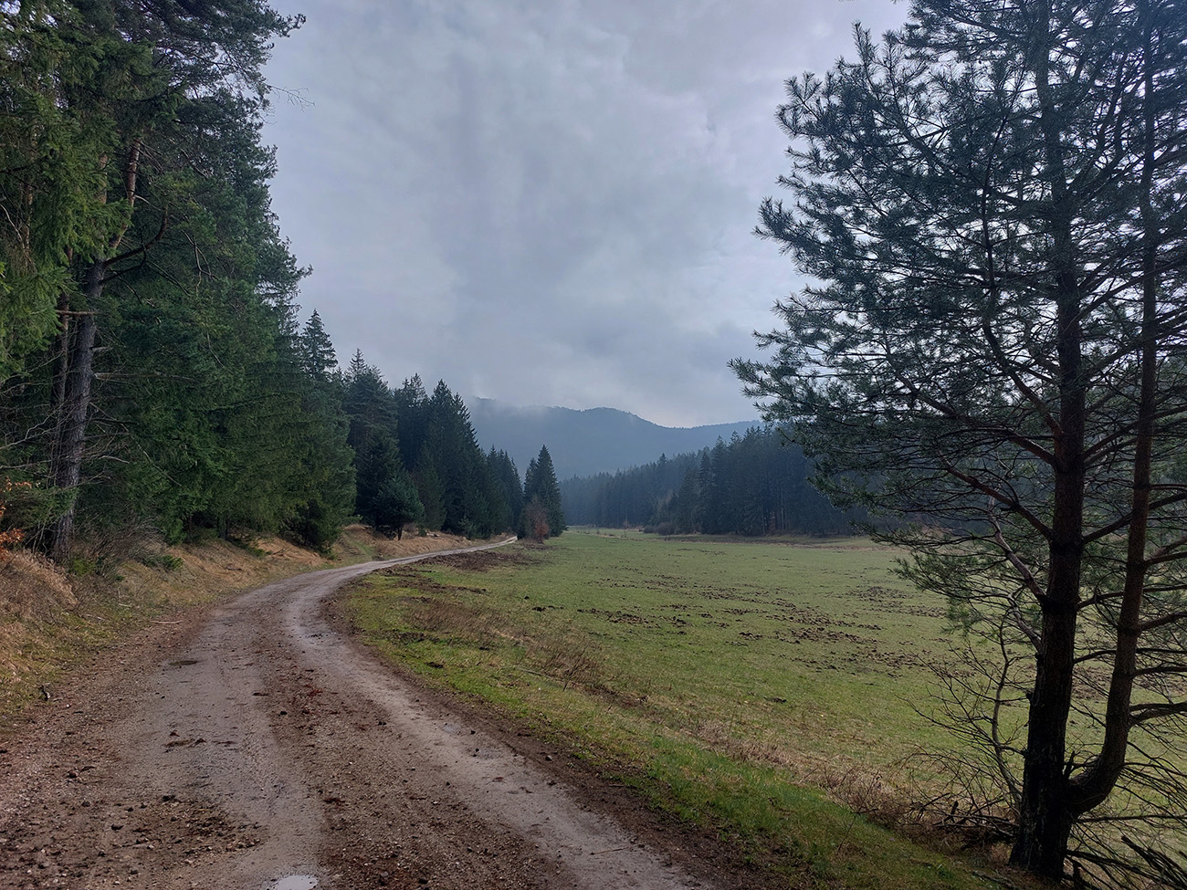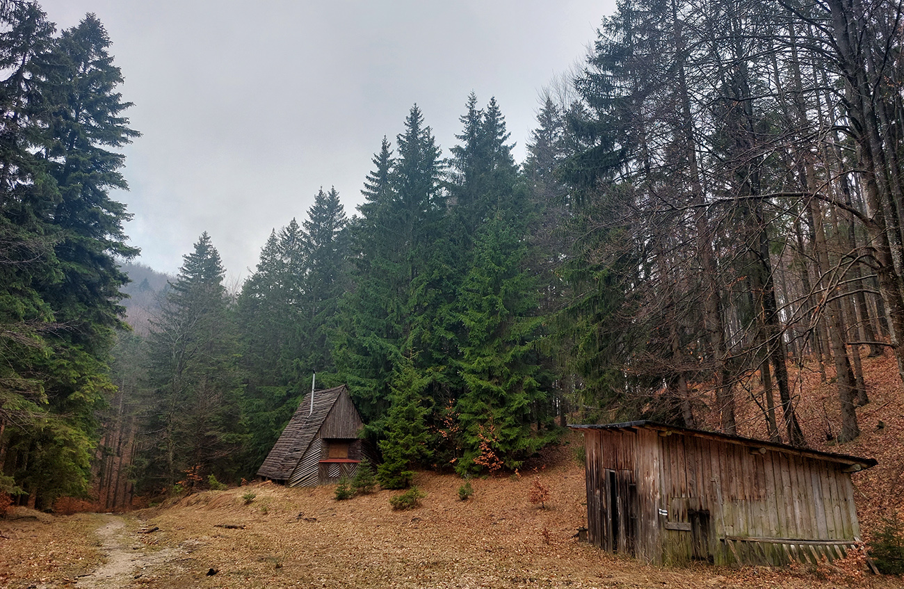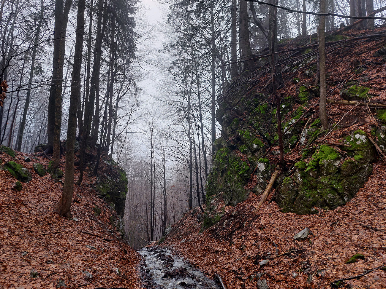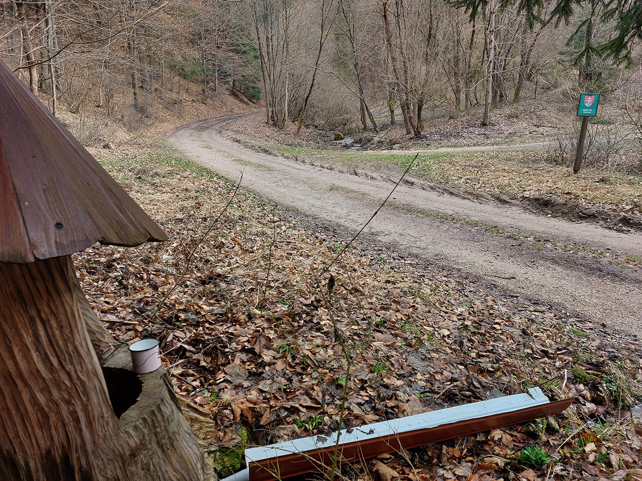 Už z diaľky vidím, že na Drienku sedí mrak (nižšie sú mraky tiež, som v nejakej medzivrstve), no ešte nie som rozhodnutý, kade dole, tak idem hore. Prestalo konečne mrholiť, ale chodník aj tak suchý (aj predtým), veď ako na vápencoch bralnej Fatry. Hore len fotím to pravé, plnotučné mlieko a davaj nazad. Neznačený poľovnícky chodník si odpustím, lebo keď si pomyslím, do akého lesohospodárskeho mordoru dole ústi...