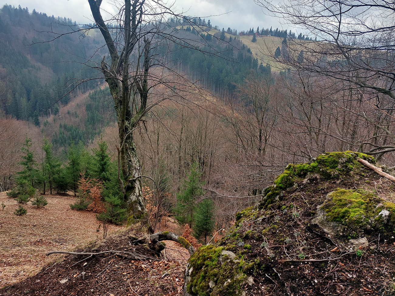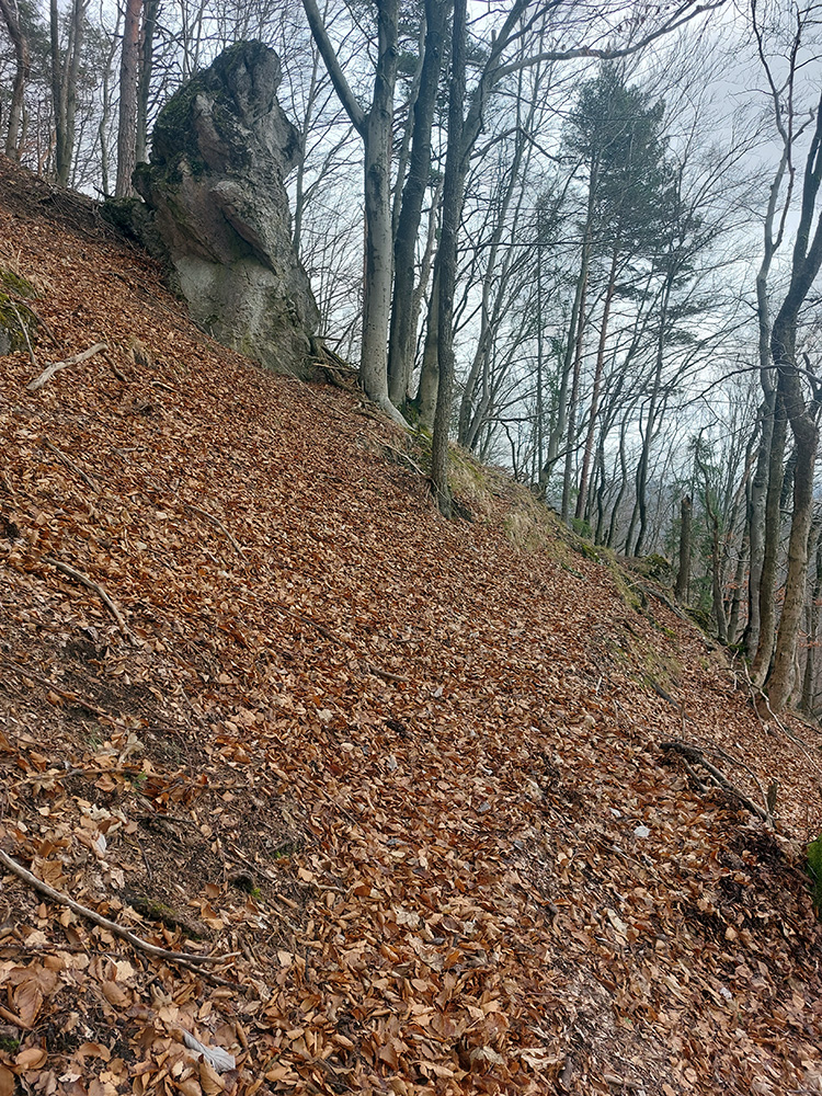 A tak aj je – od konca cesty pokračuje zreteľný poľovnícky chodníček, pomedzi pekné skalky. Síce sa po chvíli stratí v spleti jeleních prtí, ale neva. O chvíľu už vidím naproti na Čremošnianskych lazoch „Kráľov dvor“ a k nemu viem, ako sa z doliny dostanem. Takže z jednej vyhliadkovej skalky valím priamo dole, po hrebienku, po hranici porastov, pohodlne, aj keď strmo. Zostup mi spríjemňujú kvitnúce lykovce.