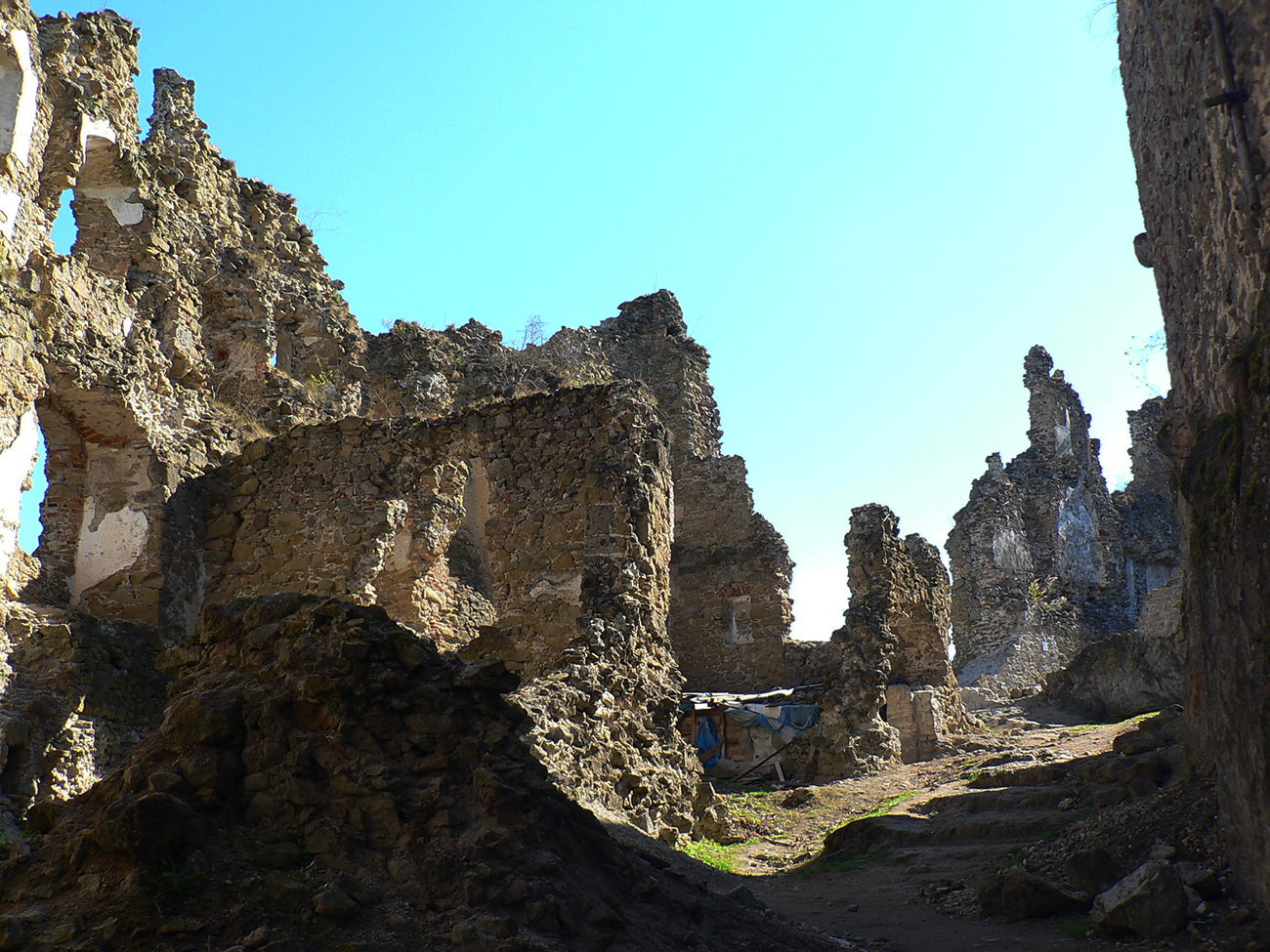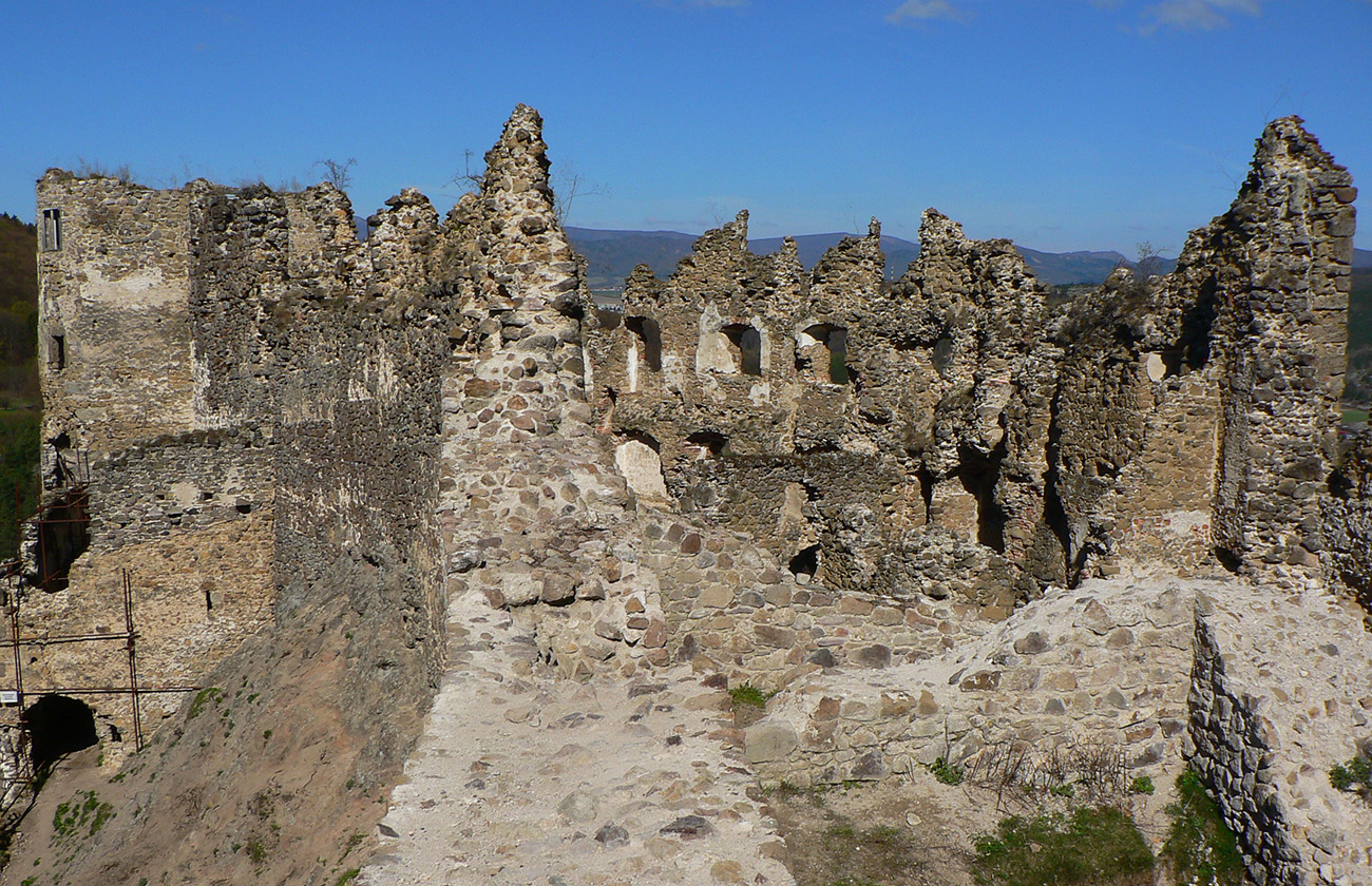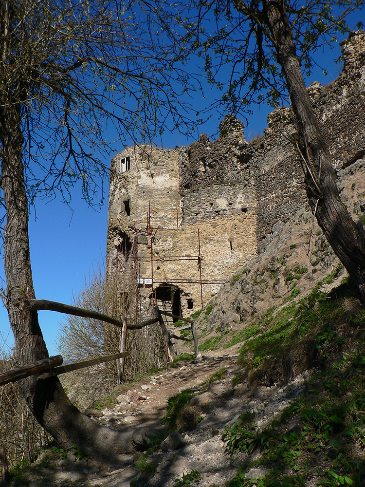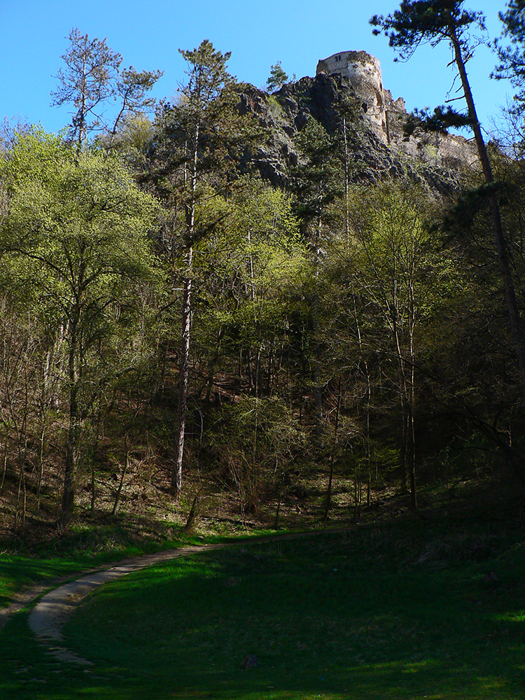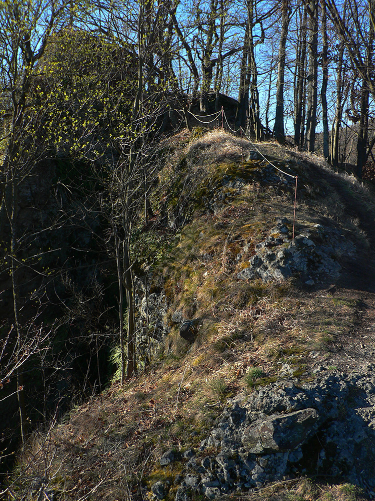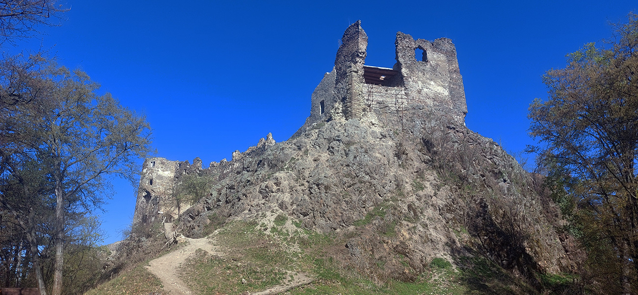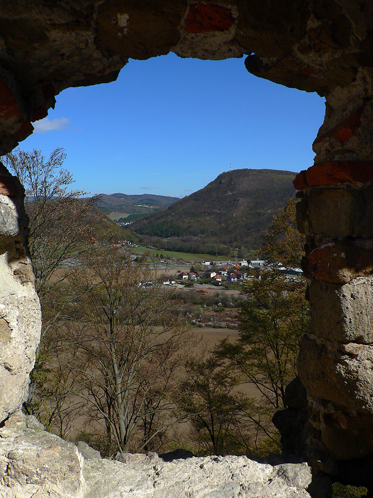 Príjemný hrebeňový chodník ma nato zniesol až k Šášovskému hradu. Začiatok tiež strmina, ale nie až taká brutálna ako z opačnej strany, potom príjemná klesavosť, s občasnými pohľadmi cez rúbane na sever. Hrad v ostrom, rannom svetle pekne vynikol, pohľady z neho najmä na hučiacu megakrižovatku R1 a okolie.