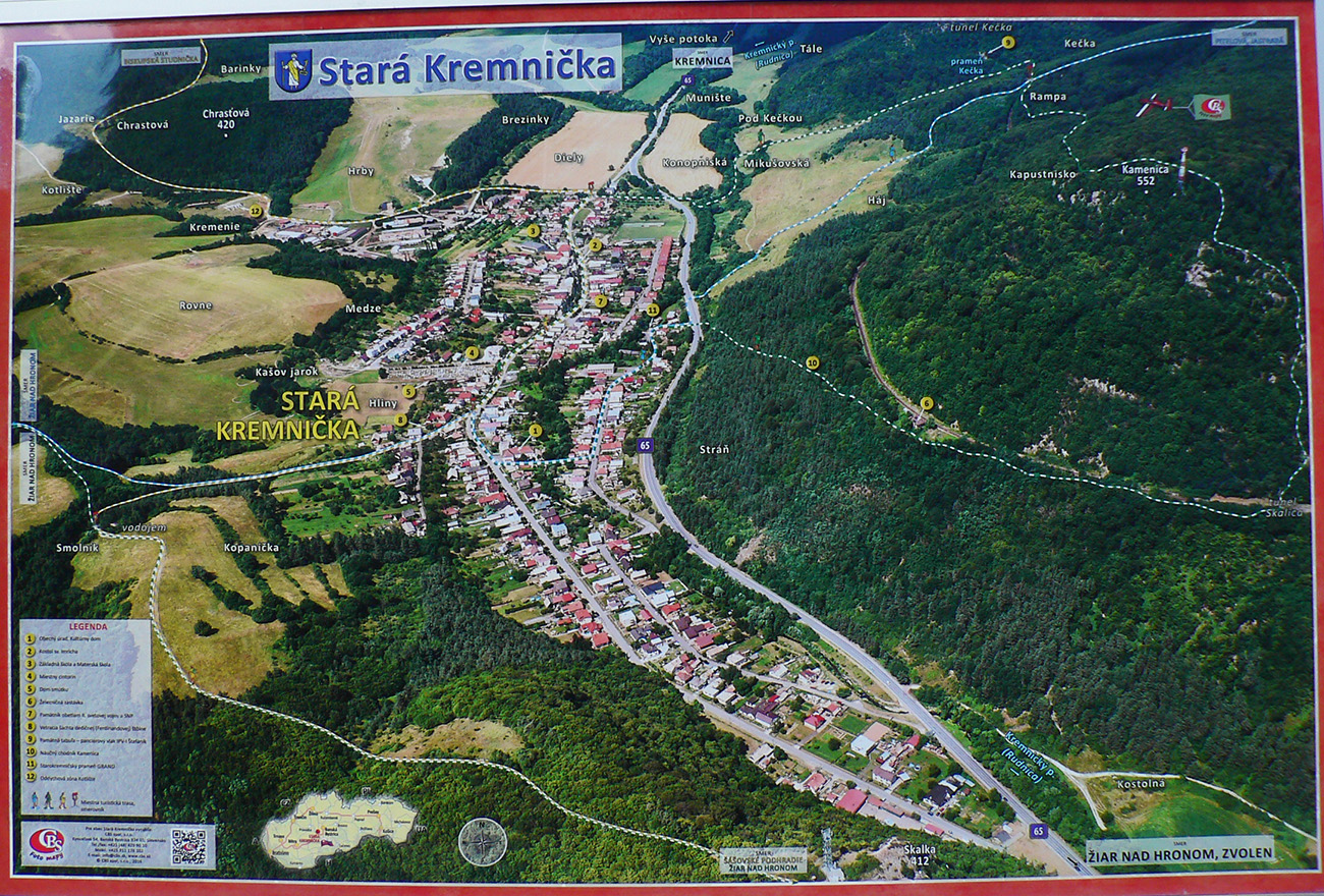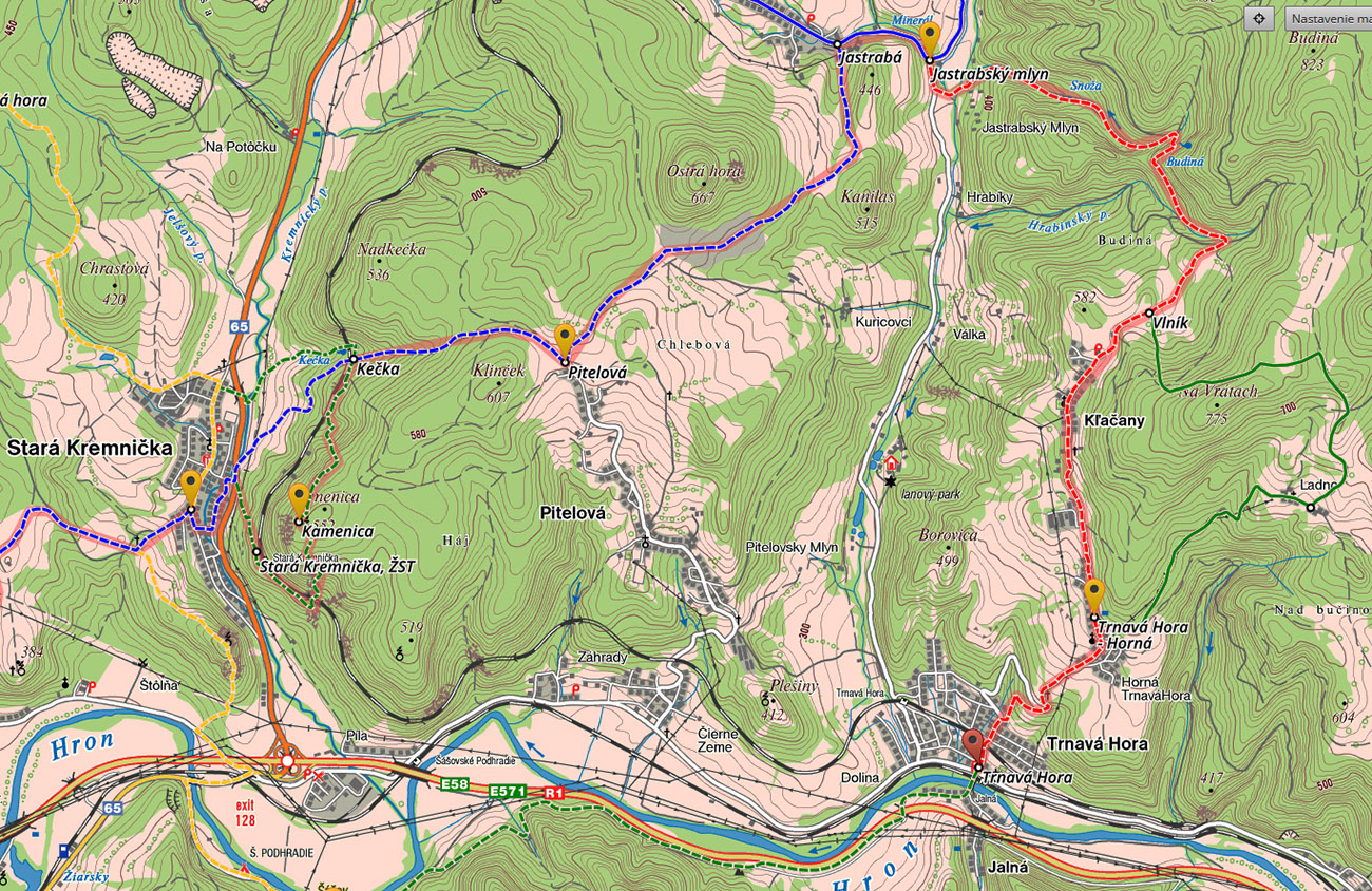 Do Podhradia som sa od hradu zgúľal rýchlo. Štiavnické vrchy vybavené, bolo treba „preasfaltovať sa“ do Kremnických. Popri Hrone ešte fajn, ale potom ten kultúrny šok, ktorý zažívali rútiaci sa šoféri, keď videli to cudzie, divne sa klátiace teleso posúvať sa po krajnici... No ale vedie tade tá žltá miestna značka a inej cesty niet. Miestne značky, to bola ďalšia špecialitka druhej časti trasy, lebo až do konca len po nich som išiel. A vieme ako „výborne“ sú niekde značené, tak oči až do cieľa boli „v pozore“. A okrem nich aj mapy, lebo som s úžasom zistil, že na Mape.cz niektoré nie sú a dokonca ani cesty, po ktorých vedú – čo som bol teda dvojnásobne prekvapený. Preto som si radšej ešte doma vyrobil pomôcku z Turistickej mapy (https://mapy.dennikn.sk/), takúto:
