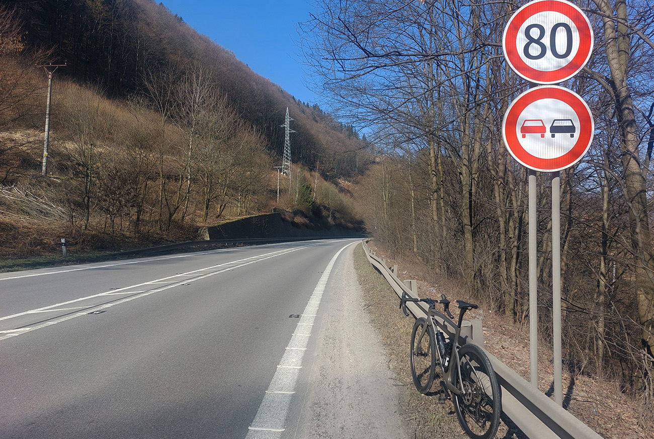 Špinavá krajnica (hádam len dočasne), vrúbkovaná biela čiara a odrazky v asfalte (furt) síce nepridávajú na komforte jazdy a na možnostiach prípadného uhýbania, ale aj tak miesta dosť, autá ani nemusia smerovkami blikať, obídu cyklistu vo svojom pruhu. Samozrejme, že jeden trúbiaci bezmozog sa našiel, ale na to už som zvyknutý.