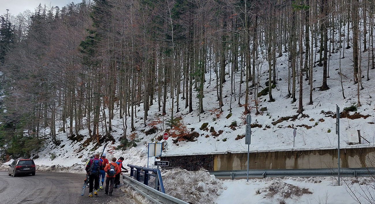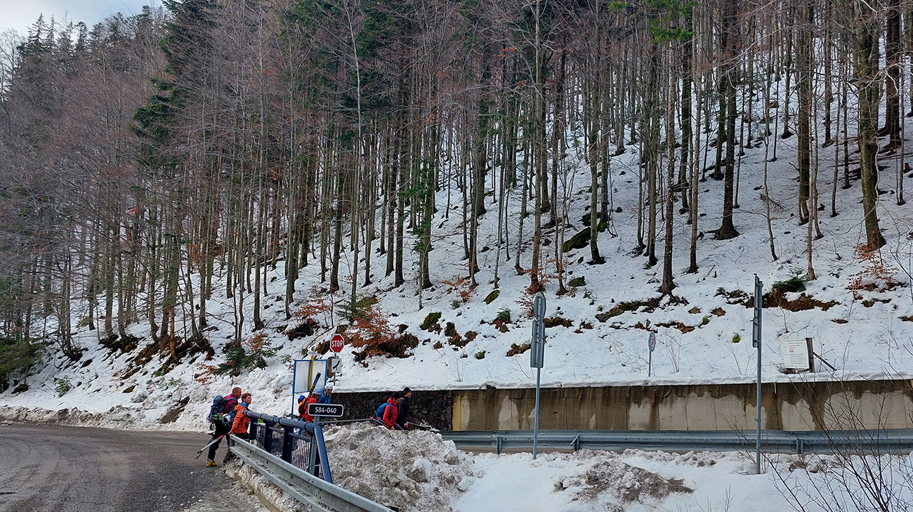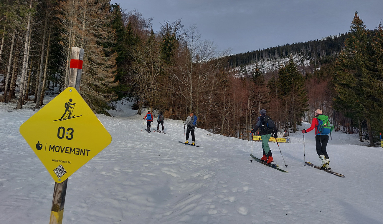 Kto prv príde, menej platí, takže na začiatok sme ešte vychytali jedno z posledných bezplatných parkovacích miest pri ceste, pri odbočke hore na Krupovú. Inak hore za rampami je to za desať. Lakomosť je tu samozrejme odmenená možnosťou prejsť sa s lyžami na chrbte tých pár stoviek metrov za snehom po ceste, kde je teraz viac posypu ako toho snehu.