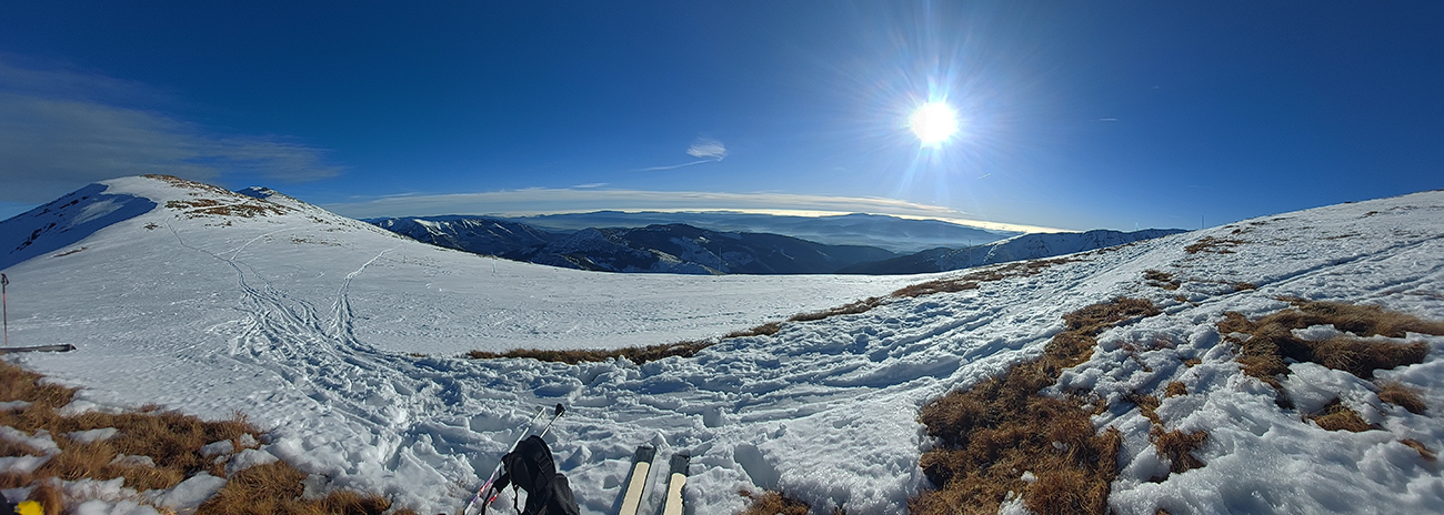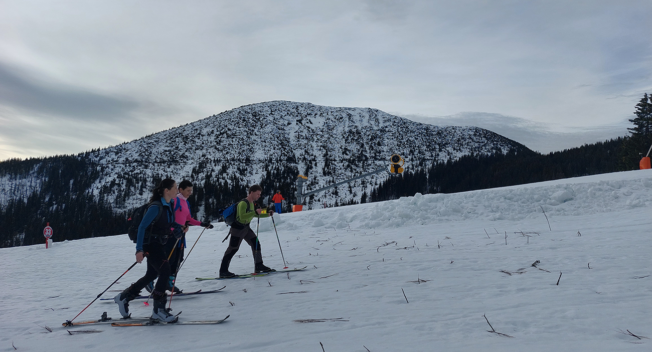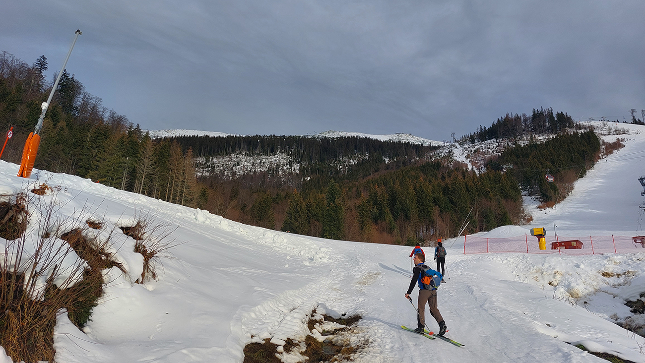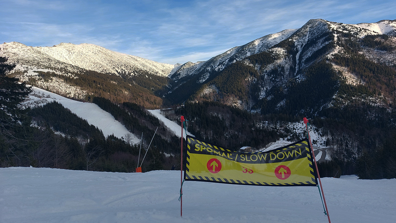 Len o kúsok vyššie „od úpätia“ sa vďaka rúbaniskám a priesekom zjazdoviek začali otvárať tie notoricky známe panoramatické výhľady – žiaľ teraz najmä na okolitú snehovú biedu. Dominovali tmavé farby a v diaľke na juhu Klenovský Vepor. Podklad mimo pisty sa zdal byť pevný, ale kto si trúfal vyskočiť z lyží, hneď bol po kolená zapadnutý do mokroty.