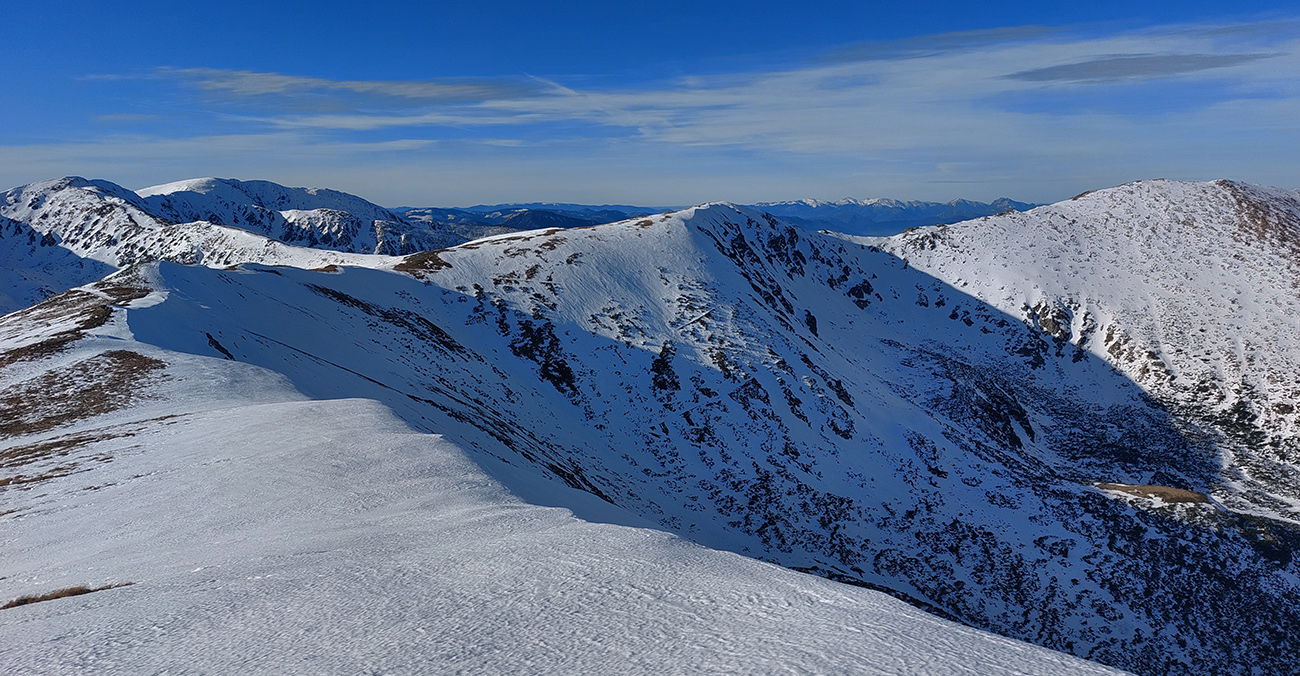 Do sedla sme ale nedošli, skončili sme pri pohľadoch k nemu z hrebeňových prevejov nad ním – len po okraji hrebeňa je to teraz relatívne pohodlné na poslednom úseku. Motali sa tam dole v tieni dvaja ľudkovia, stúpali hore, ktovie či to predtým aj zlyžovali. Dalo by sa, aj keď je tam ešte úzko a moc hlboko sa zjazdiť nedá. Povrch nič moc – kombinácia mokrého firnu a ľadovej kôrky, podľa pohľadov dole do Derešského kotla, z tých prevejov. Ale hrebeňovka smerom na Kotliská a ďalej by sa potiahnuť dala, hádam...