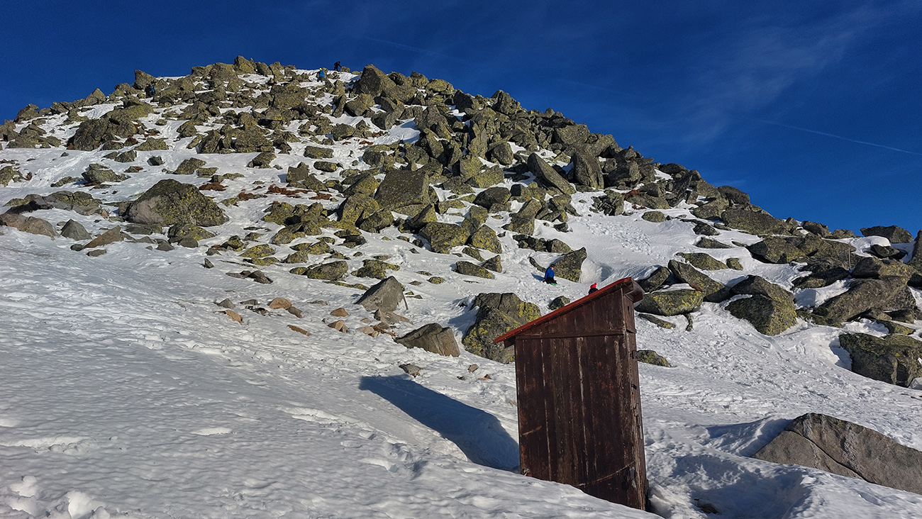 Ešte vyššie ešte teplejšie, a keď spoza riediny mrakov vyliezol Oskar, hic jak v júni. Pod nohami tiež prehnitá riedina - no fuj, už aby to zamrzlo. Vycikcakovali sme pod Dereše, až ku hornej stanici vleku. Ale nie úplne po výstupovej – lebo ako začala na úzkej piste hustnúť premávka, ušli sme radšej medzi šutre a kosovku štrikovať. Miesta už dosť a neprepadávali sme sa, zatiaľ.